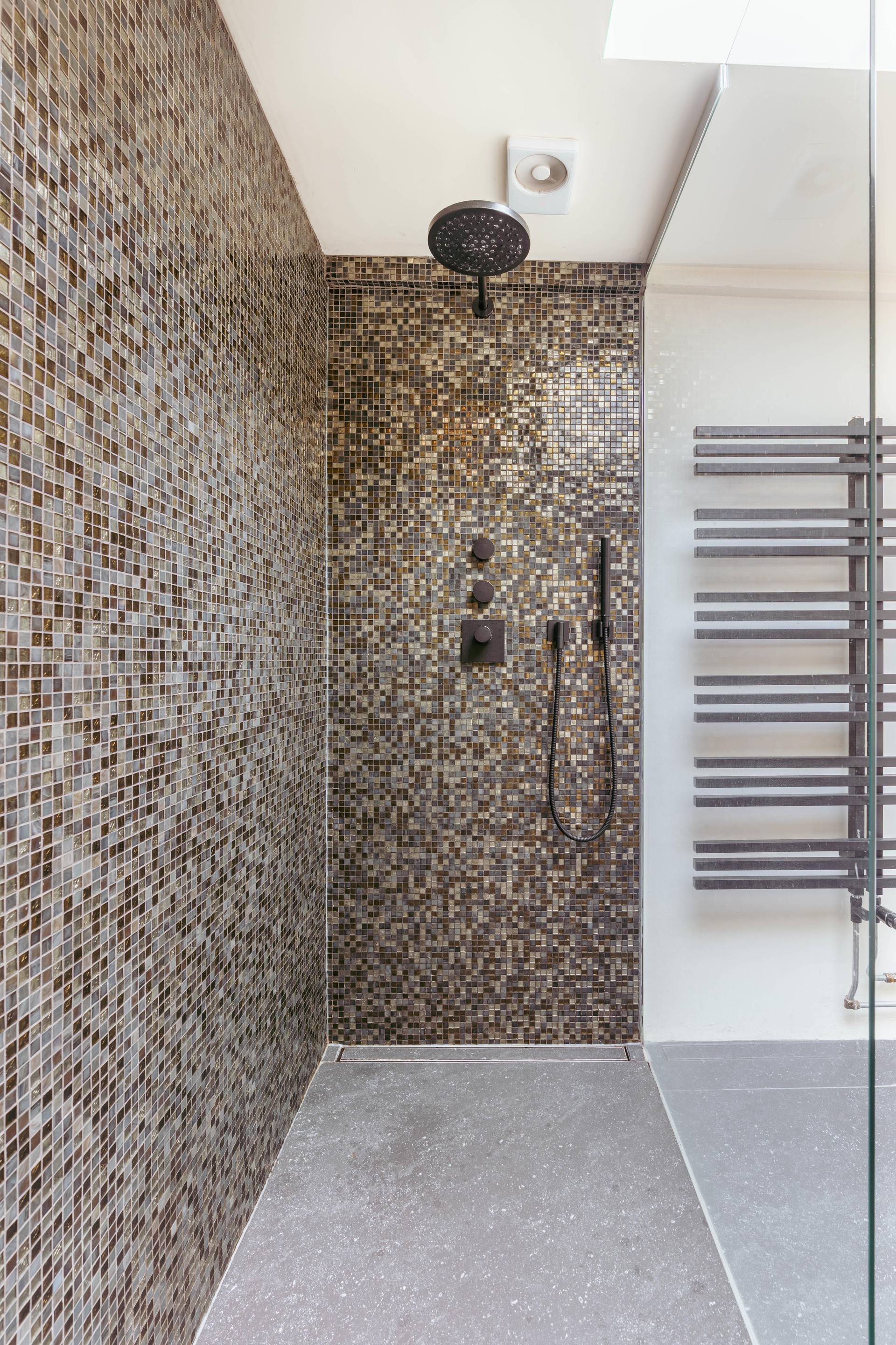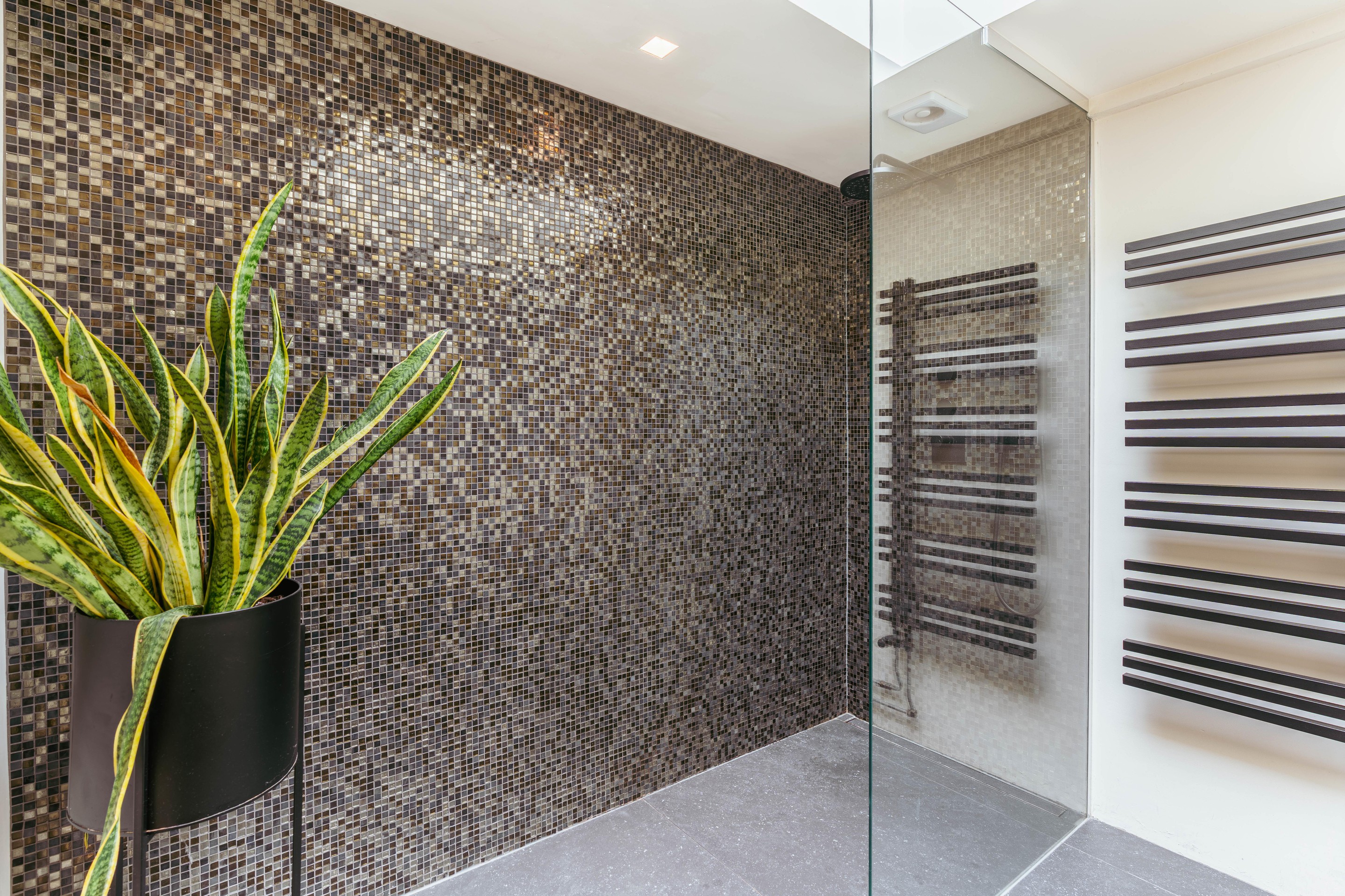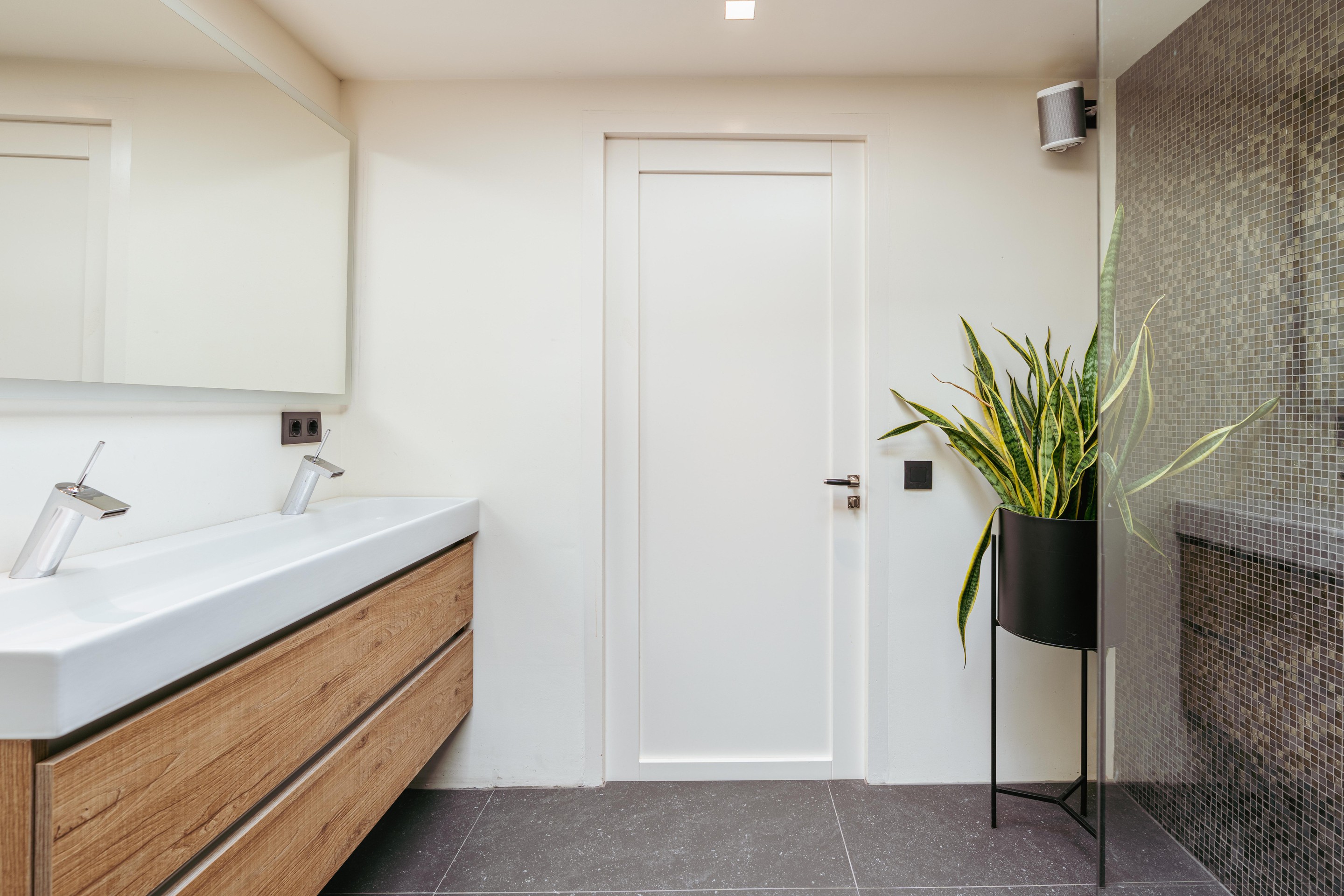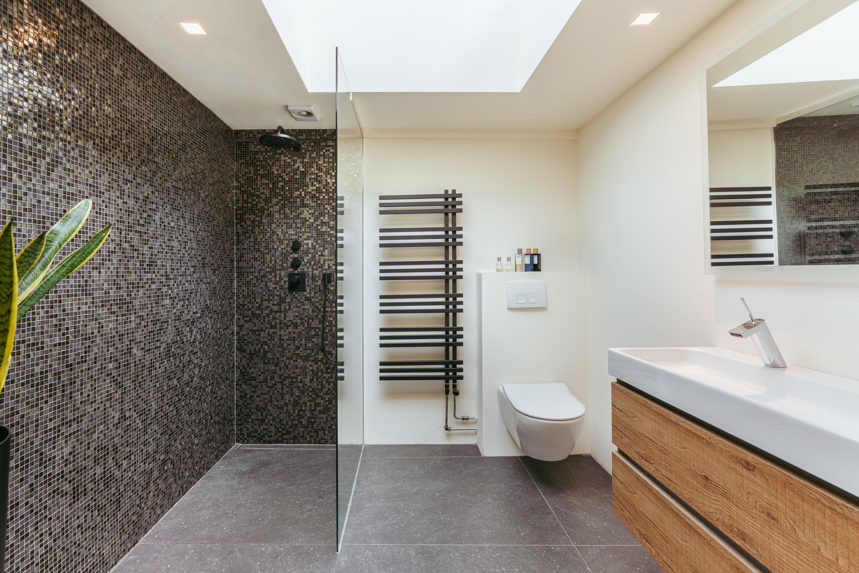 Centrally positioned, the large bathroom features a double washbasin, walk-in shower, toilet, and enjoys beautiful natural light from the rooftop terrace above — providing the perfect start to the day.