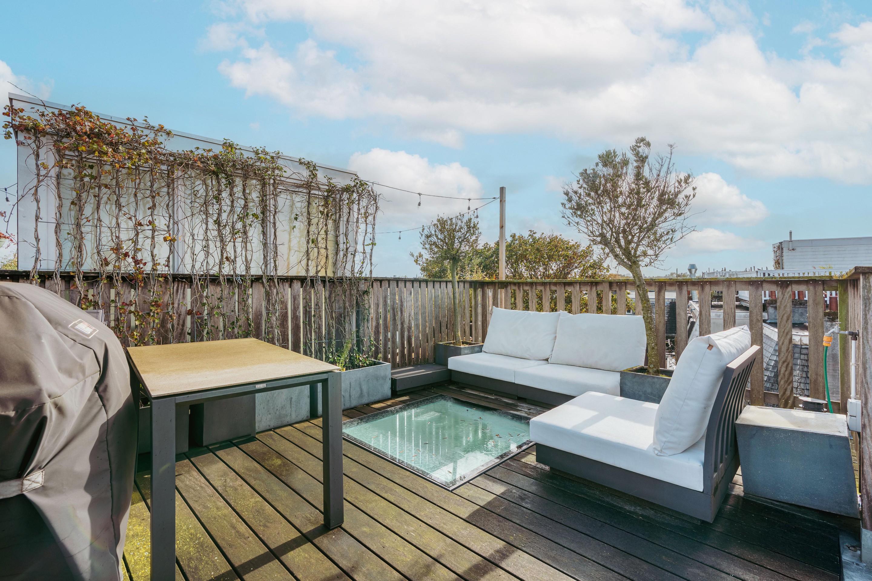 A fixed staircase leads to the sunny rooftop terrace — a wonderful place to enjoy the sun throughout the day or to unwind with friends under the stars in the evening.
