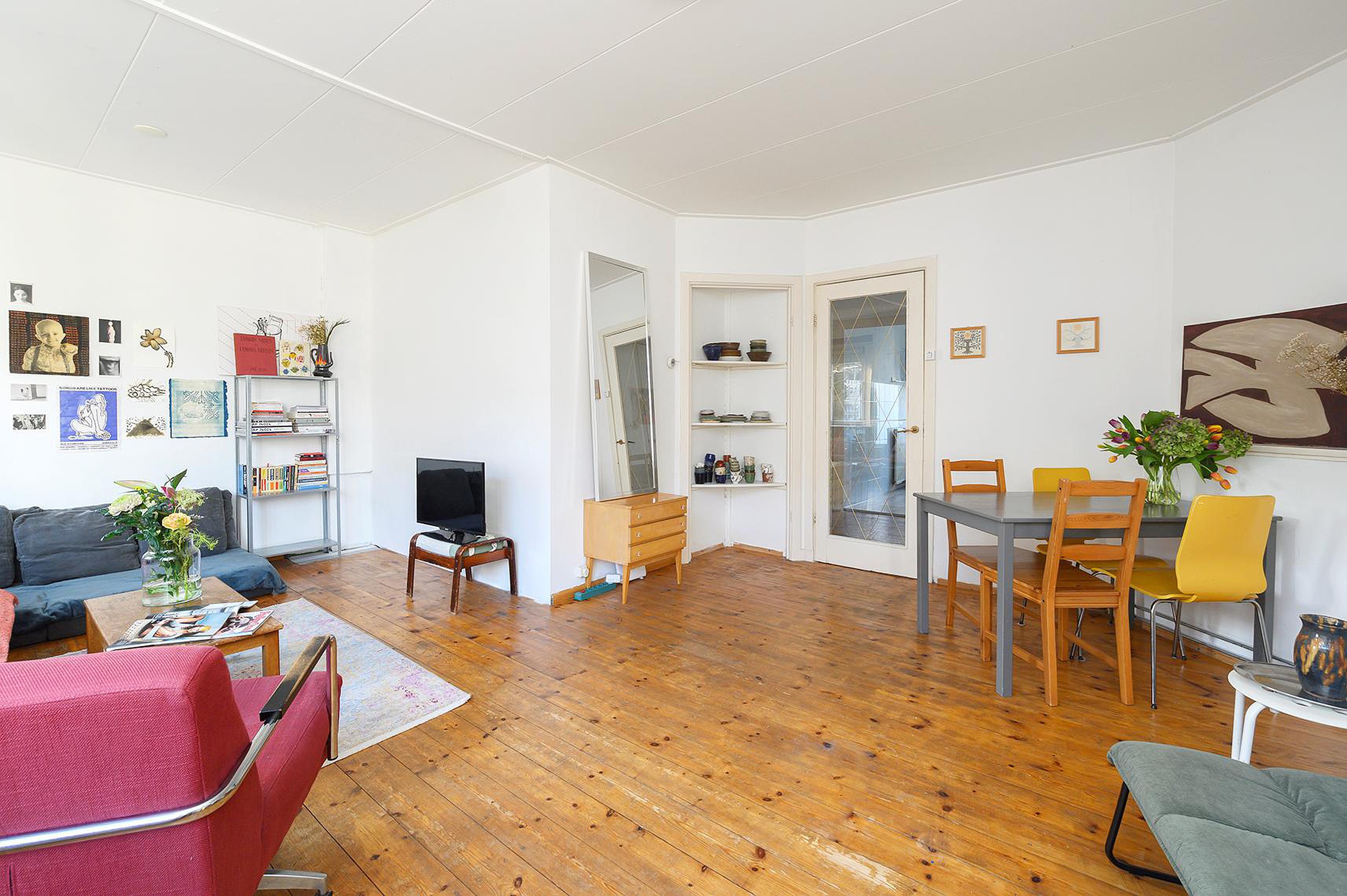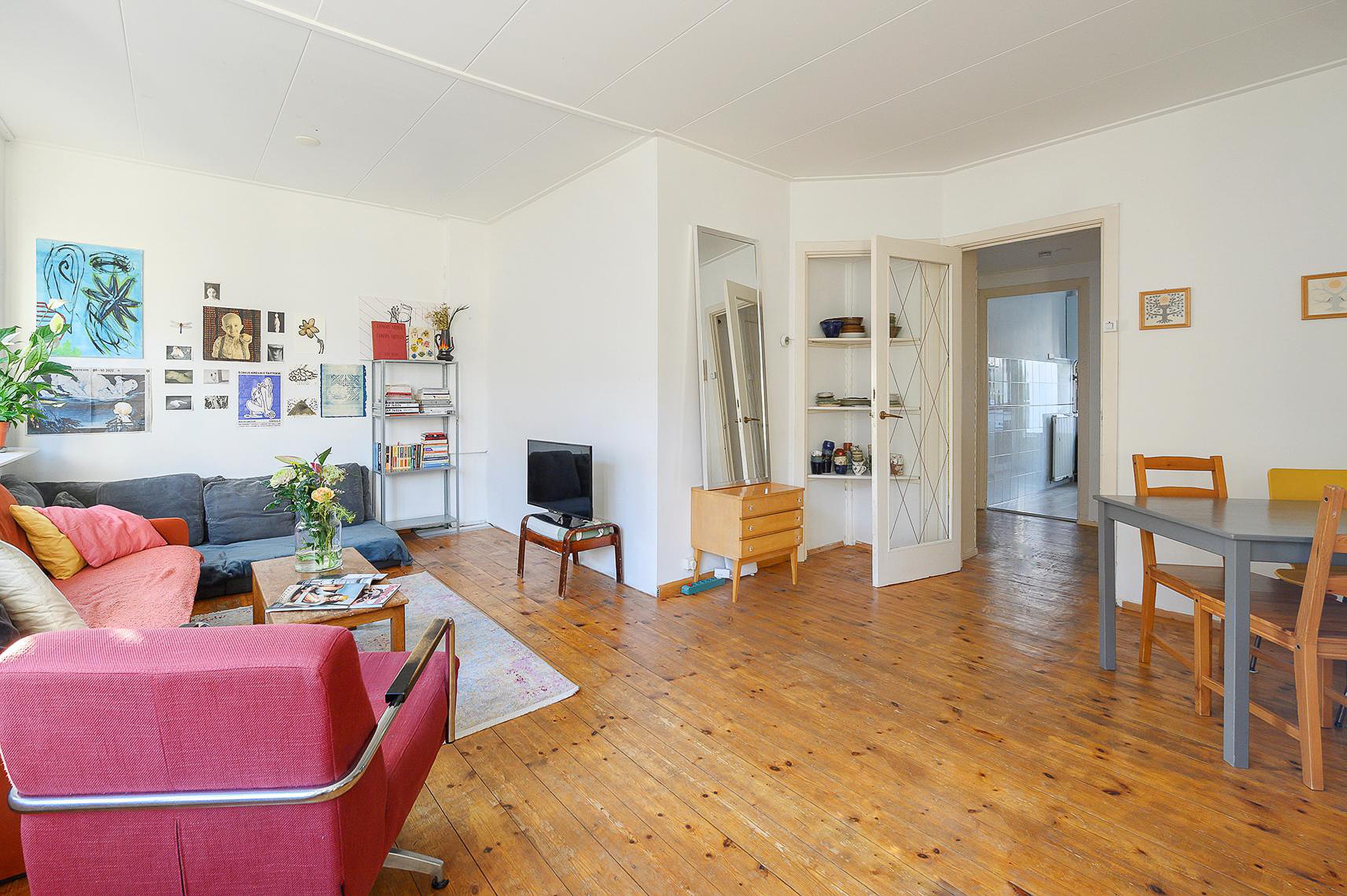 The bright living room, located at the front, is the heart of the apartment and offers enough space for both a comfortable sitting area and a dining area.