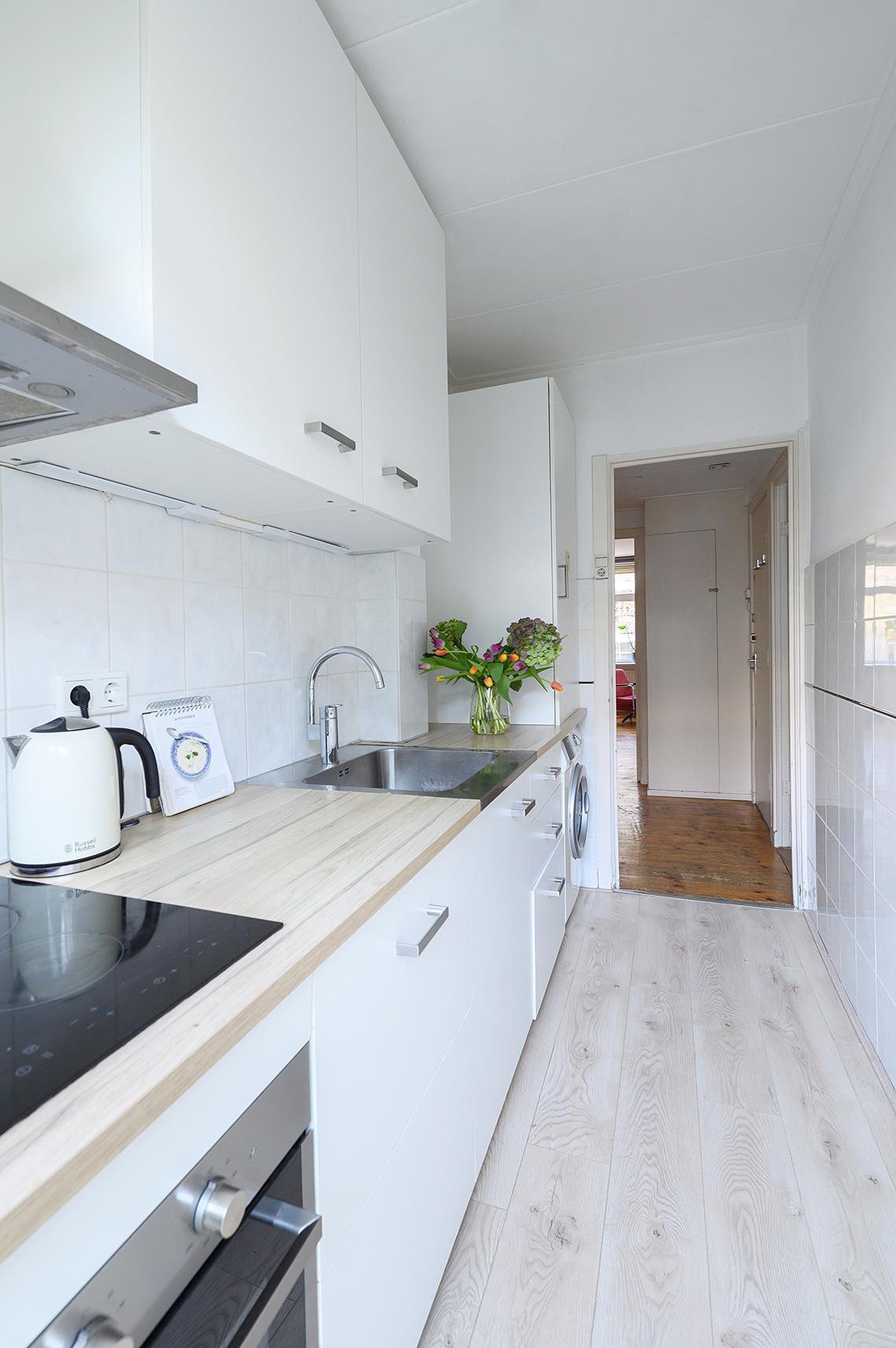 Details Keuken (2019): moderne keuken, voorzien van witte onder- en bovenkastjes, een aanrechtblad in houtlook in een lichte kleurstelling met RVS spoelbak. De keuken is voorzien van diverse apparatuur, te weten; keramische kookplaat, hete lucht oven, koelkast, RVS afzuigkap en vaatwasmachine.