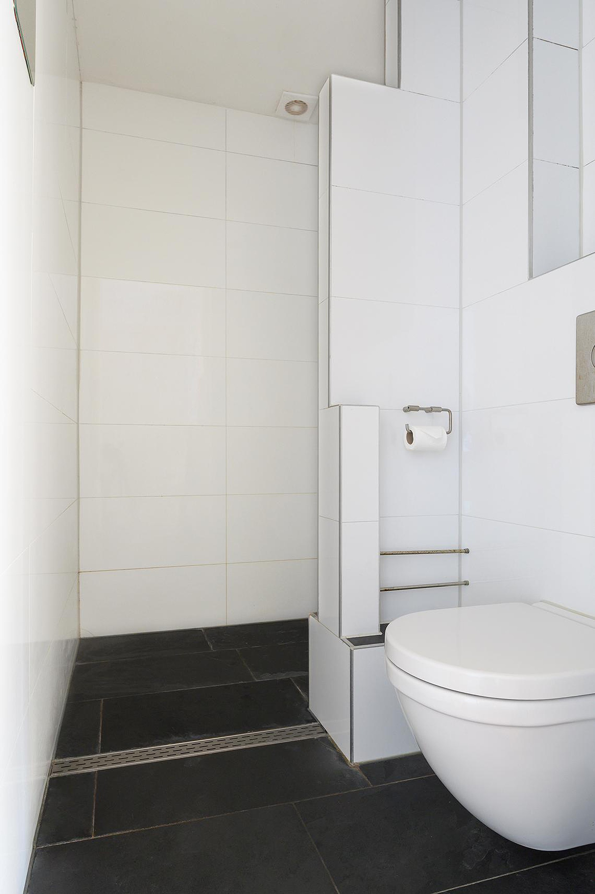 Badkamer (2008): nette badkamer, voorzien van douche en toilet. De wanden zijn tot aan het plafond betegeld met grote witte wandtegels. Op de vloer zijn grote zwarte tegels aangebracht.
