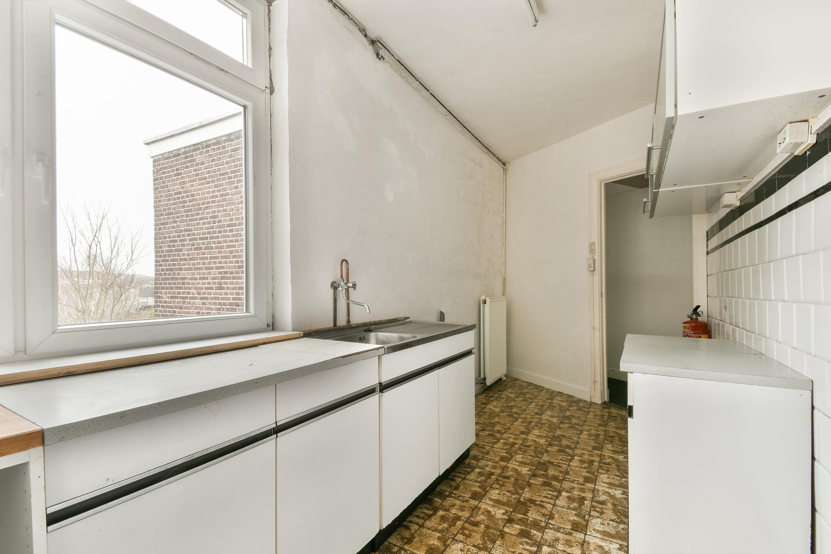 De keuken is eenvoudig uitgevoerd en beschikt over de aansluitingen voor de wasmachine. Ook deze ruimte biedt volop mogelijkheden voor modernisering en herinrichting. De badkamer is eenvoudig en voorzien van een douche, wastafel en toilet.