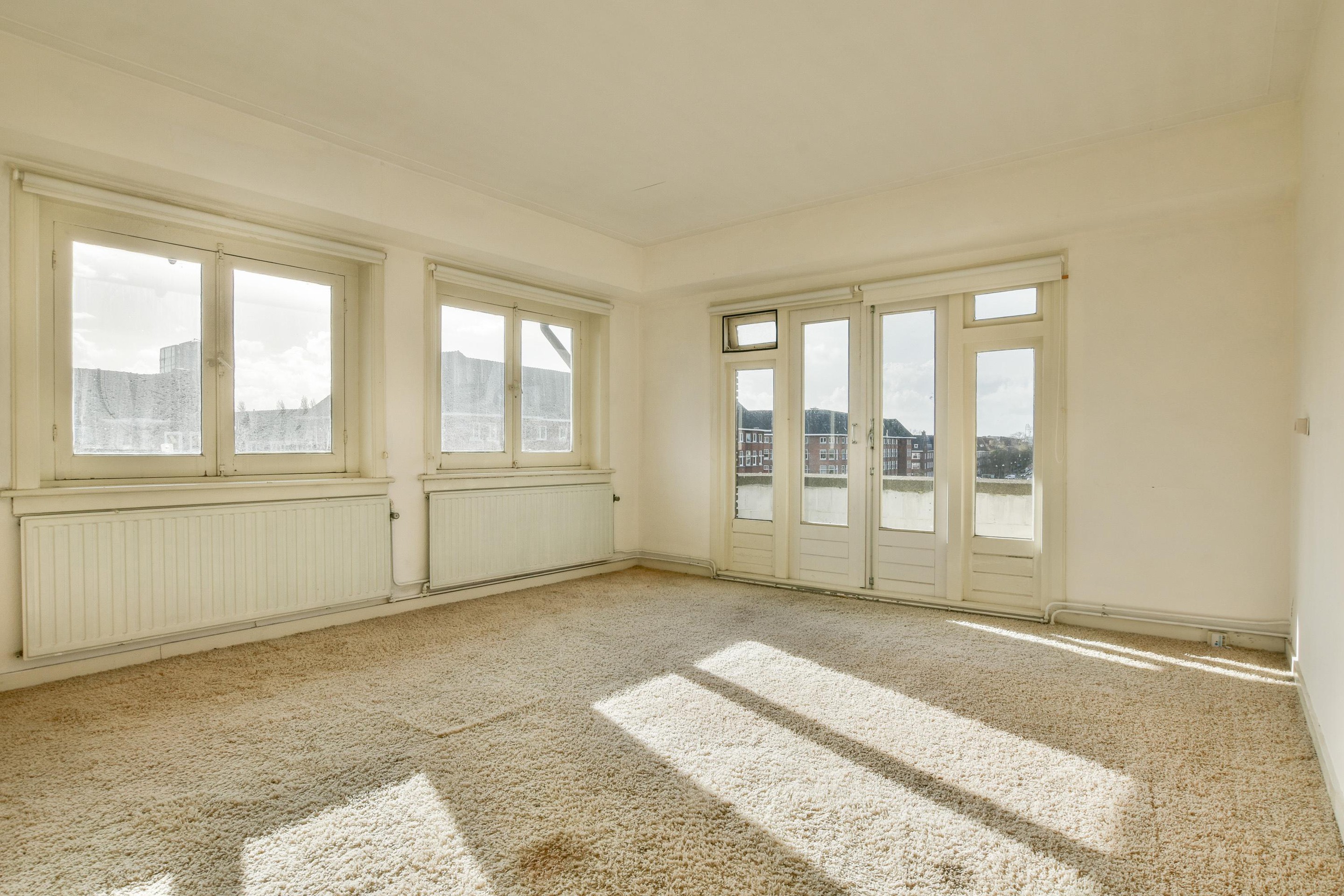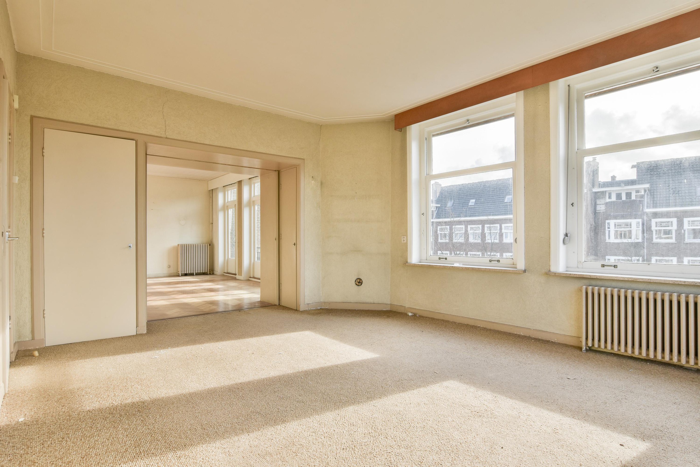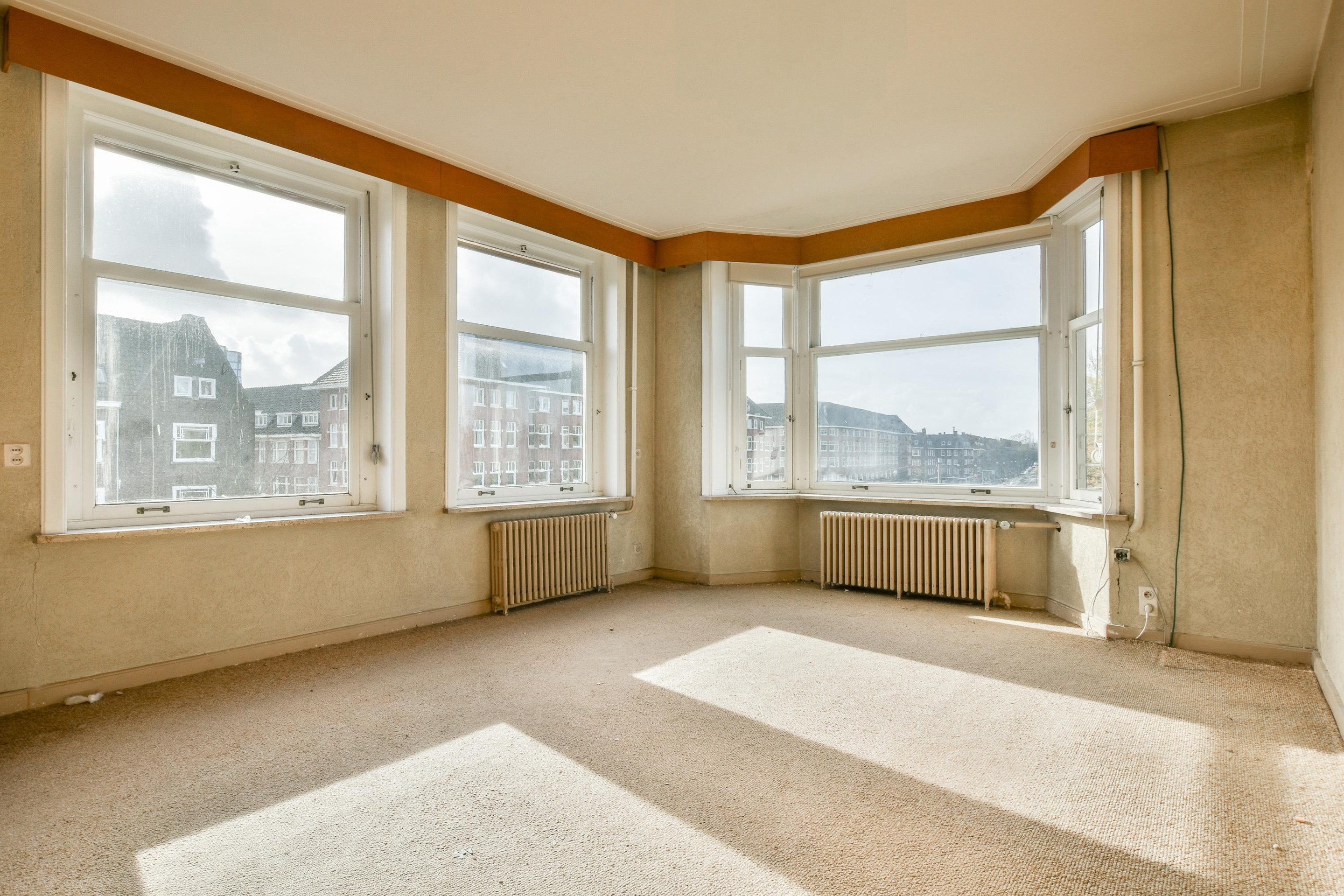 Aan de voorzijde bevindt zich de royale woonkamer en-suite, die zich uitstrekt over de volle diepte van de woning. De woonkamer beschikt aan de hoekzijde over een sfeervolle erker, waardoor de ruimte baadt in licht en een panoramisch uitzicht biedt over het Olympiaplein.