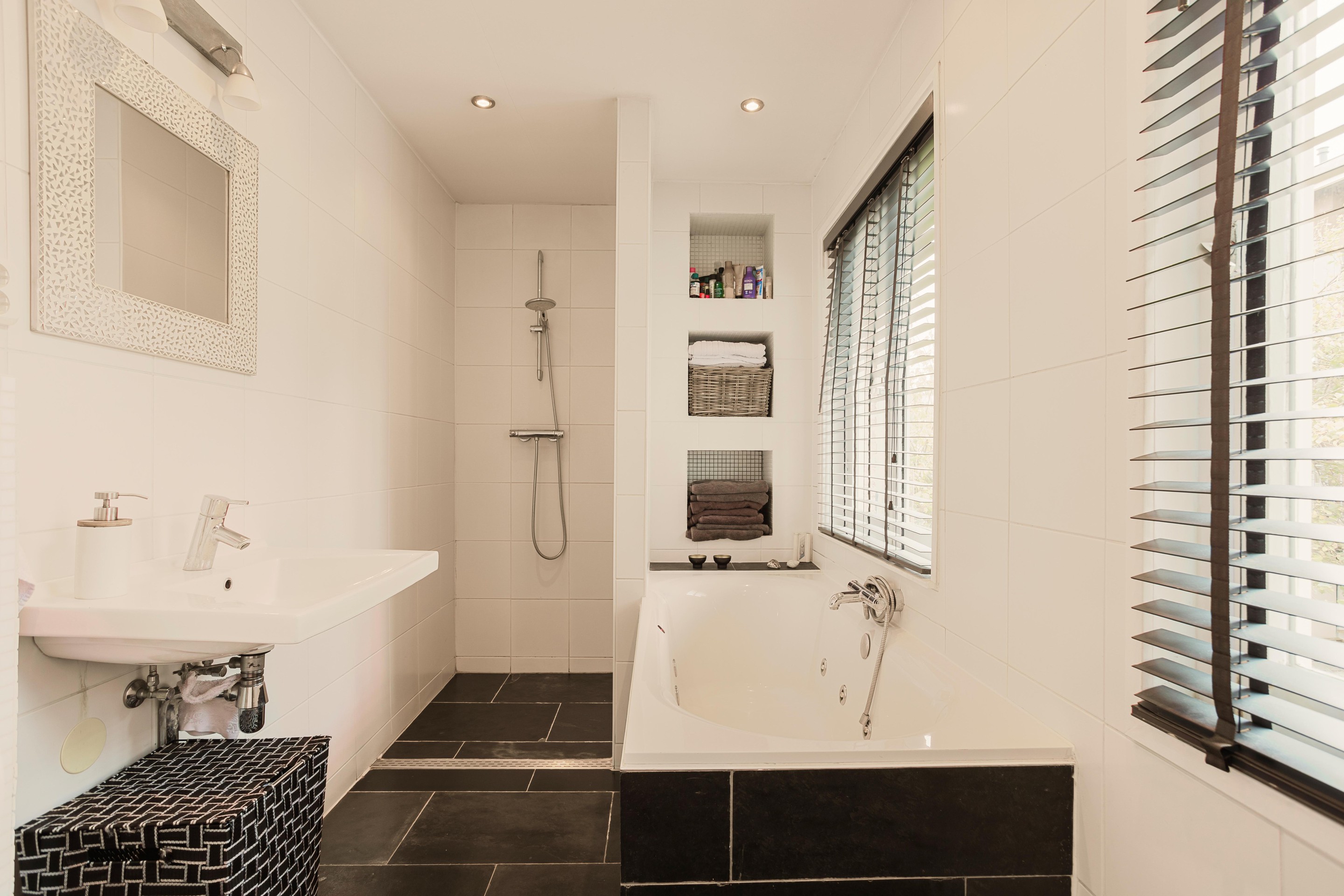 Aan de achterzijde van de woning is er een ruime zeer verzorgde badkamer met jet