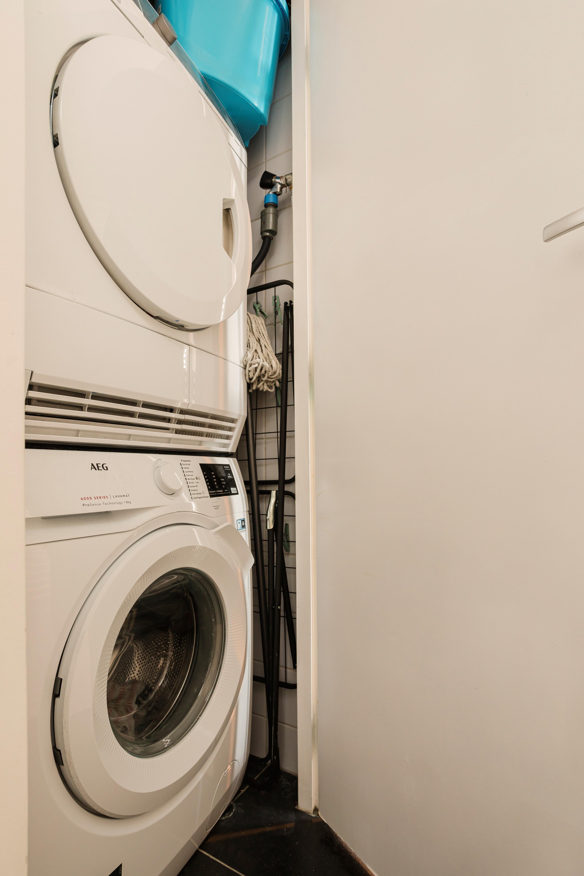 wasmachine en droger. De vloer is van massief eiken houten