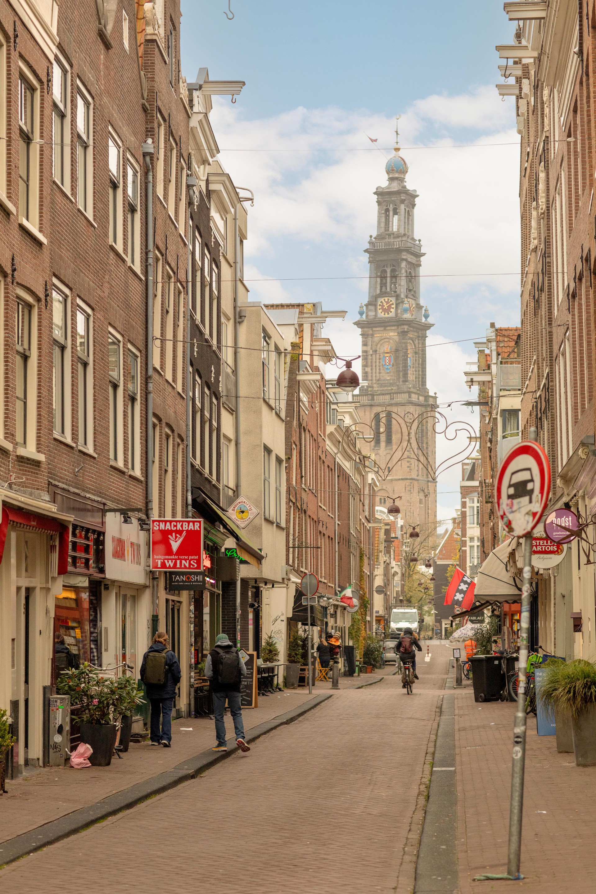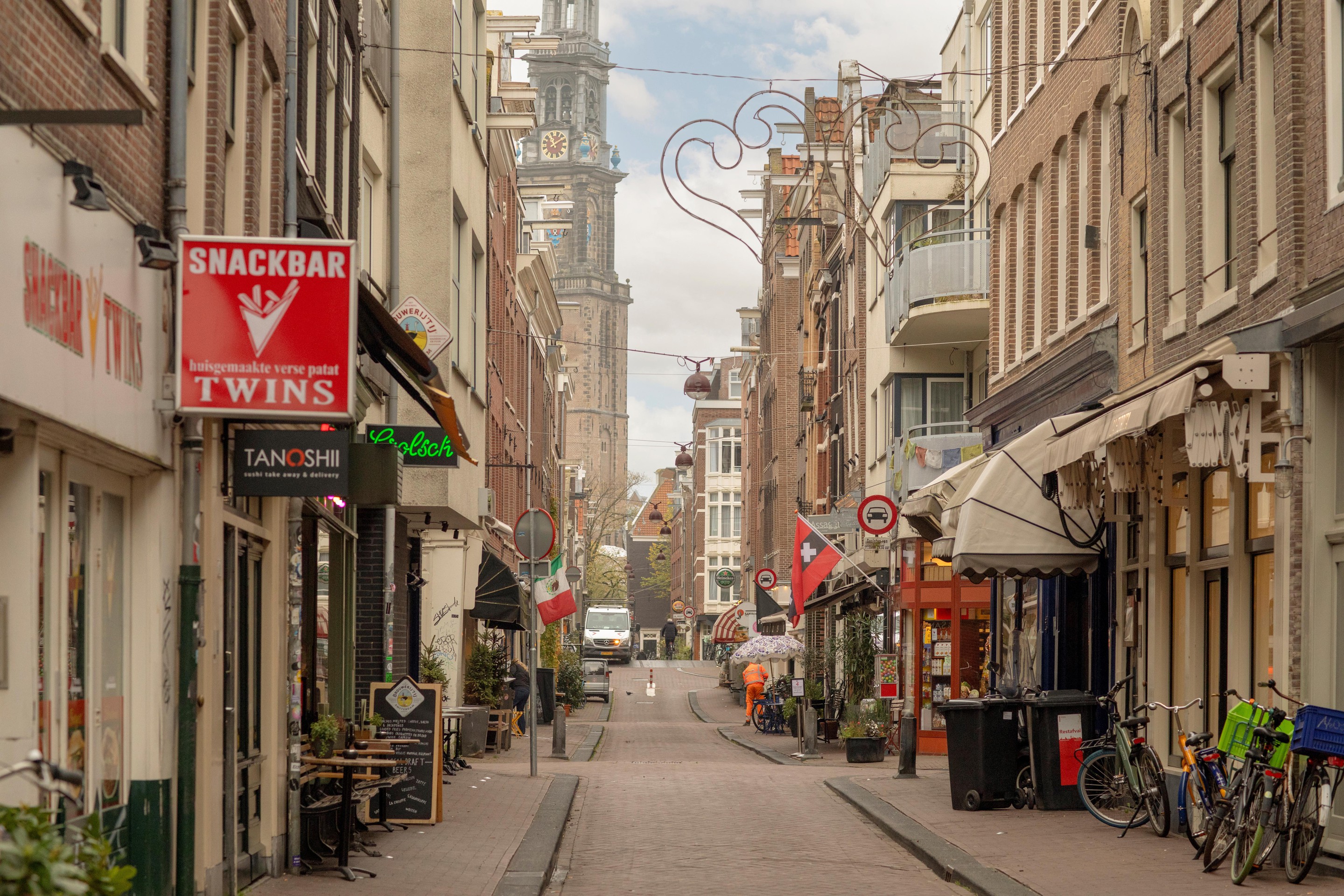 zicht op de Westertoren, meer Jordaan wordt het niet. De straat heeft vele leuke