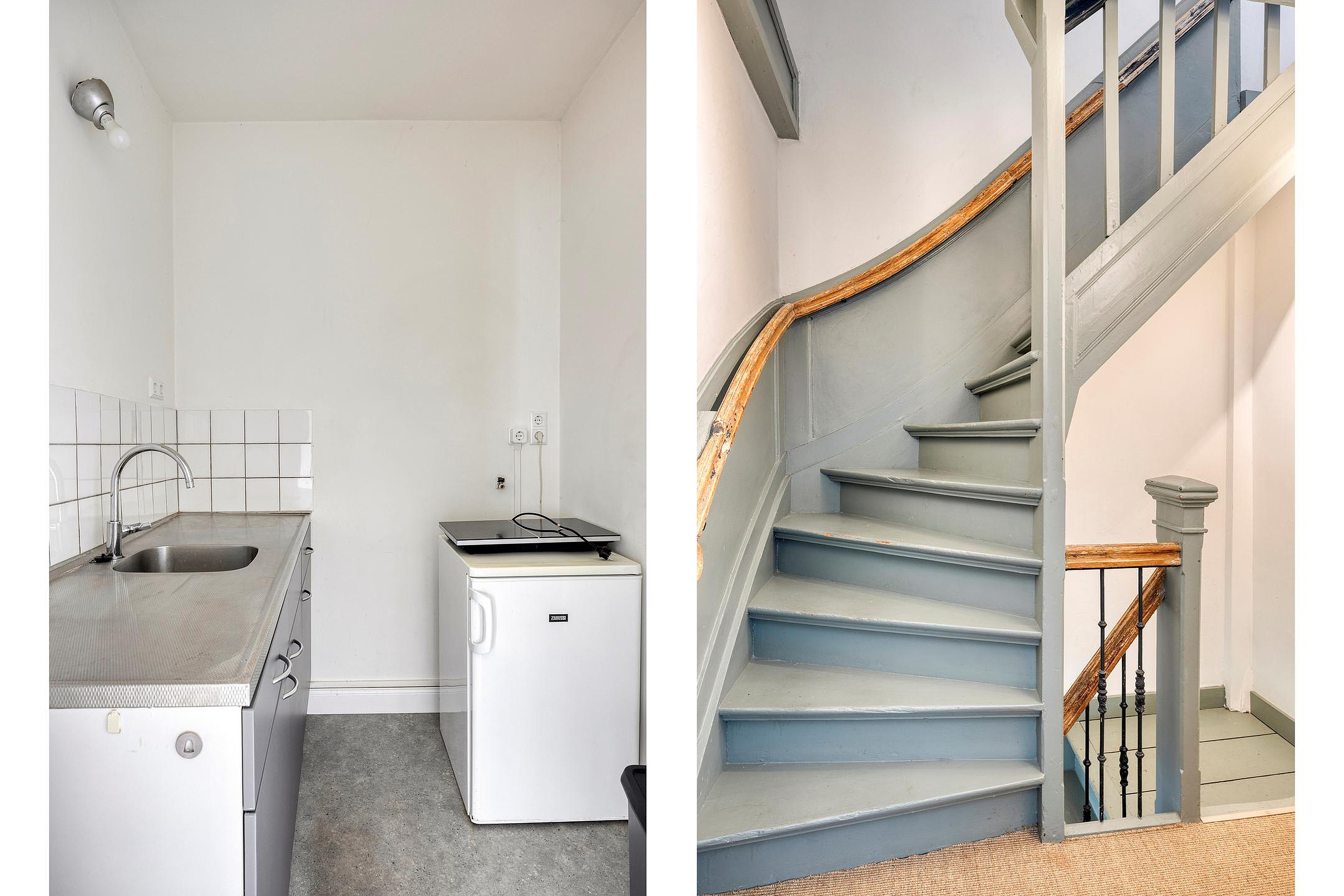 Via de fraaie entree met authentieke trapopgang betreedt u de woning, die zich uitstrekt over drie verdiepingen op de tweede, derde en vierde etage. Elke verdieping beschikt over een eigen woonkamer, slaapkamer en eenvoudige keuken, waardoor het pand zich uitstekend leent voor verschillende woonvormen – denk aan werken aan huis, verhuur, of een royale stadswoning met meerdere leeflagen. De aanwezige badkamer is eenvoudig uitgevoerd en voorzien van een douche en toilet.