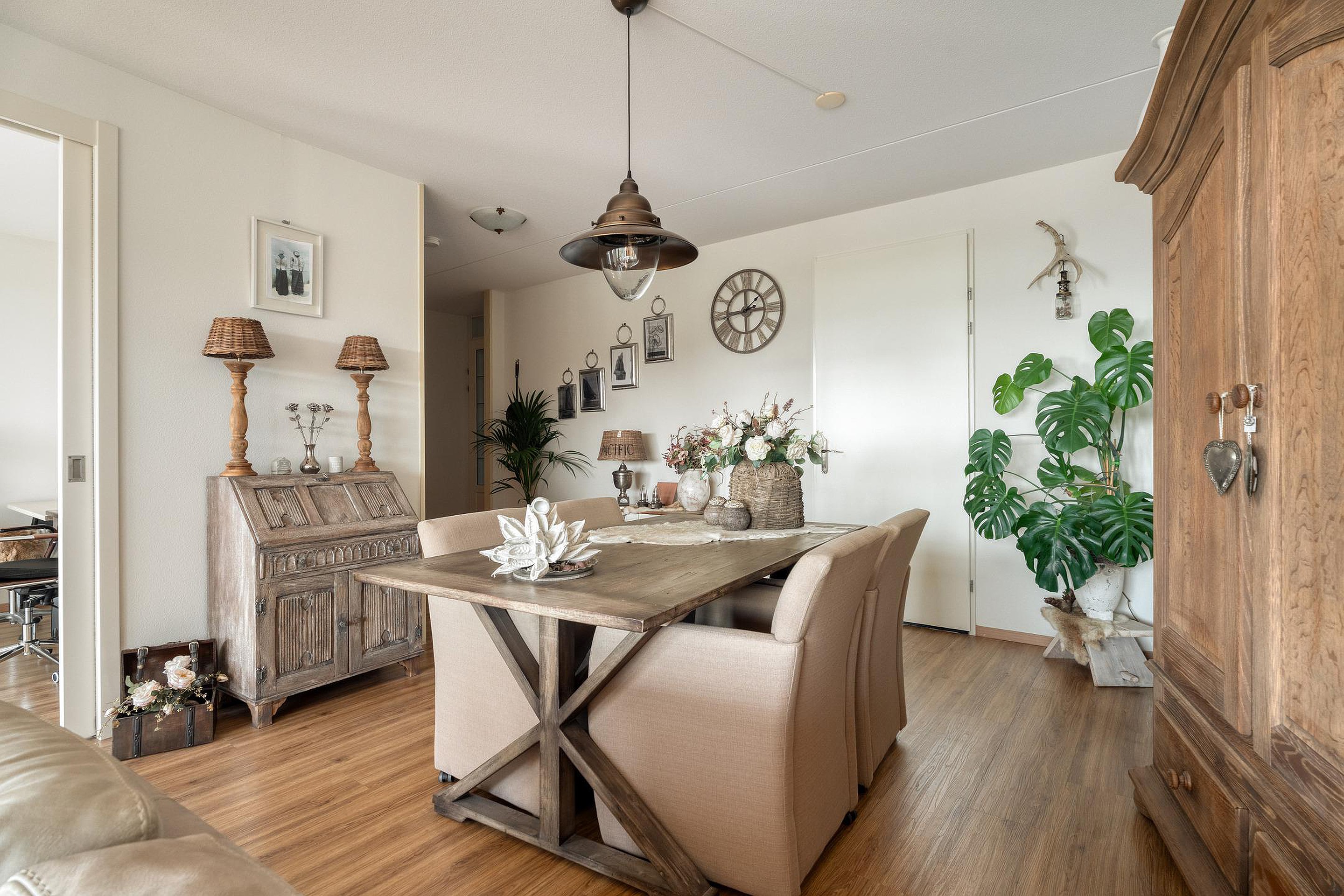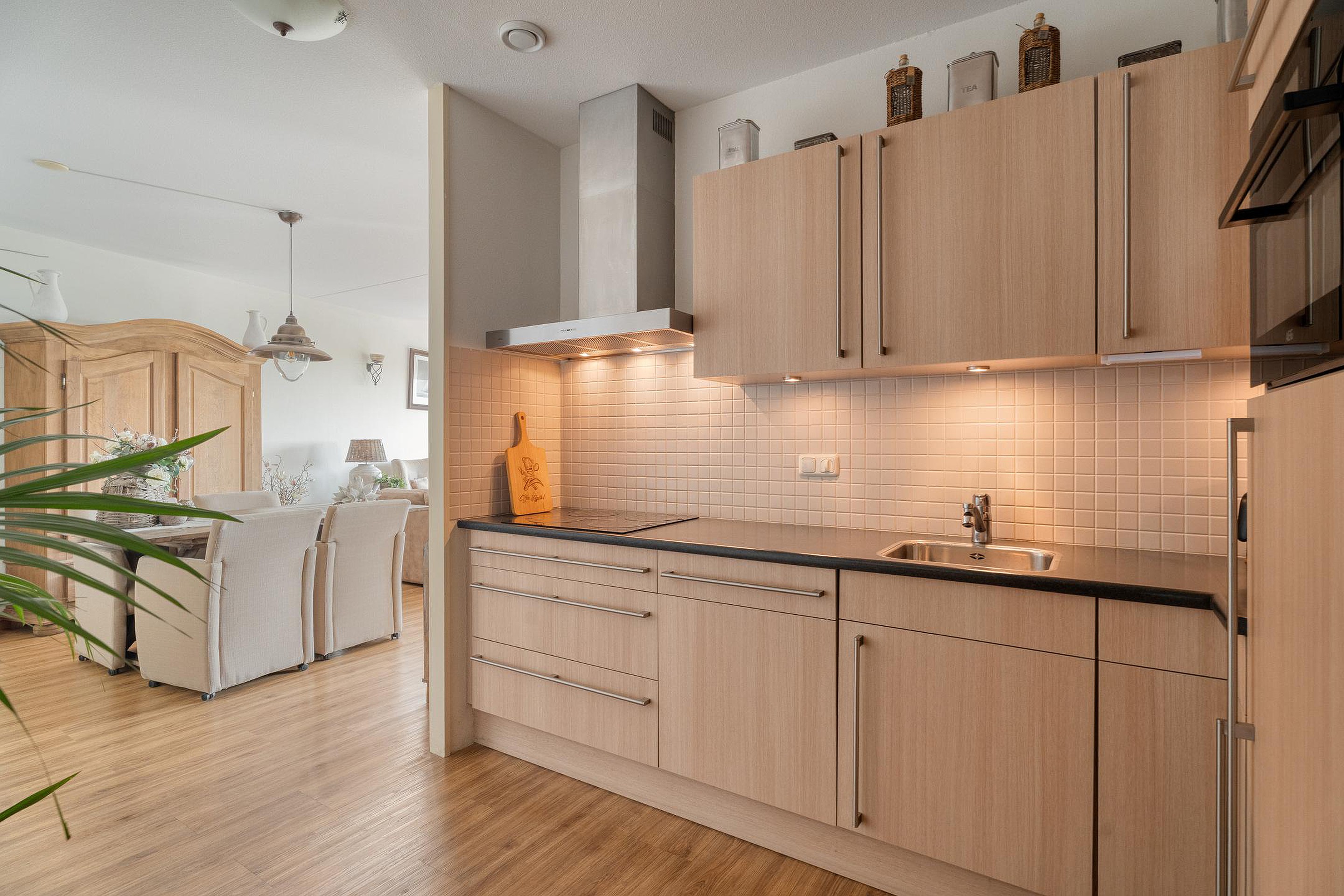 Aan de voorzijde van het appartement bevindt zich de lichte en speels ingedeelde woonkamer met voldoende ruimte voor zowel een zit- als eethoek. De aangrenzende open keuken staat in verbinding met de eetkamer en zorgt voor een prettige, open leefruimte.