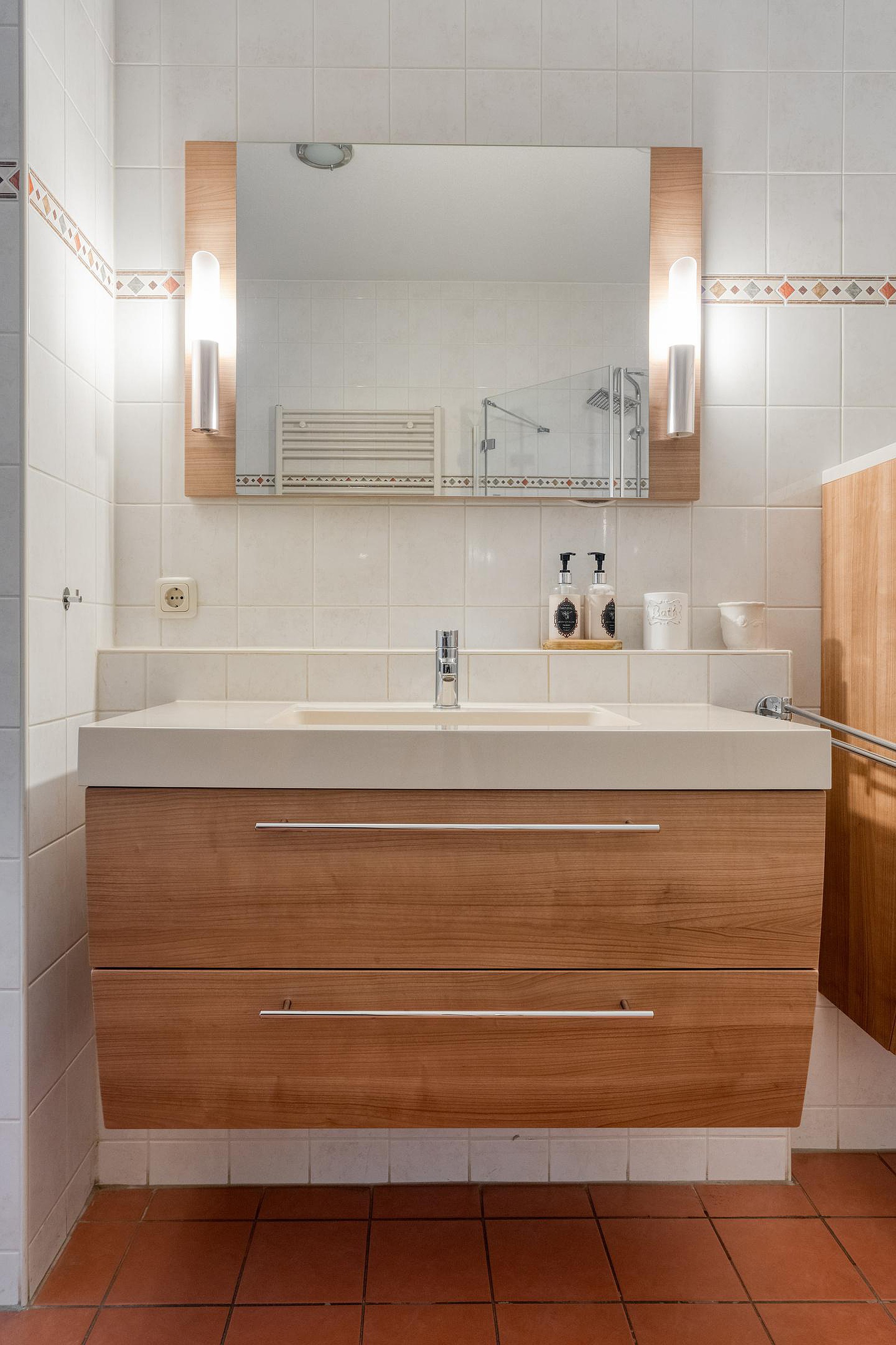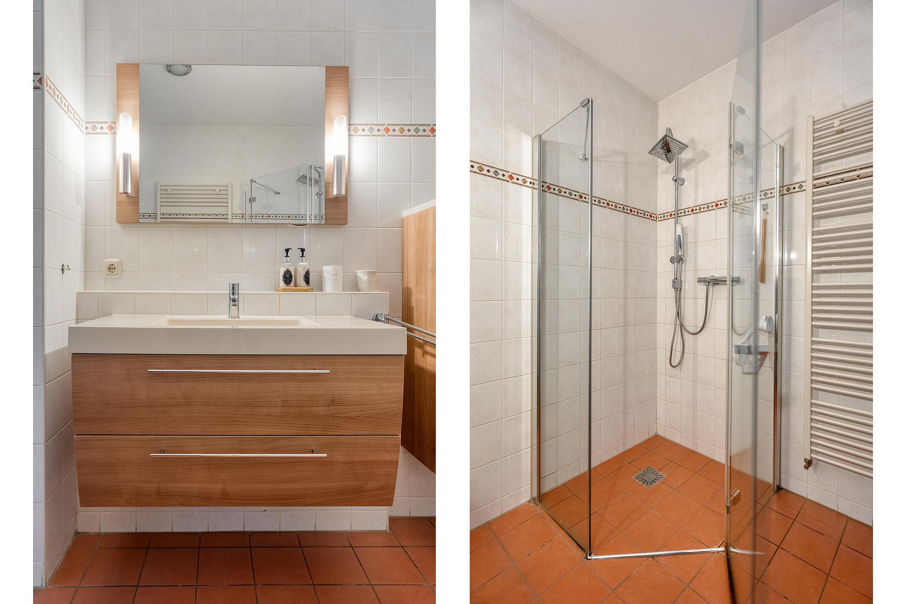 De badkamer is centraal gelegen en voorzien van een wastafel en douche. Daarnaast is er een inpandige berging, ideaal voor extra opslag en het plaatsen van de wasmachine.