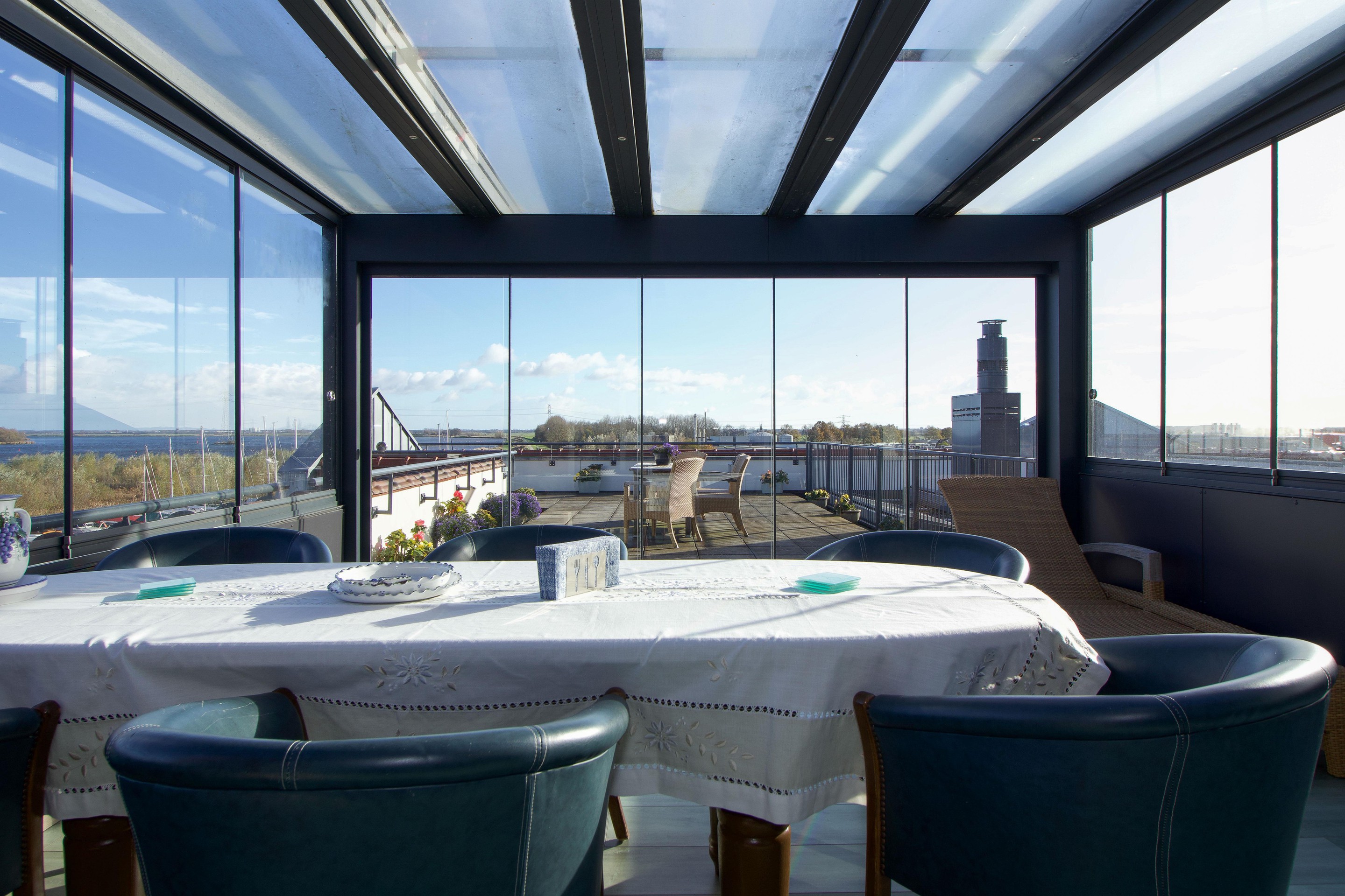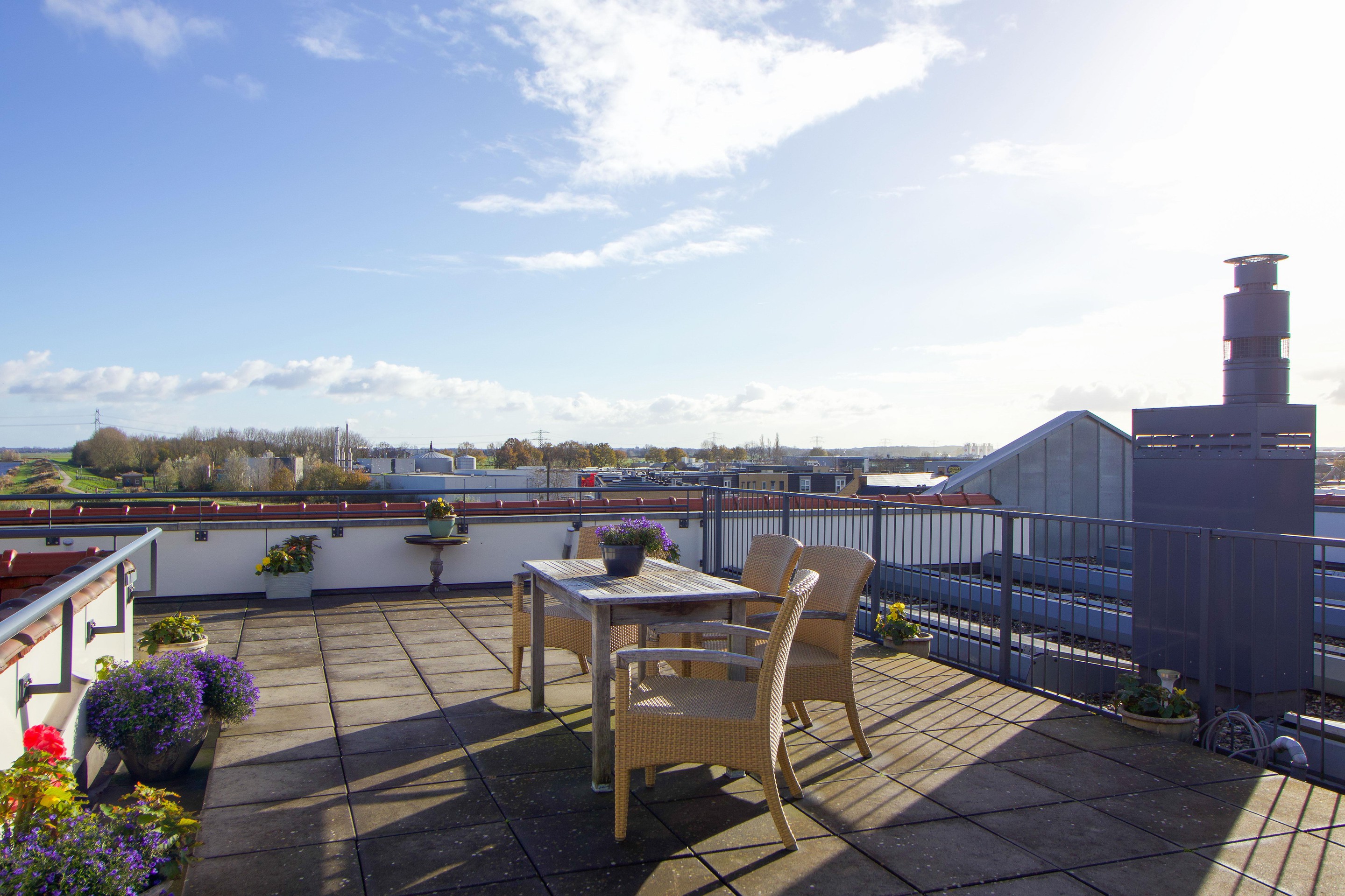 Aan de achterzijde van de woonkamer bevindt zich een sfeervolle serre, die dankzij de glazen wanden prachtig licht binnenlaat en kan dienen als extra zitkamer, eetkamer of werkruimte. Vanuit de serre heb je toegang tot het riante dakterras, dat volop mogelijkheden biedt voor loungeplekken, groenvoorziening of buiten dineren.