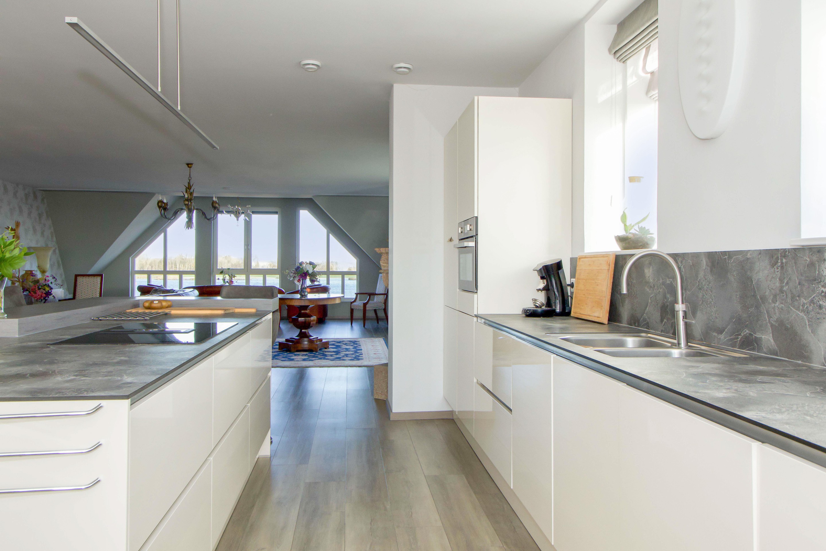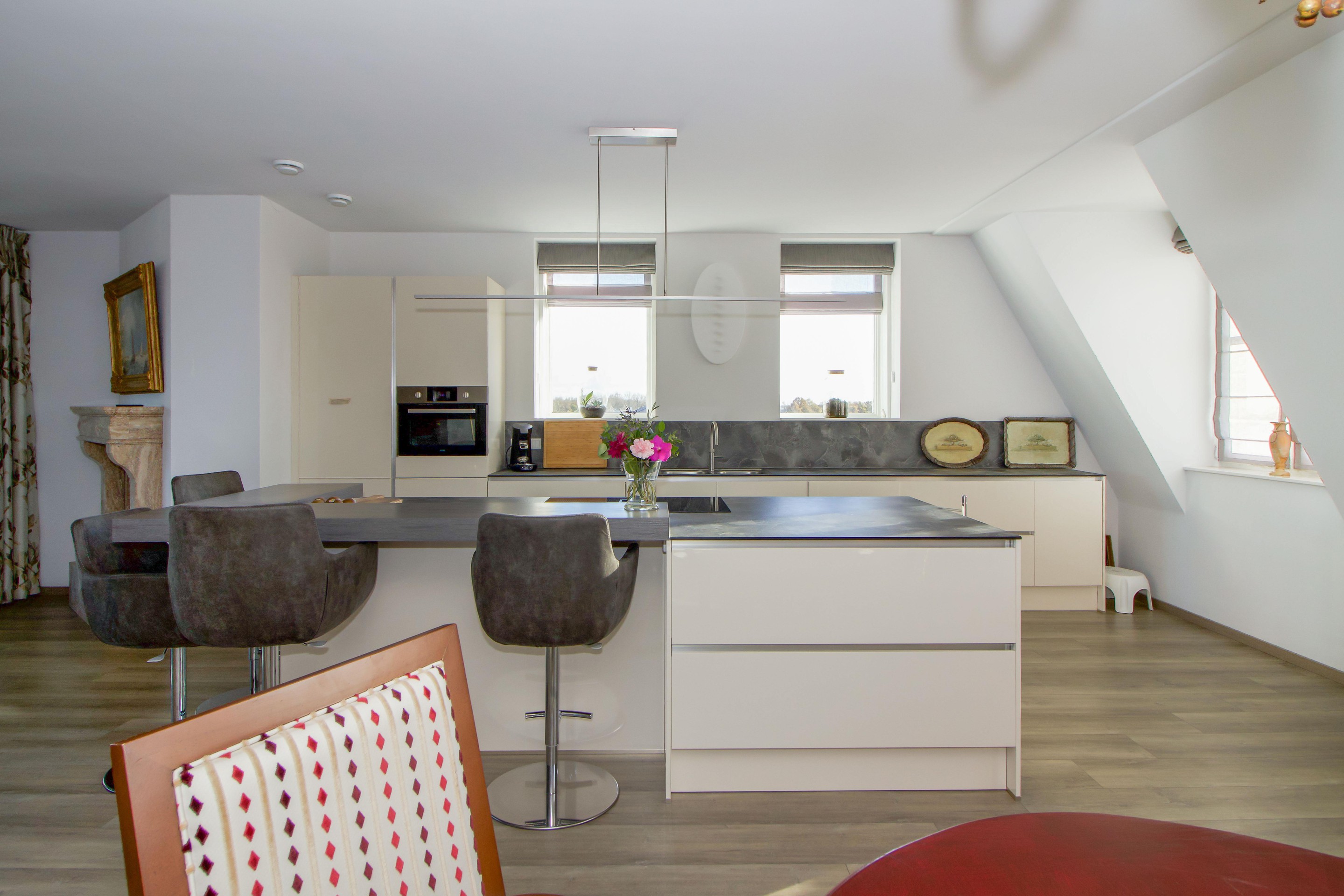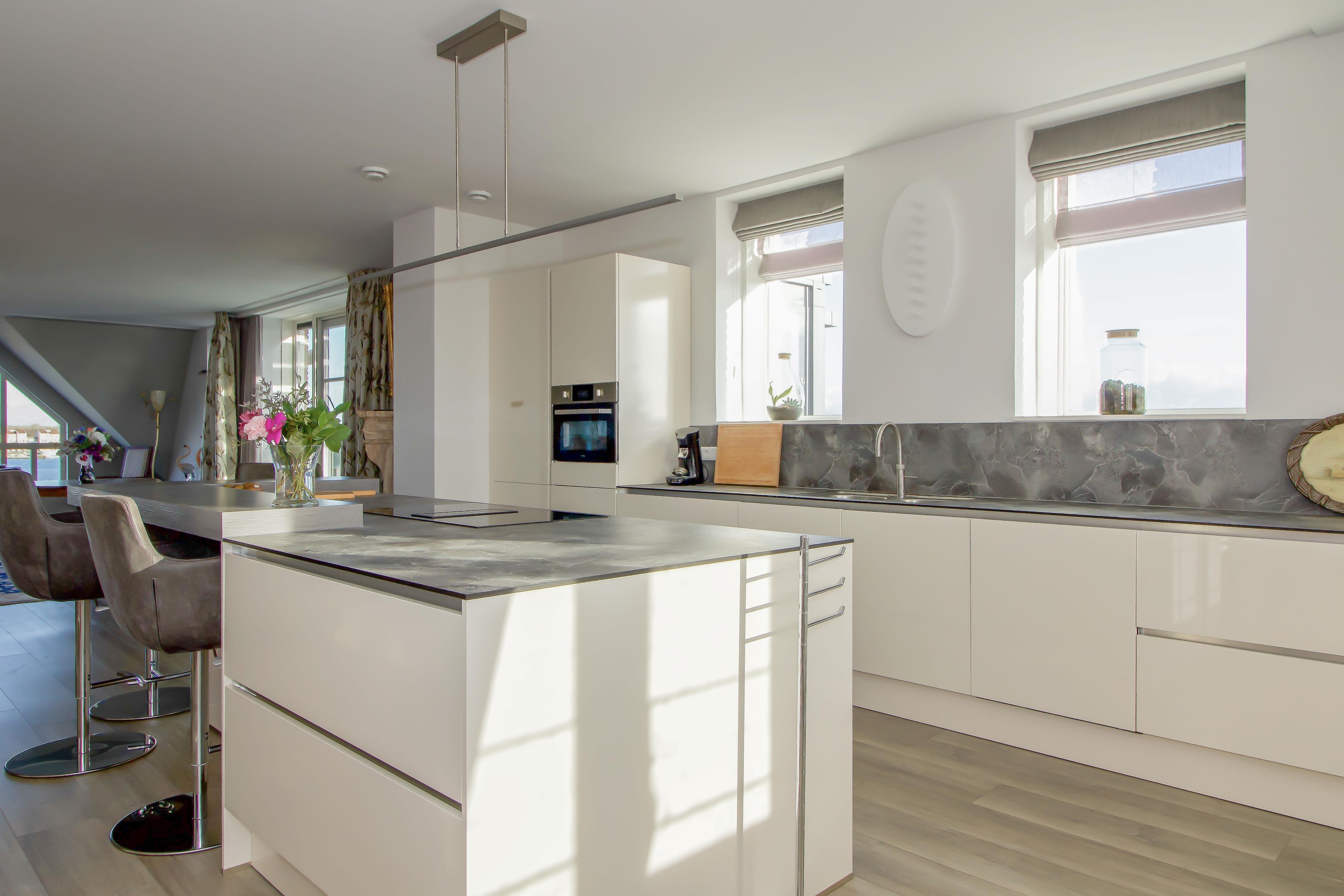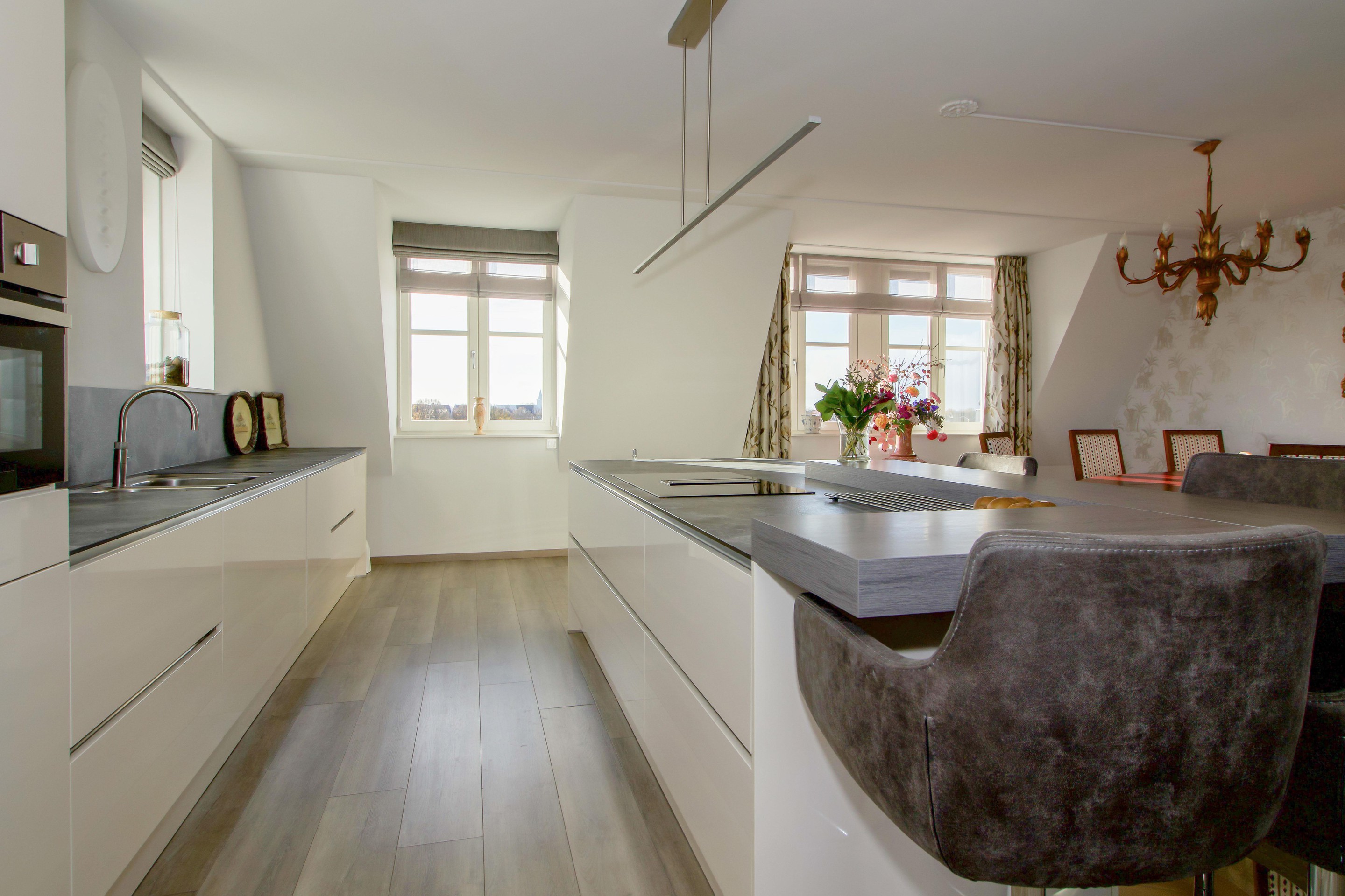 Vanuit de hal loop je door naar de royale woonkamer, die dankzij de brede raampartijen en open indeling een lichte en uitnodigende leefruimte vormt. De woonkamer staat in open verbinding met de luxe keuken, welke is voorzien van een kookeiland en ruime werk- en bergruimte.