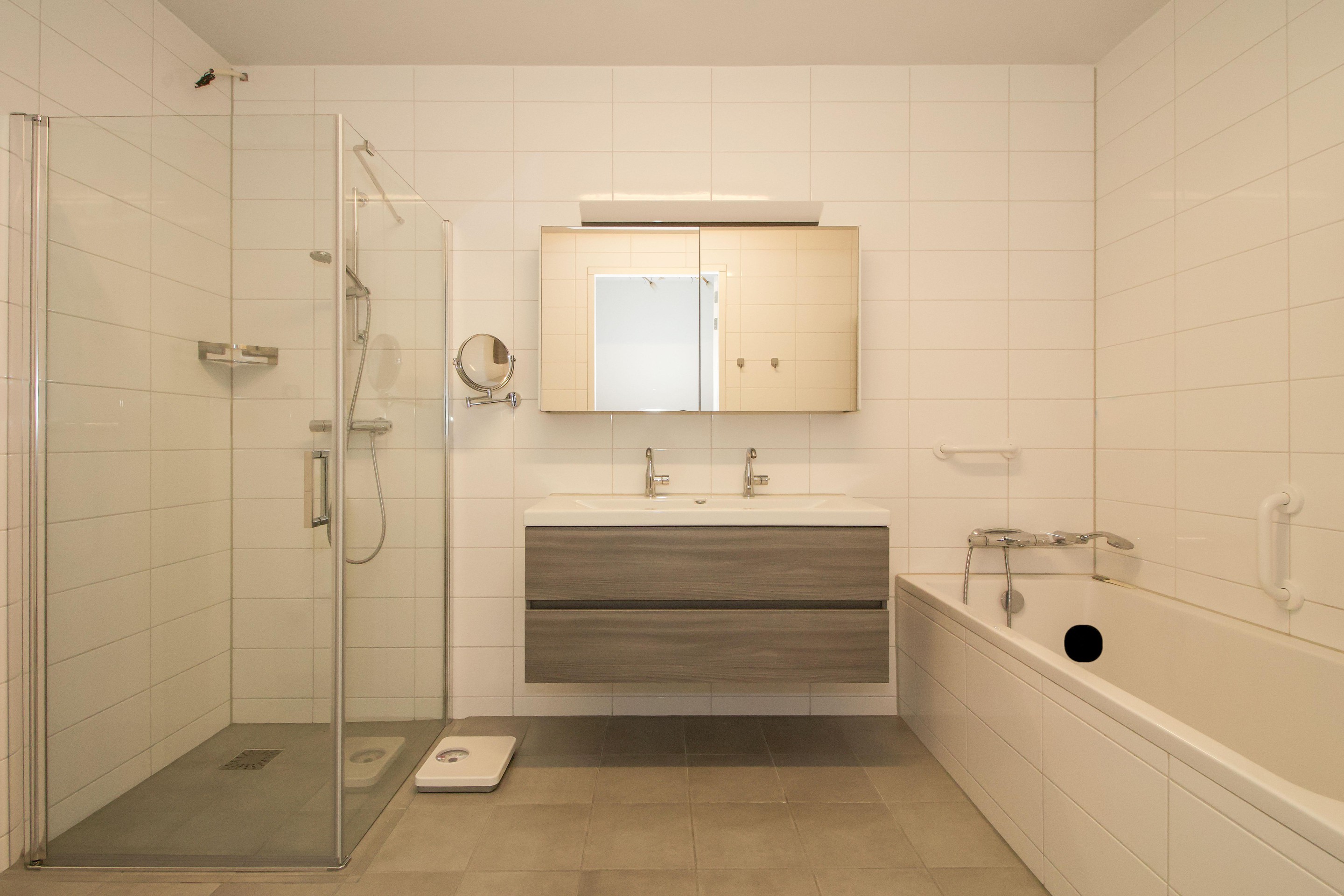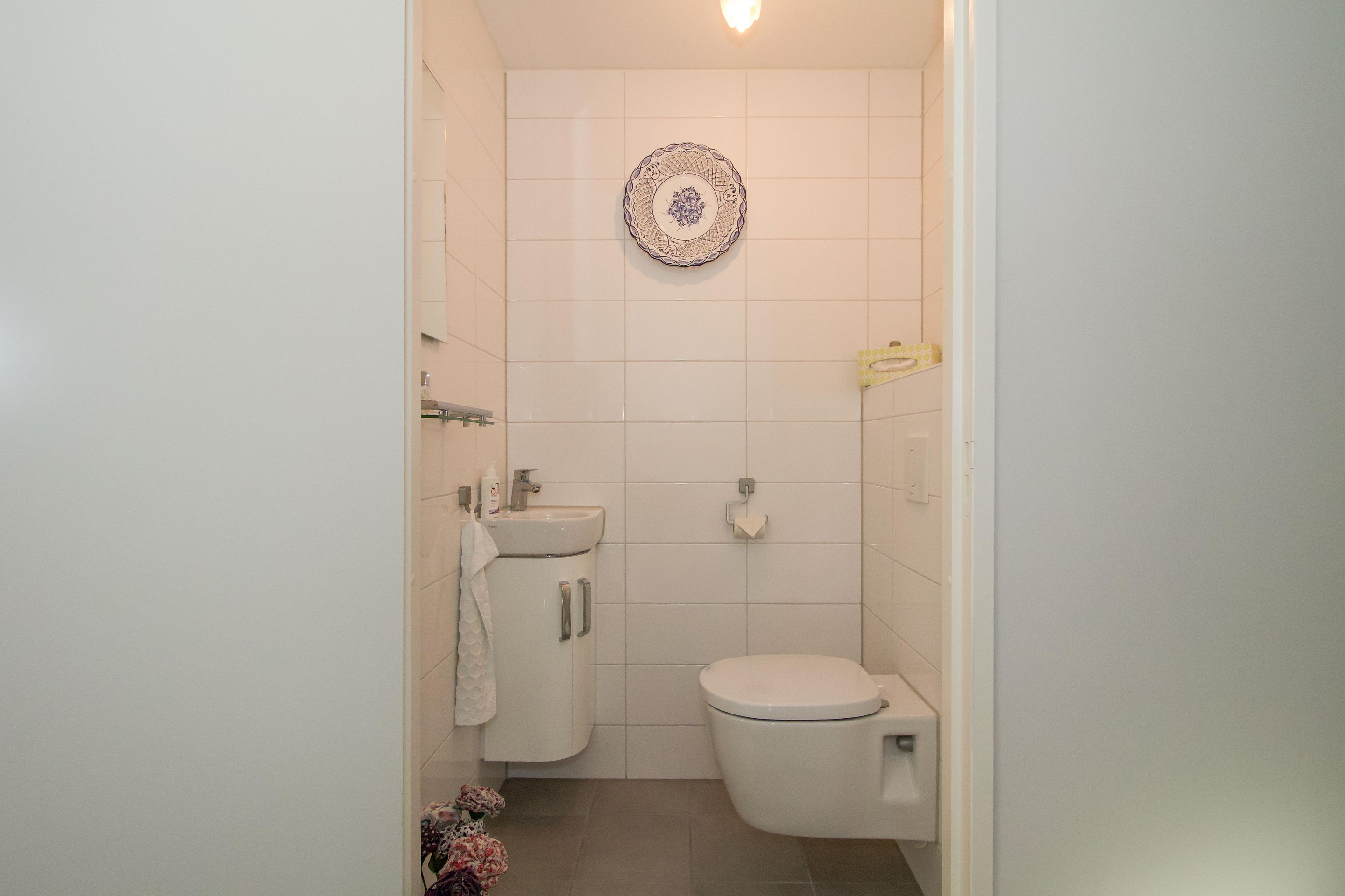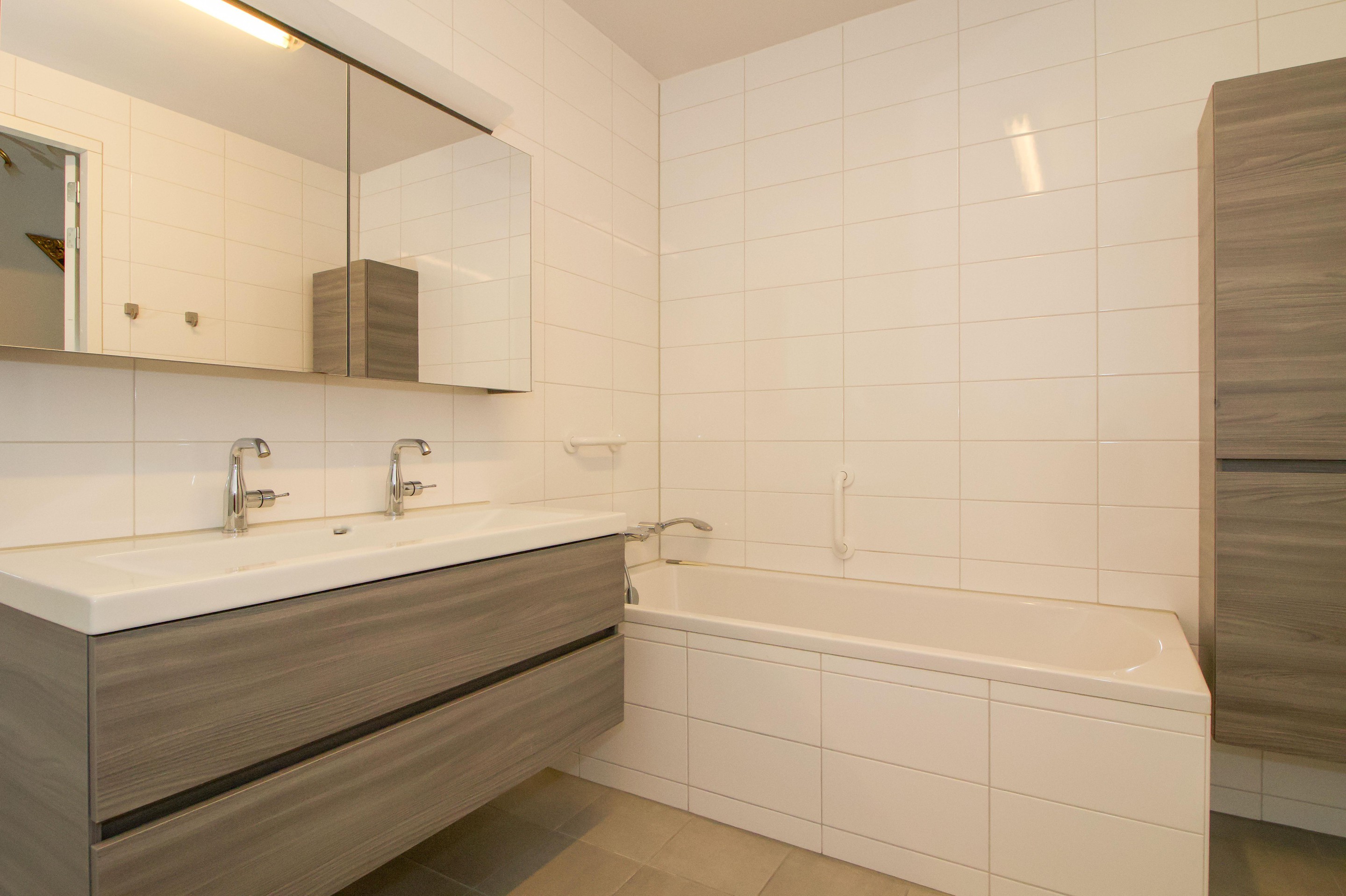 Grenzend aan de hal ligt de moderne badkamer, uitgerust met een ligbad, separate douche en wastafel. Daarnaast bevindt zich een afzonderlijke toiletruimte en een aparte ruimte voor wasmachine en droger, evenals extra bergruimte in een praktische cv-/installatieruimte.