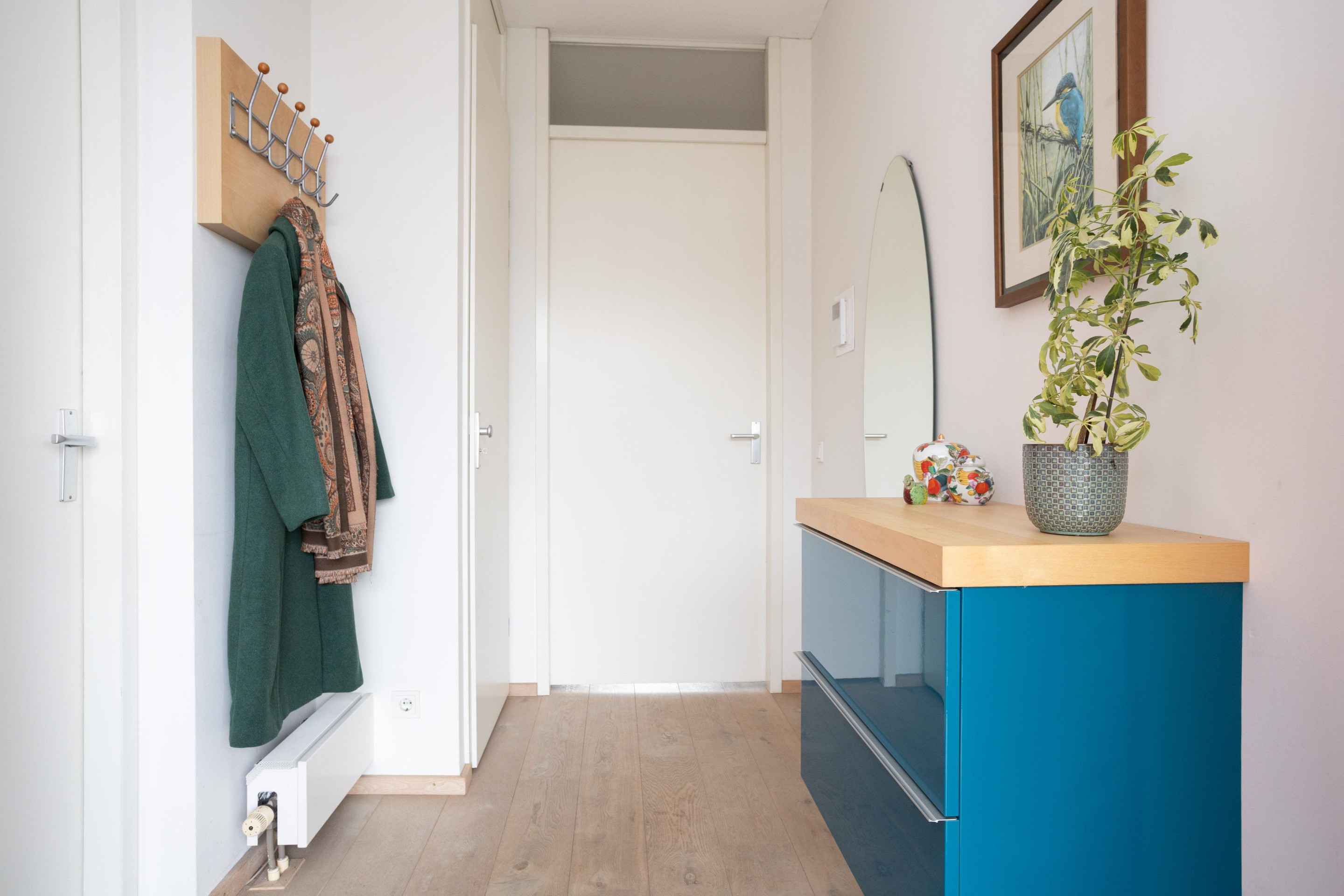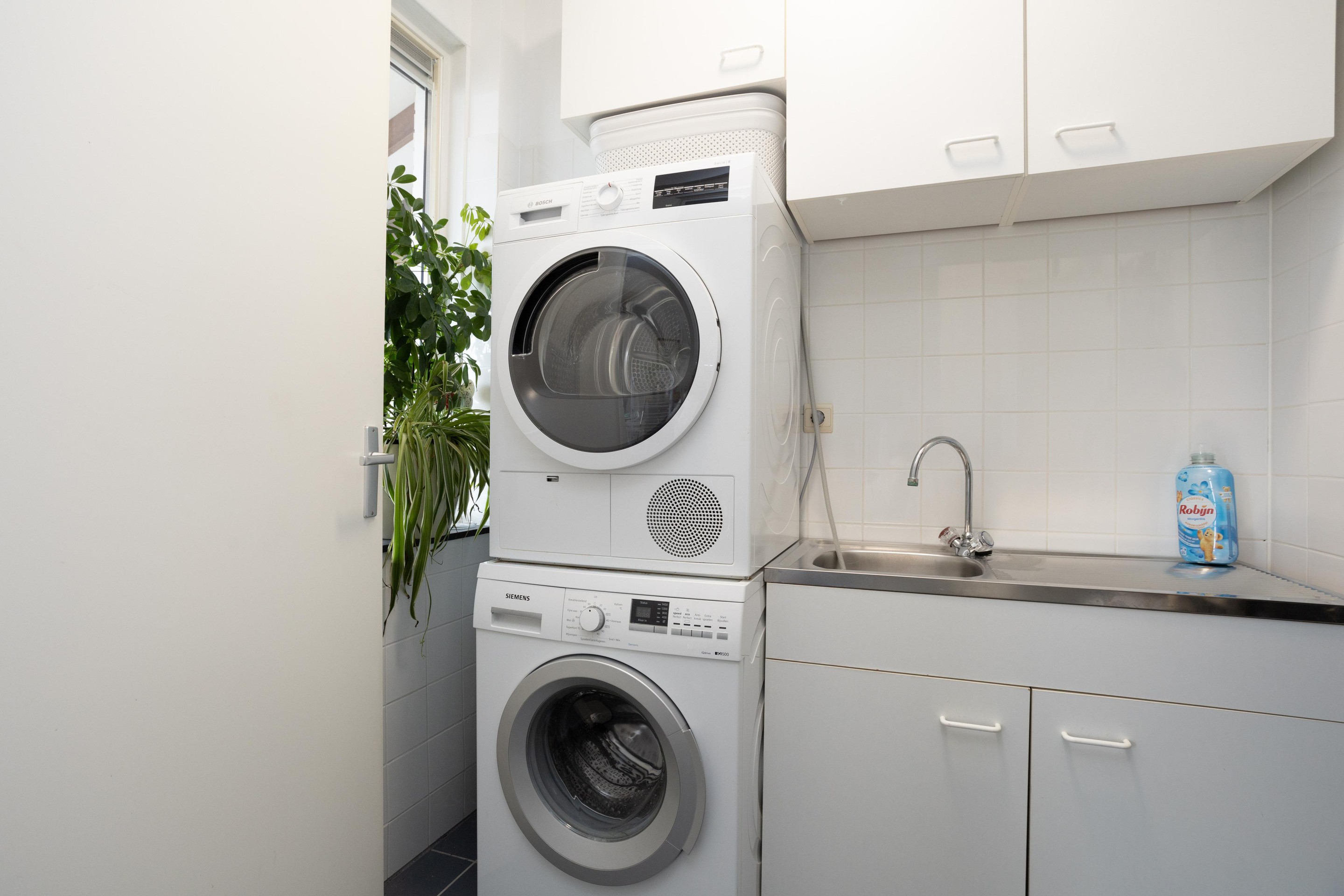 Ruime entree met meterkast en een aparte bijkeuken met opstelling van de wasmachine/-droger, cv-combiketel (Vaillant 2018) en mechanische ventilatie (2025).