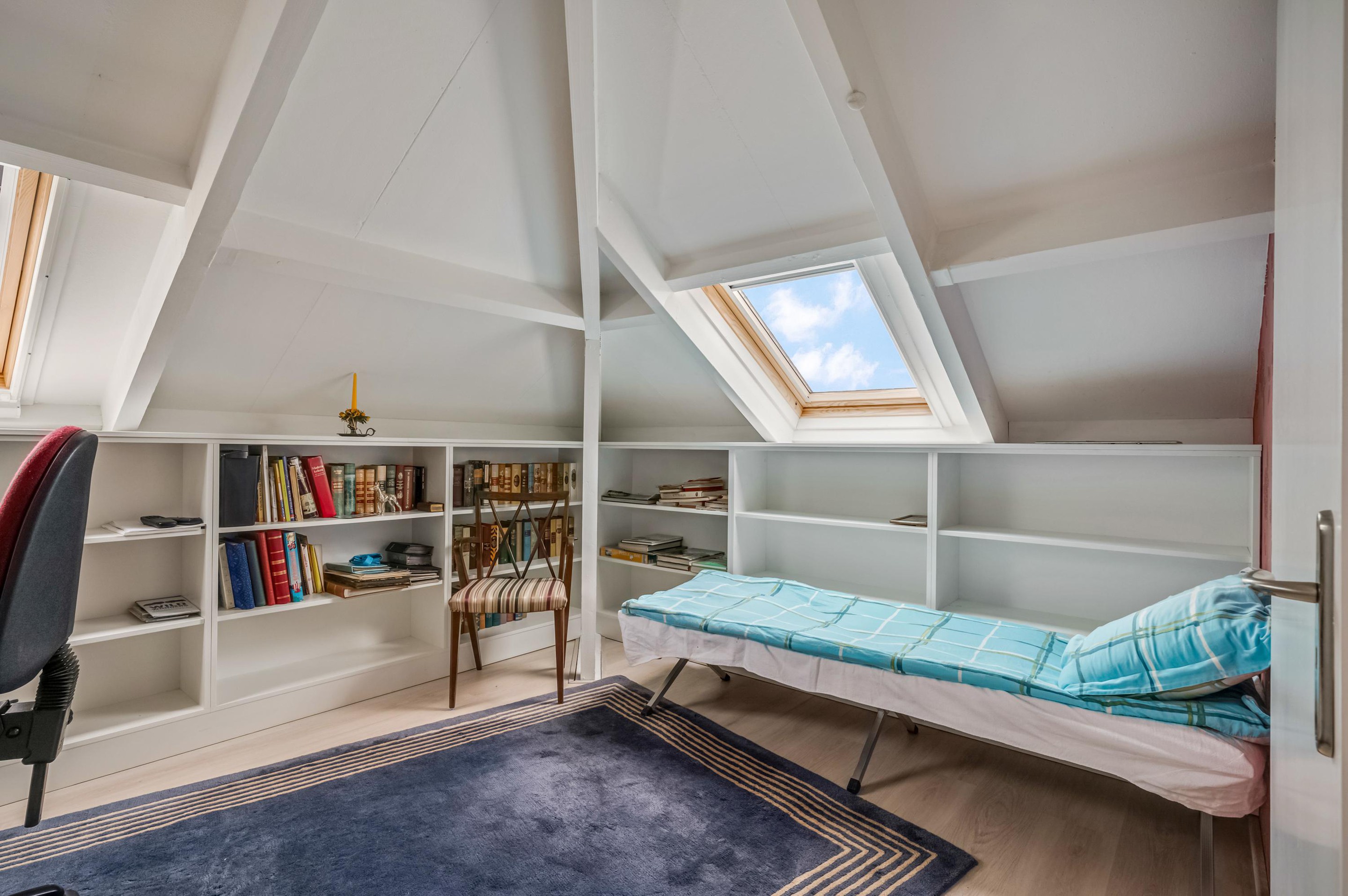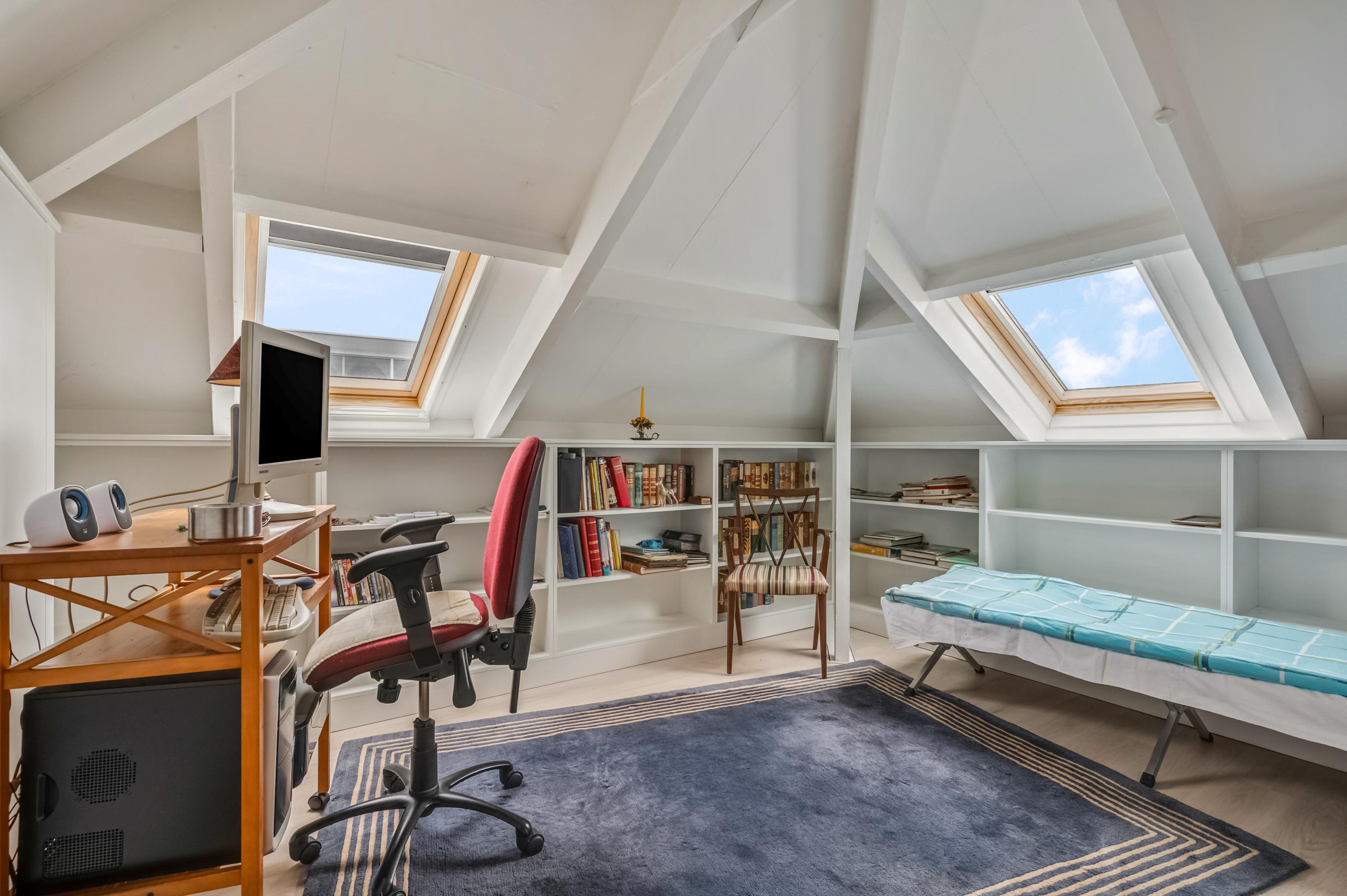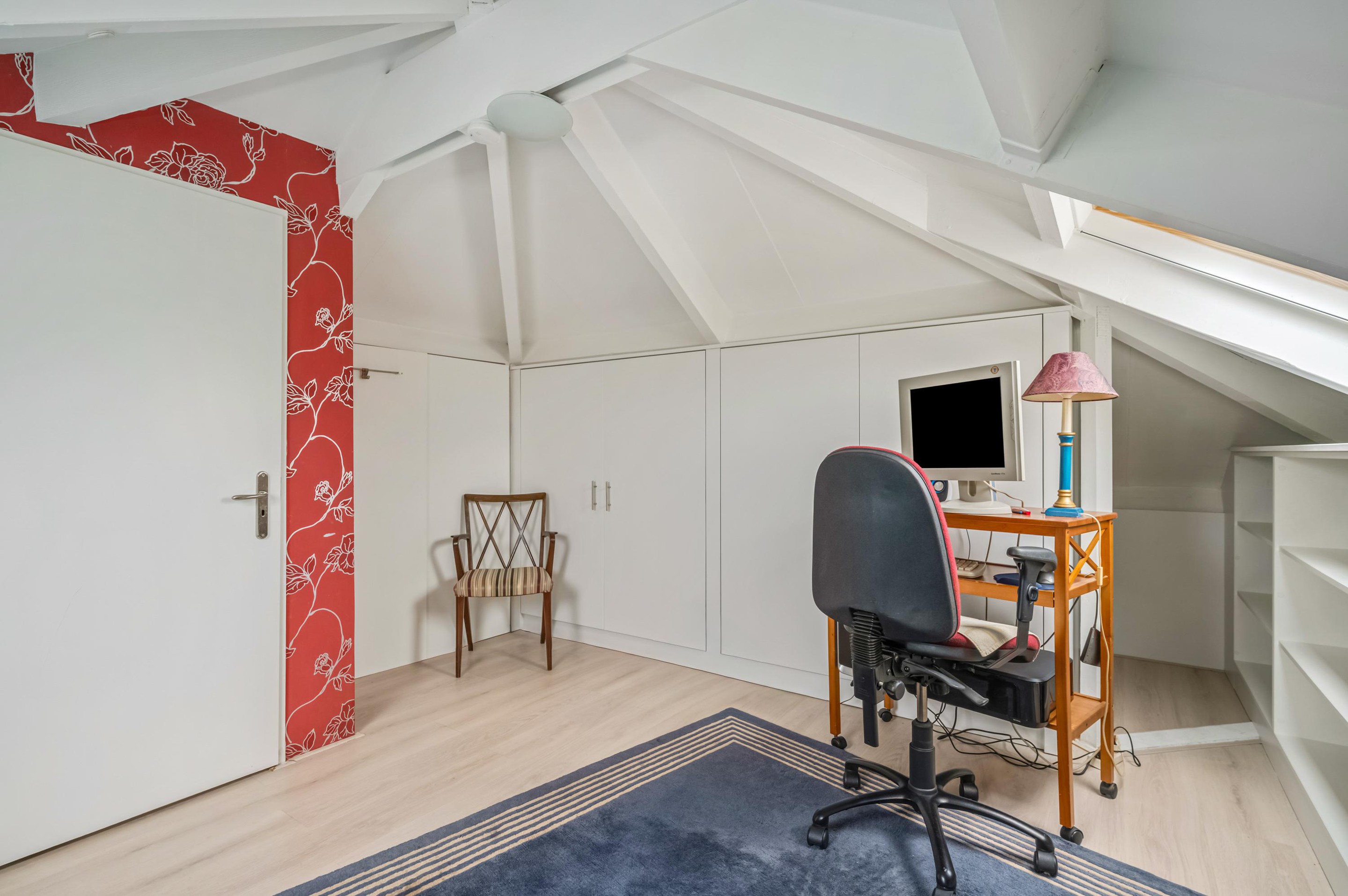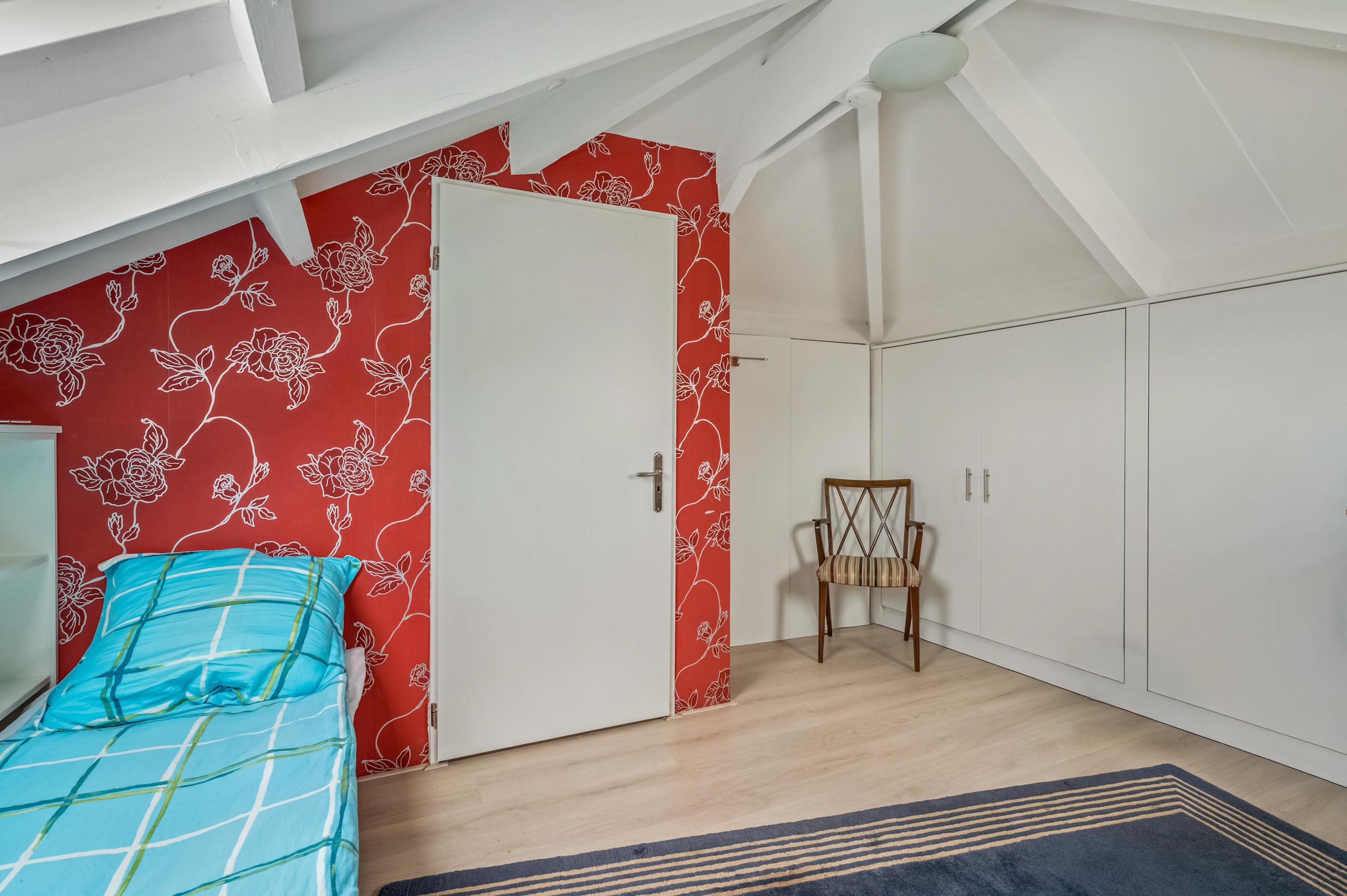 De 1e verdieping is bereikbaar via een vaste trap en biedt verrassend veel extra ruimte. Deze verdieping is voorzien van een praktische logeerruimte en bergruimte. Dankzij de aanwezige dakramen komt er prettig natuurlijk daglicht binnen, wat de ruimte aangenaam en veelzijdig maakt. Deze verdieping leent zich uitstekend voor extra slaapkamer, logeerkamer of bijvoorbeeld een rustige werk- of hobbyruimte, waardoor het appartement flexibel in gebruik is en eenvoudig kan worden aangepast aan verschillende woonwensen.