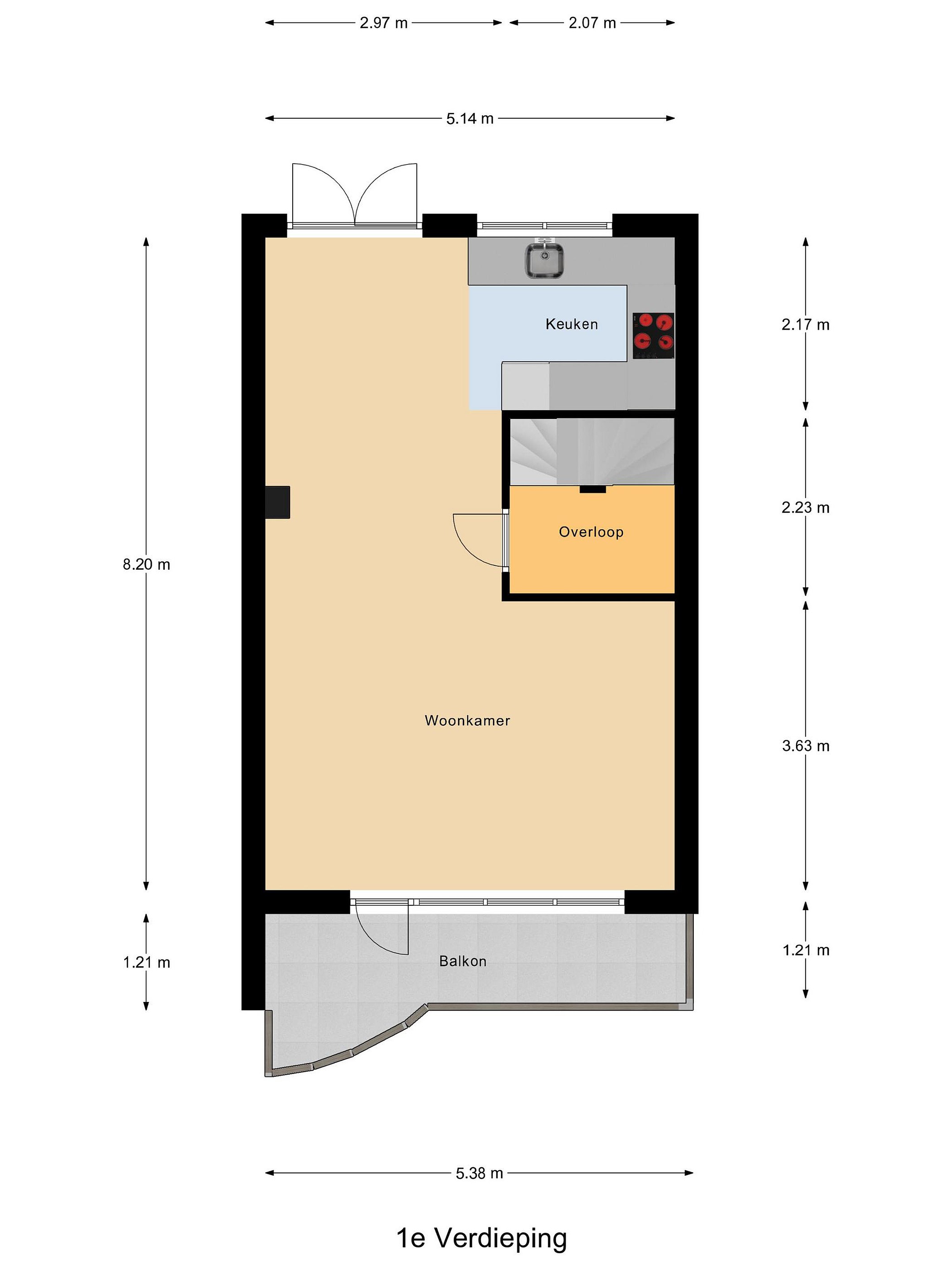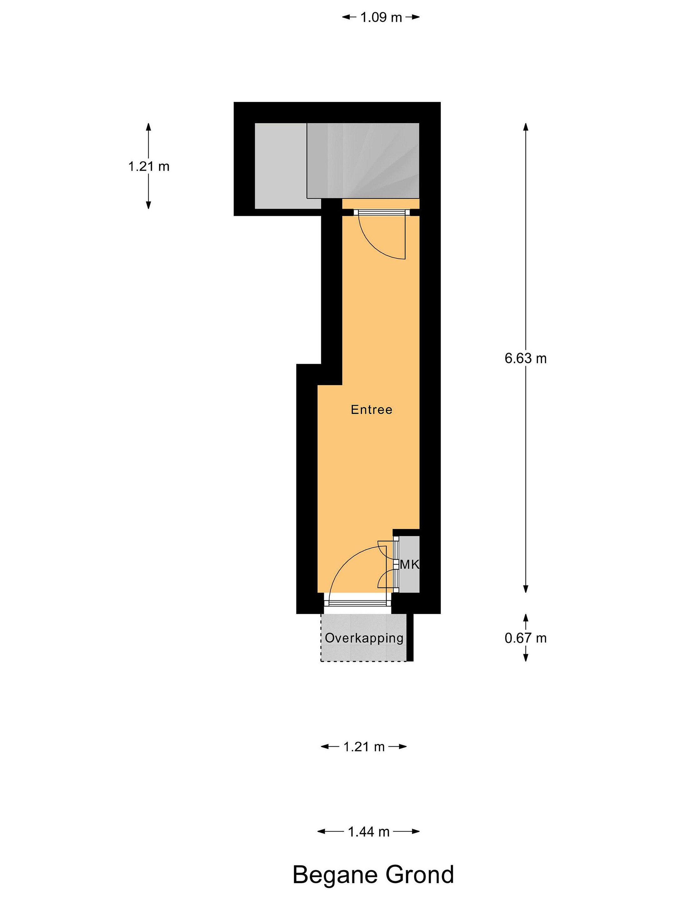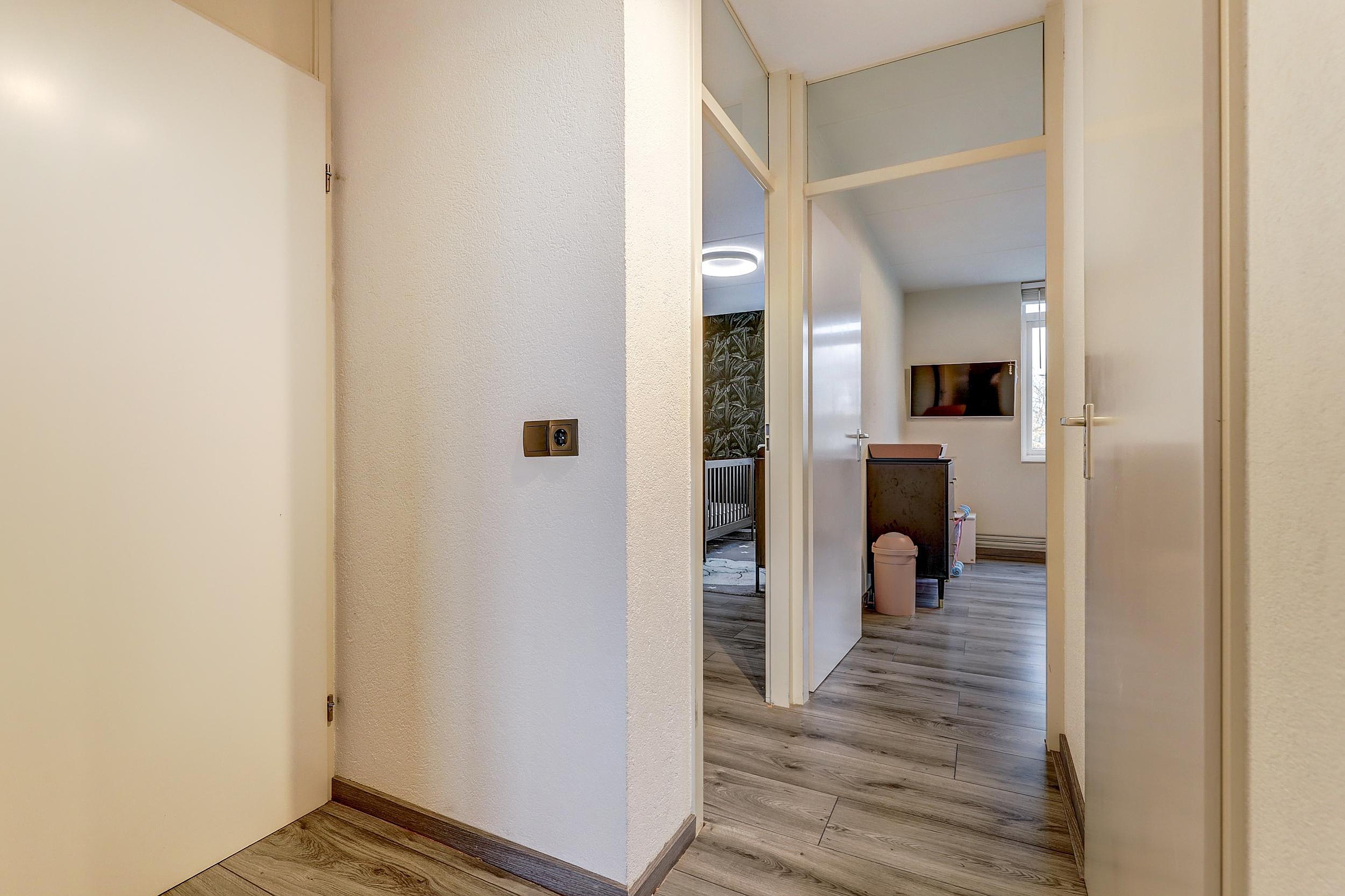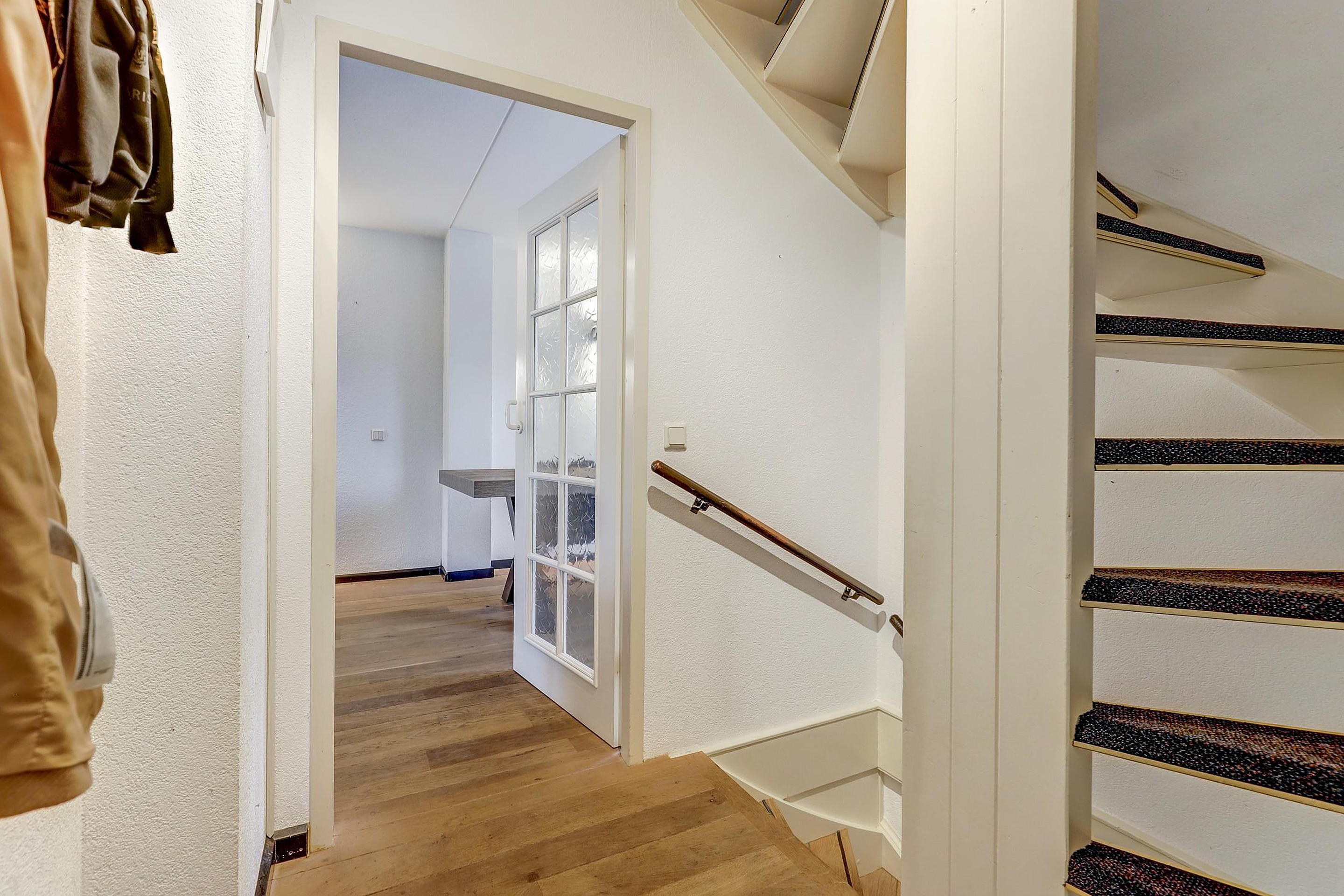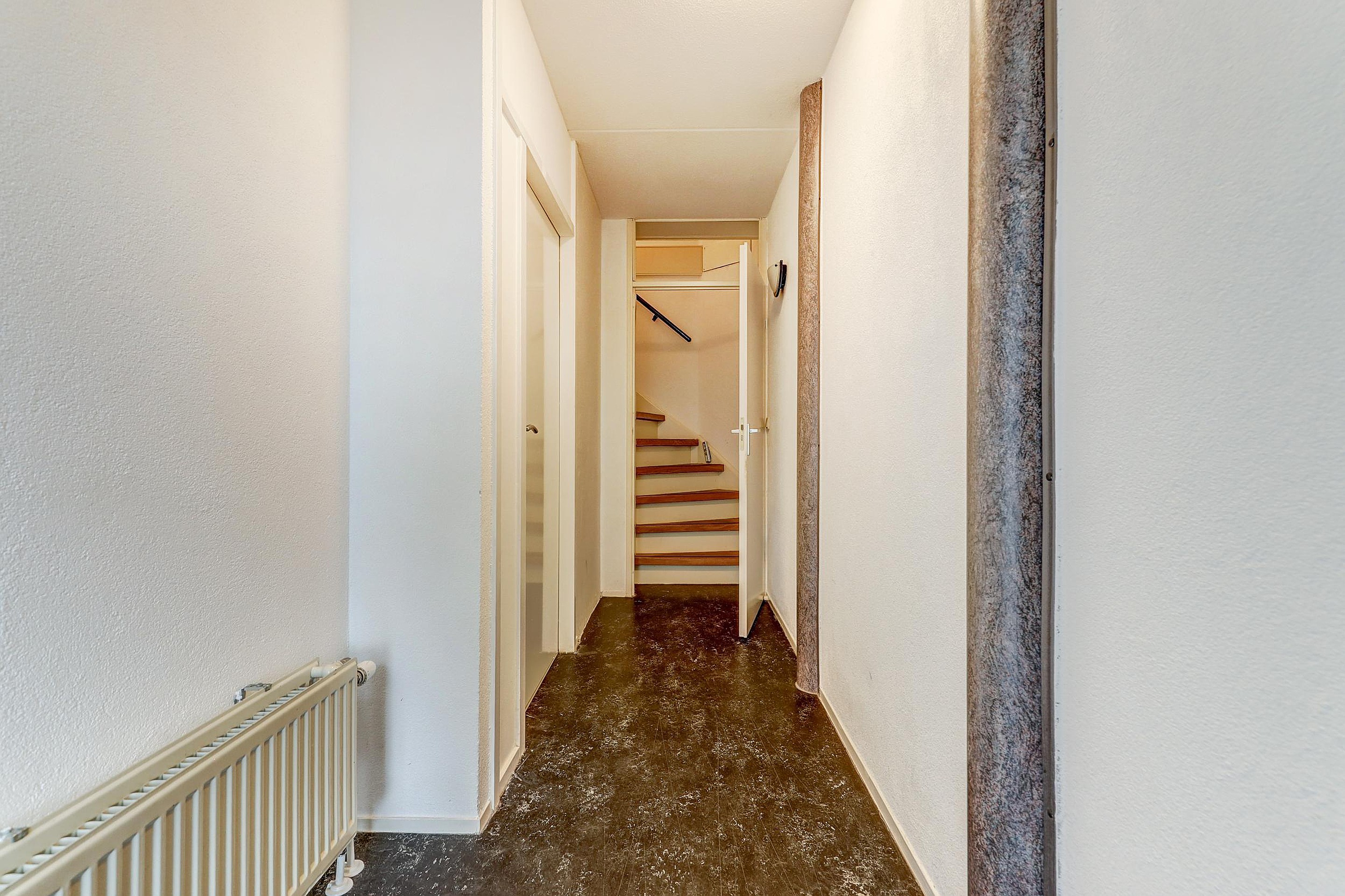 De overloop geeft toegang tot de trapopgang naar boven en de woonkamer.