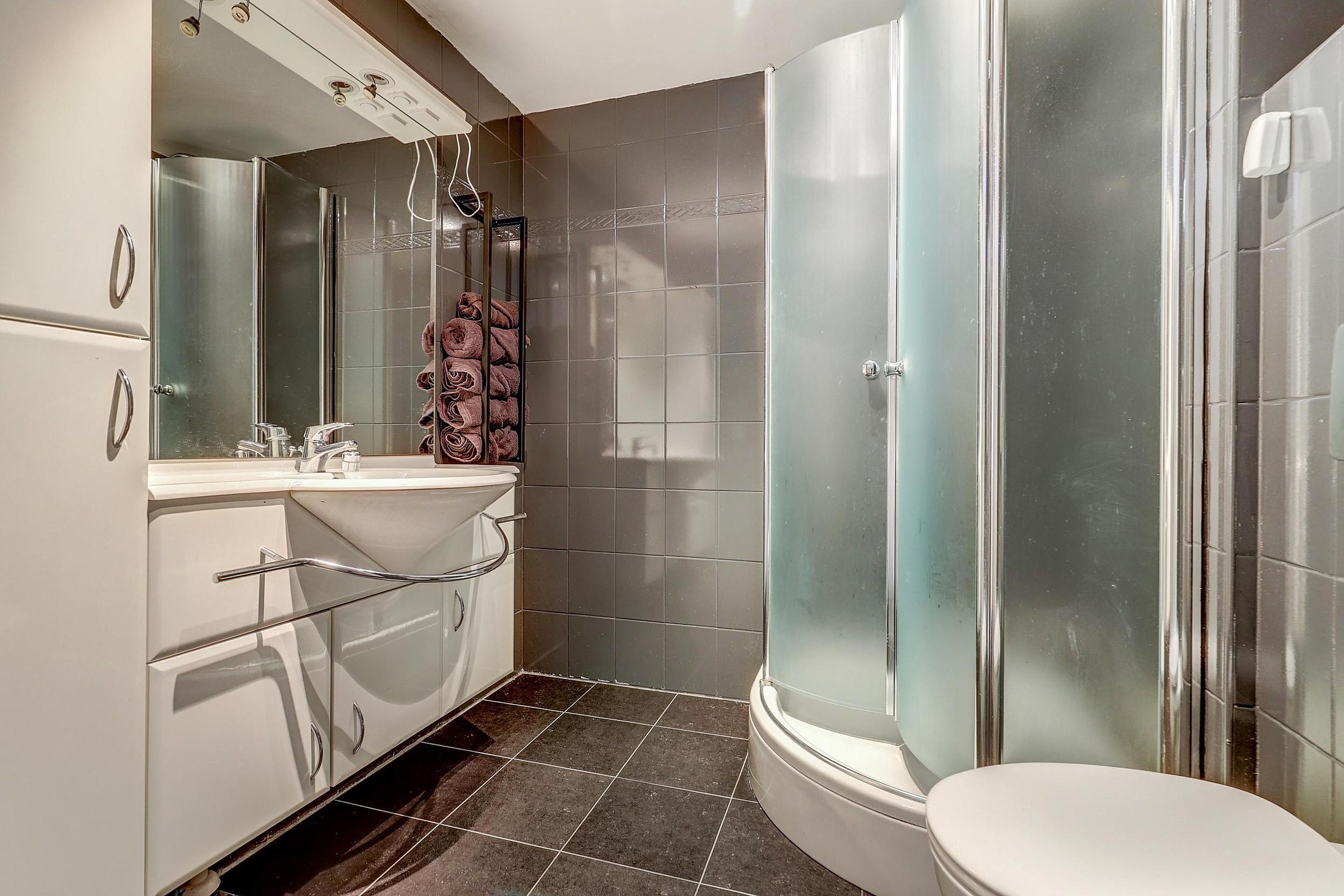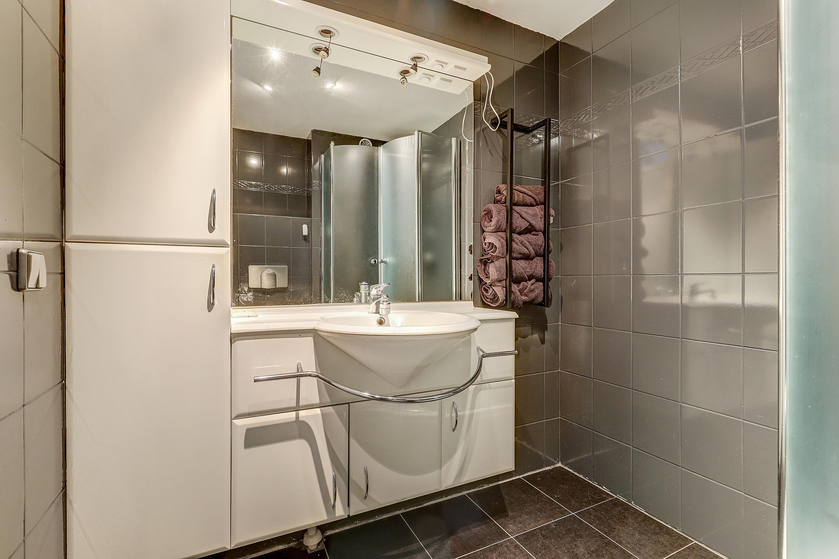 De badkamer is keurig betegeld en uitgerust met een wastafel met meubel, hangend toilet, douchecabine en een designradiator.