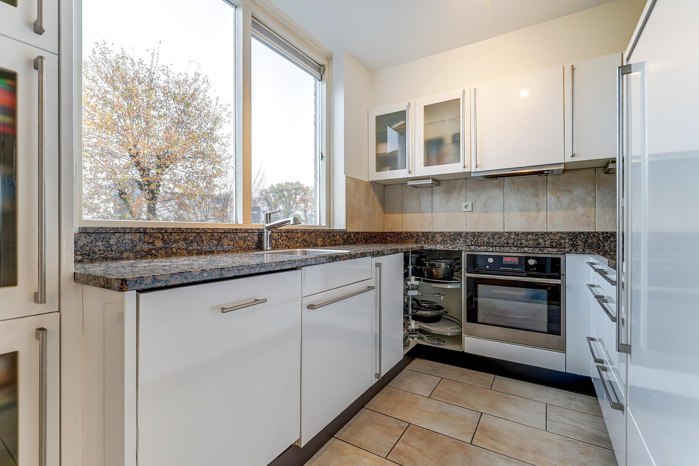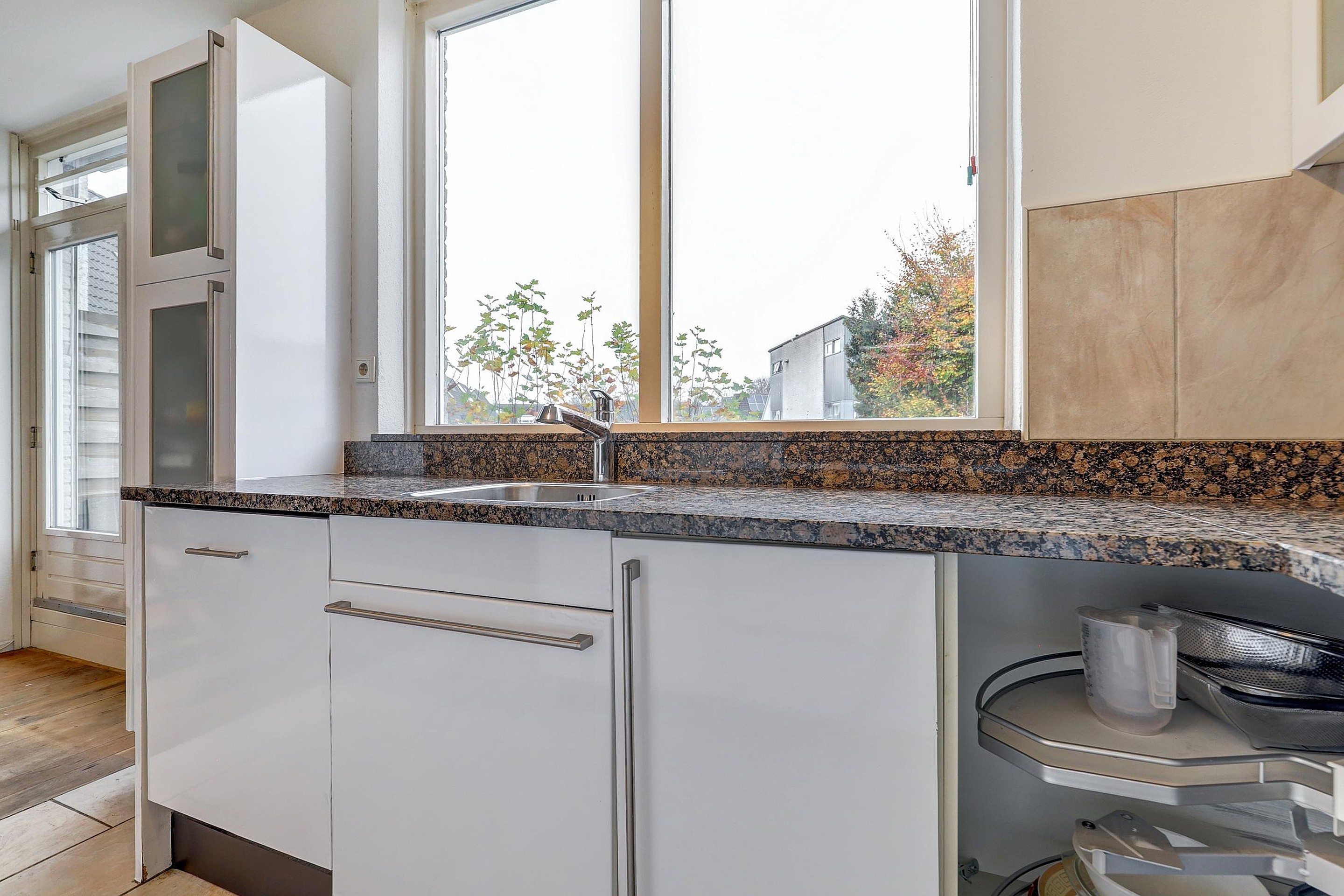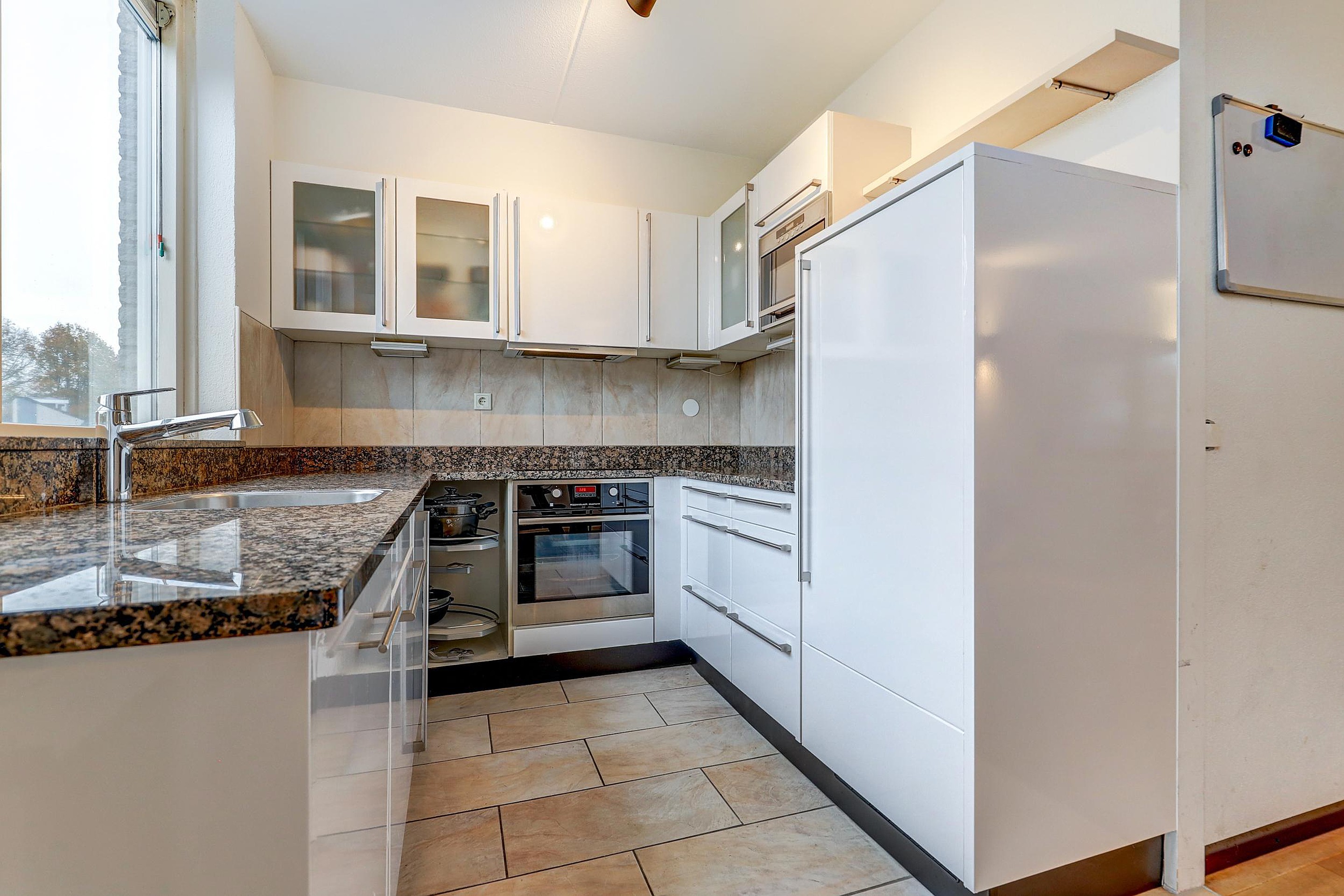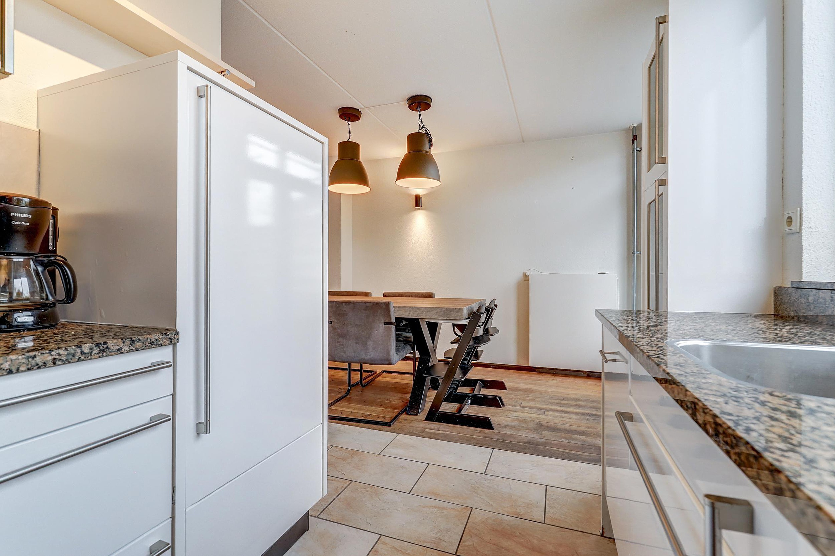 Vanuit de woonkamer wandel je zo de halfopen keuken in, uitgevoerd in een praktische L-opstelling. Deze keuken is helemaal compleet en voorzien van een spoelbak, natuurstenen aanrechtblad, koelkast, inductiekookplaat, afzuigkap, oven, magnetron en vaatwasser.