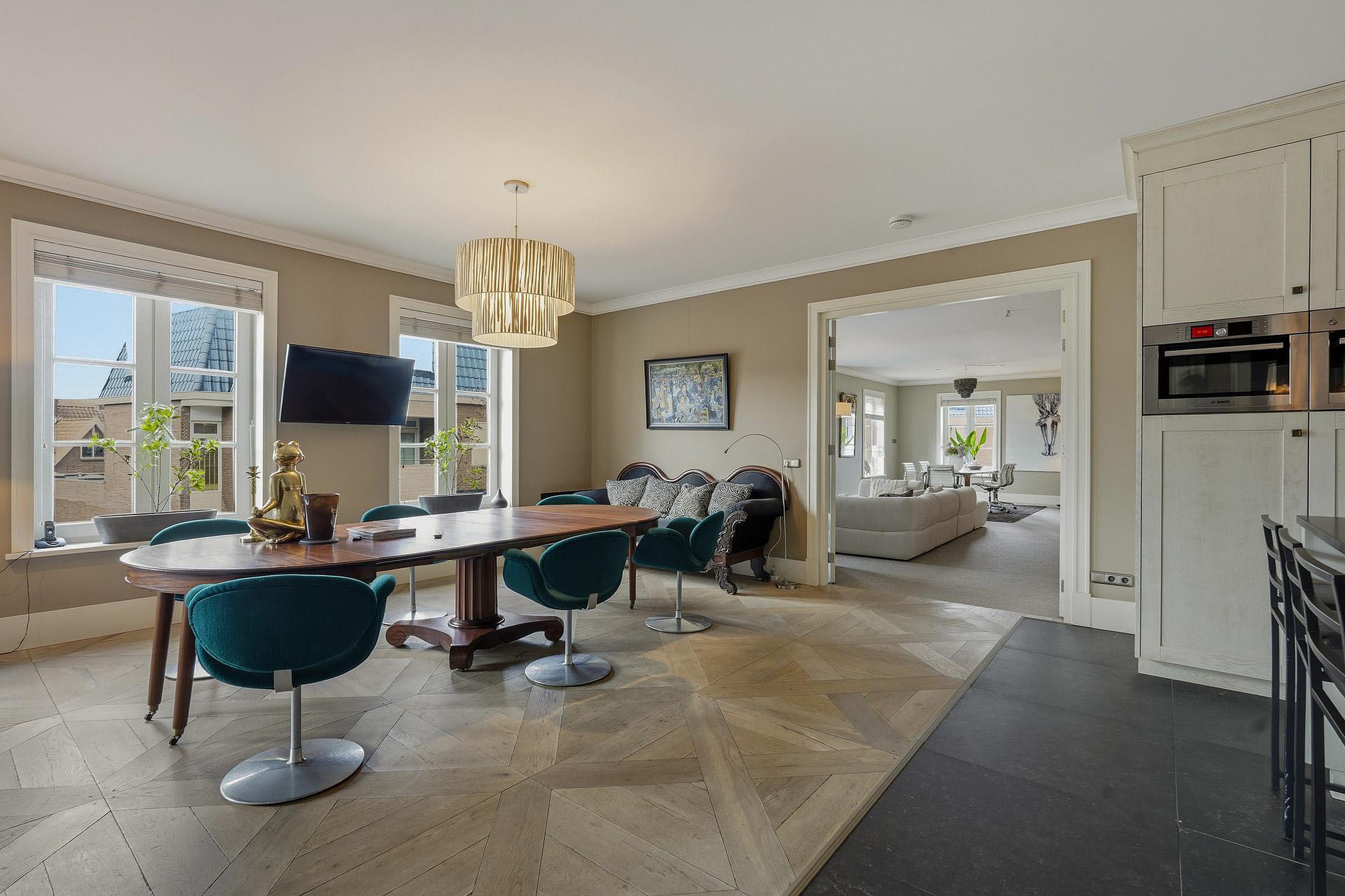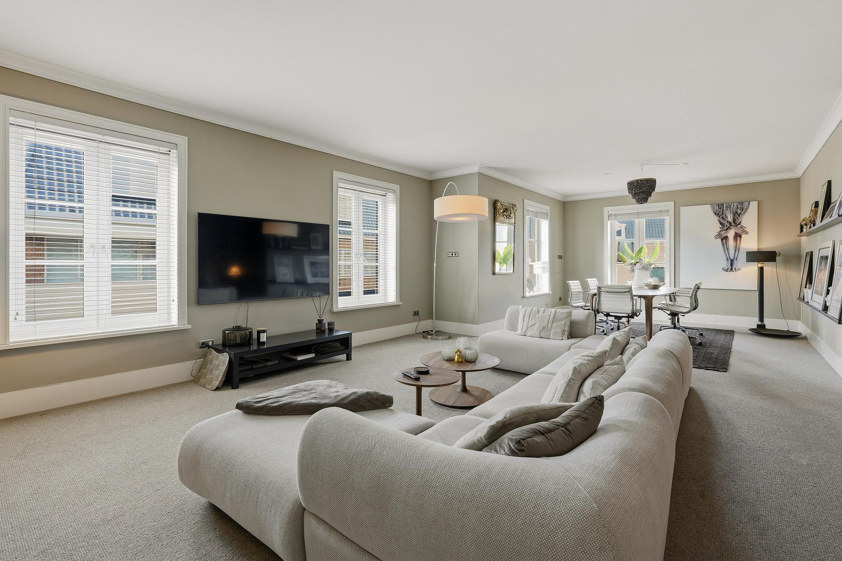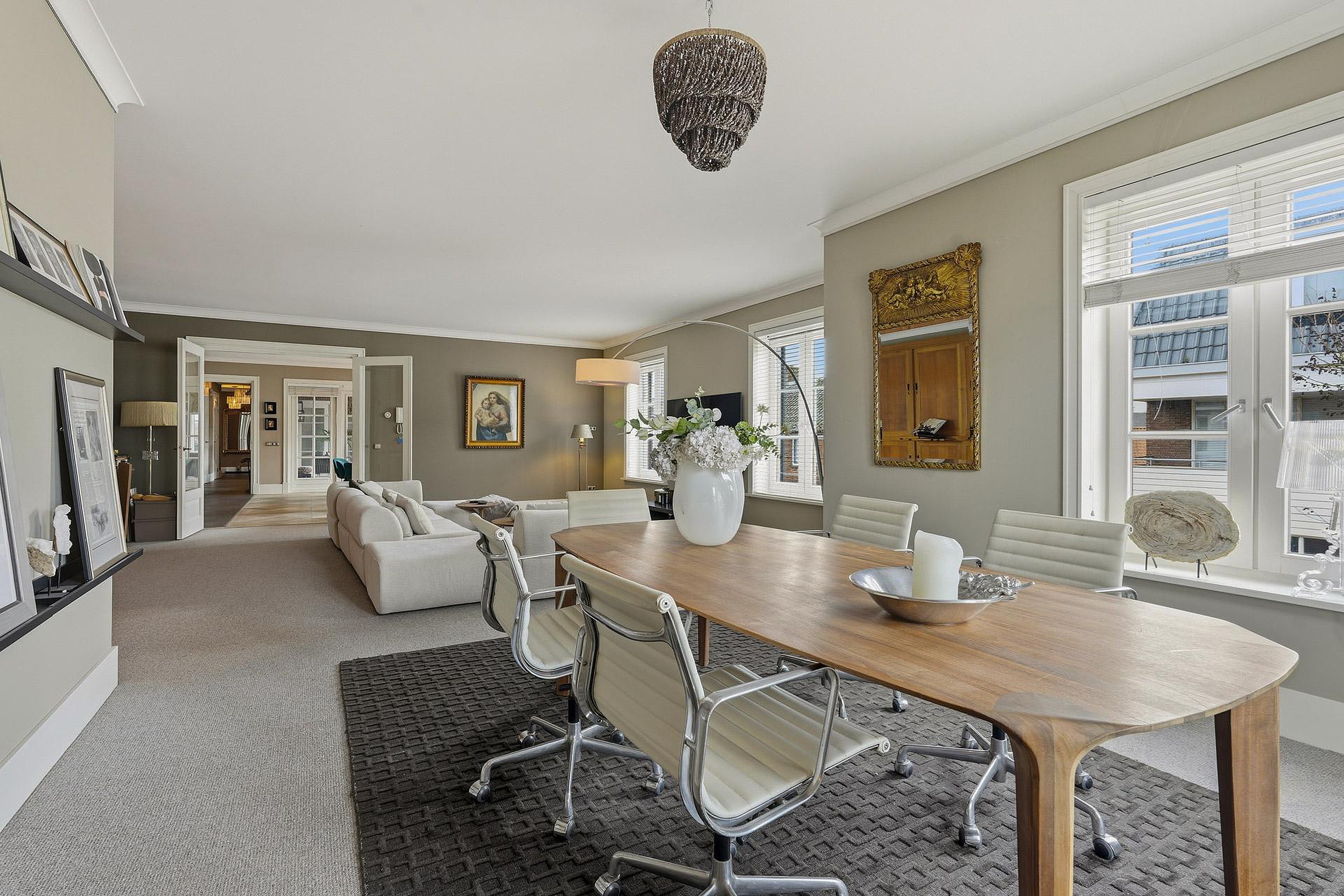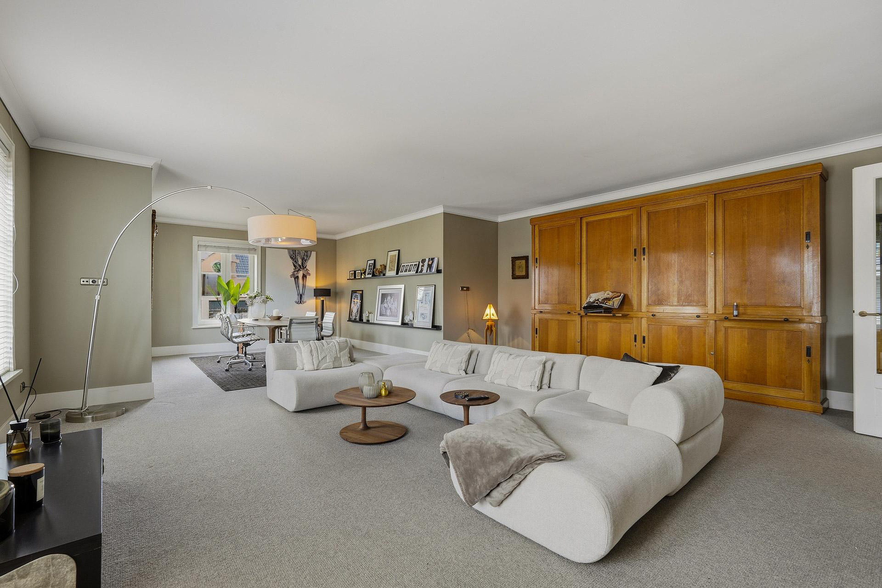 De royale opzet en de grote, lage raampartijen met luxe raamdecoratiezorgen voor een indrukwekkende lichtinval en een gevoel van openheid. De hoogwaardige afwerking springt direct in het oog: strak gestucte plafonds met brede sierlijsten, hoge plinten, luxe wandafwerking en een combinatie van verfijnde vloerafwerkingen. Alles ademt kwaliteit en tijdloze elegantie.