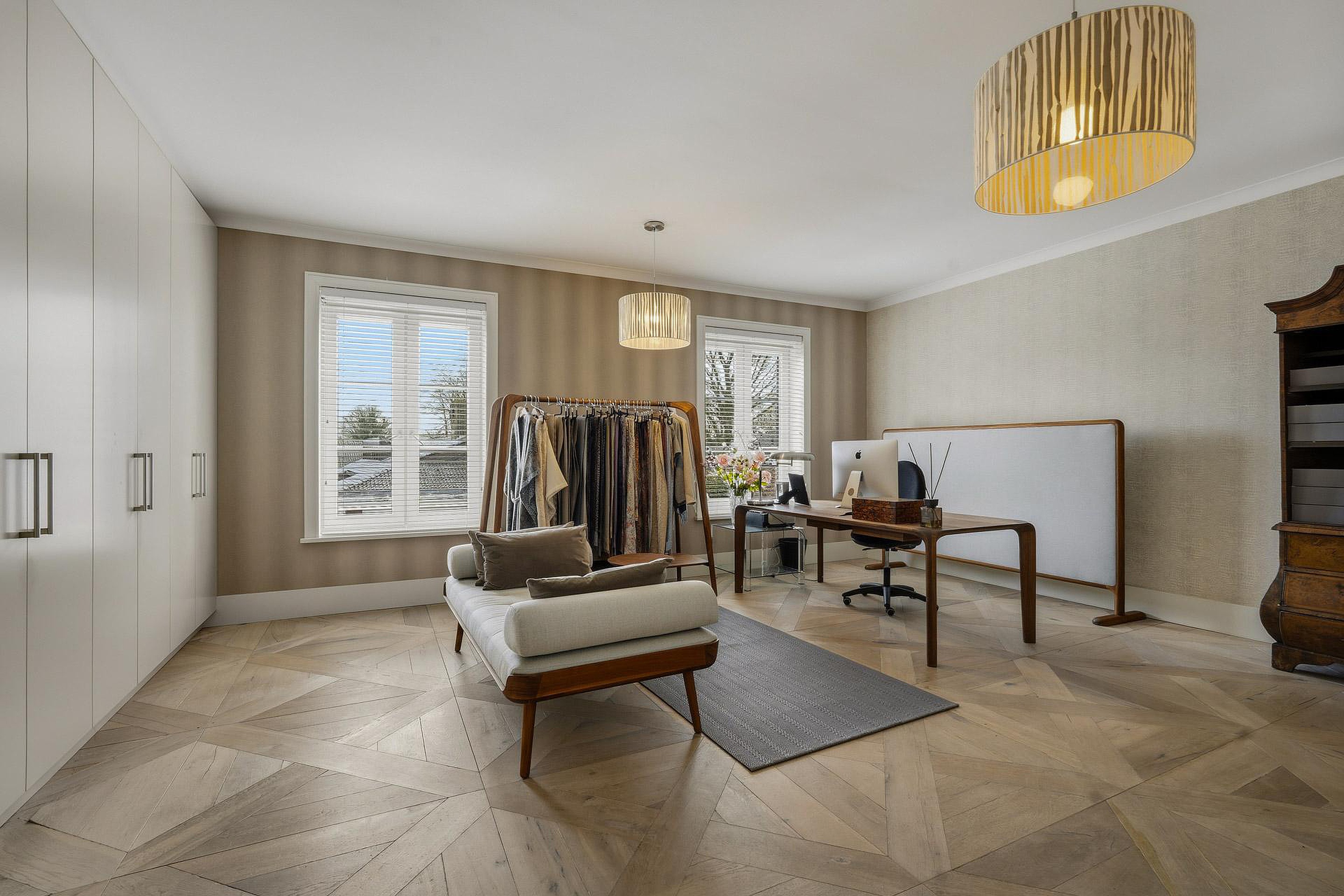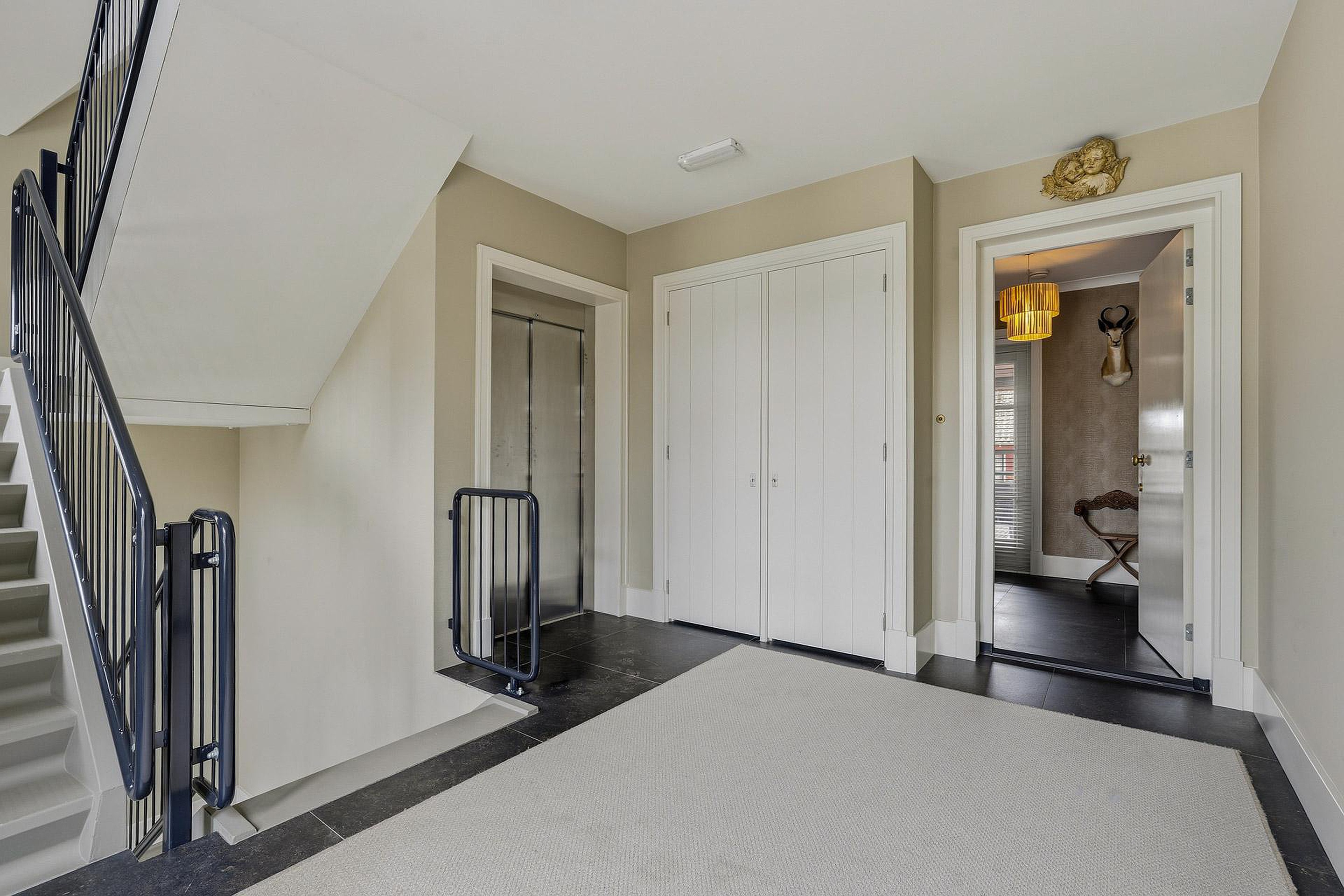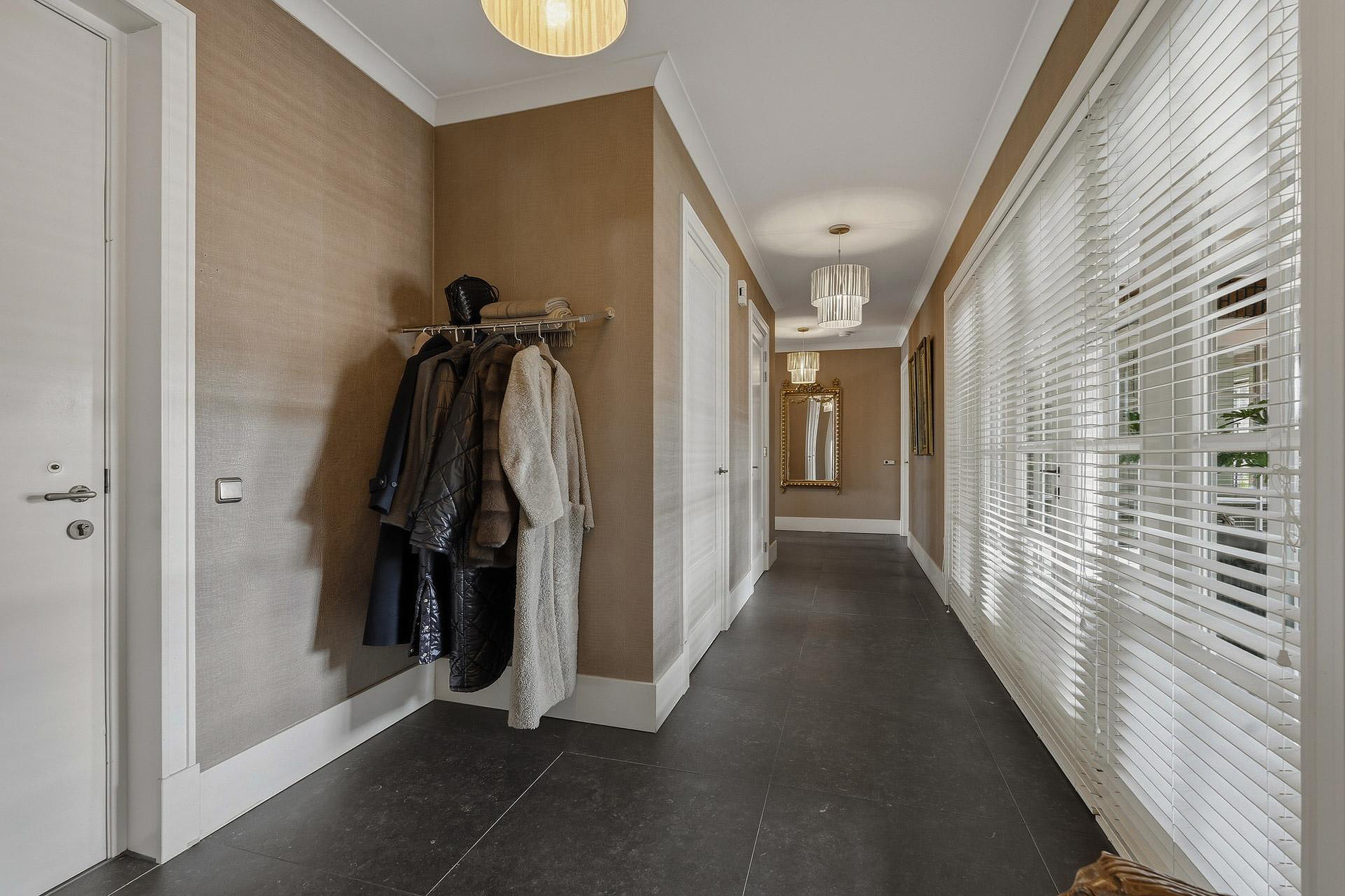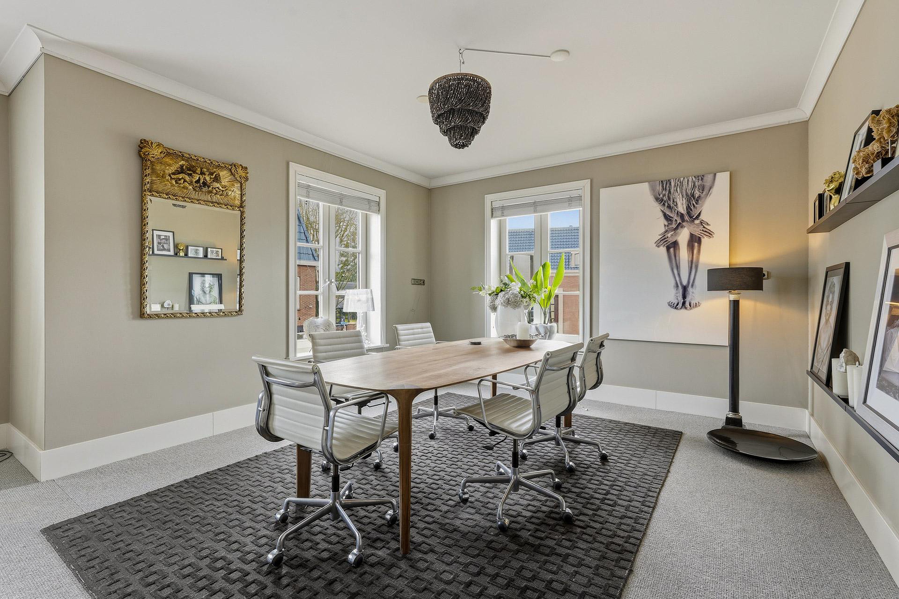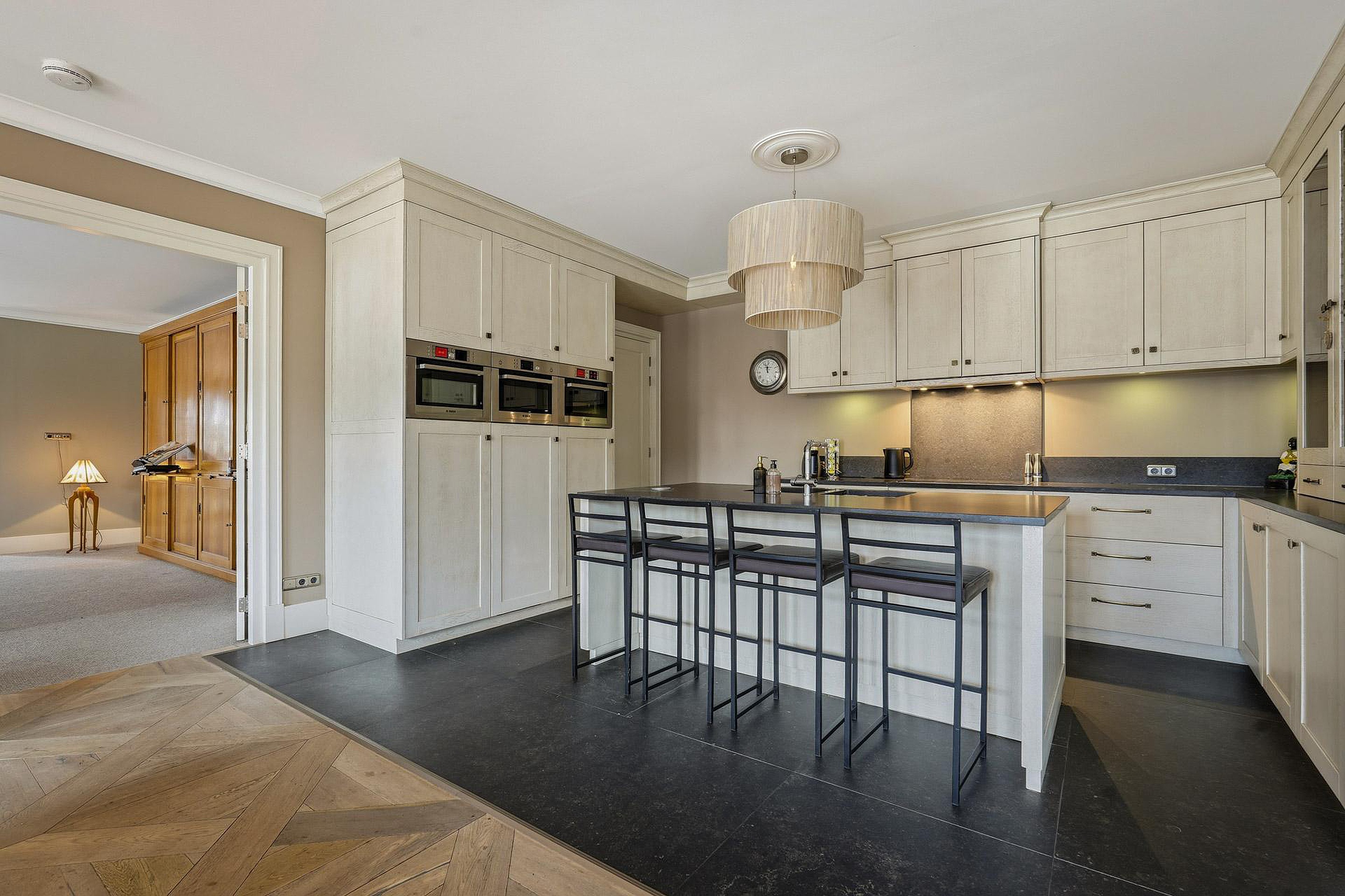 De royale opzet en de grote, lage raampartijen met luxe raamdecoratiezorgen voor een indrukwekkende lichtinval en een gevoel van openheid. De hoogwaardige afwerking springt direct in het oog: strak gestucte plafonds met brede sierlijsten, hoge plinten, luxe wandafwerking en een combinatie van verfijnde vloerafwerkingen. Alles ademt kwaliteit en tijdloze elegantie.
