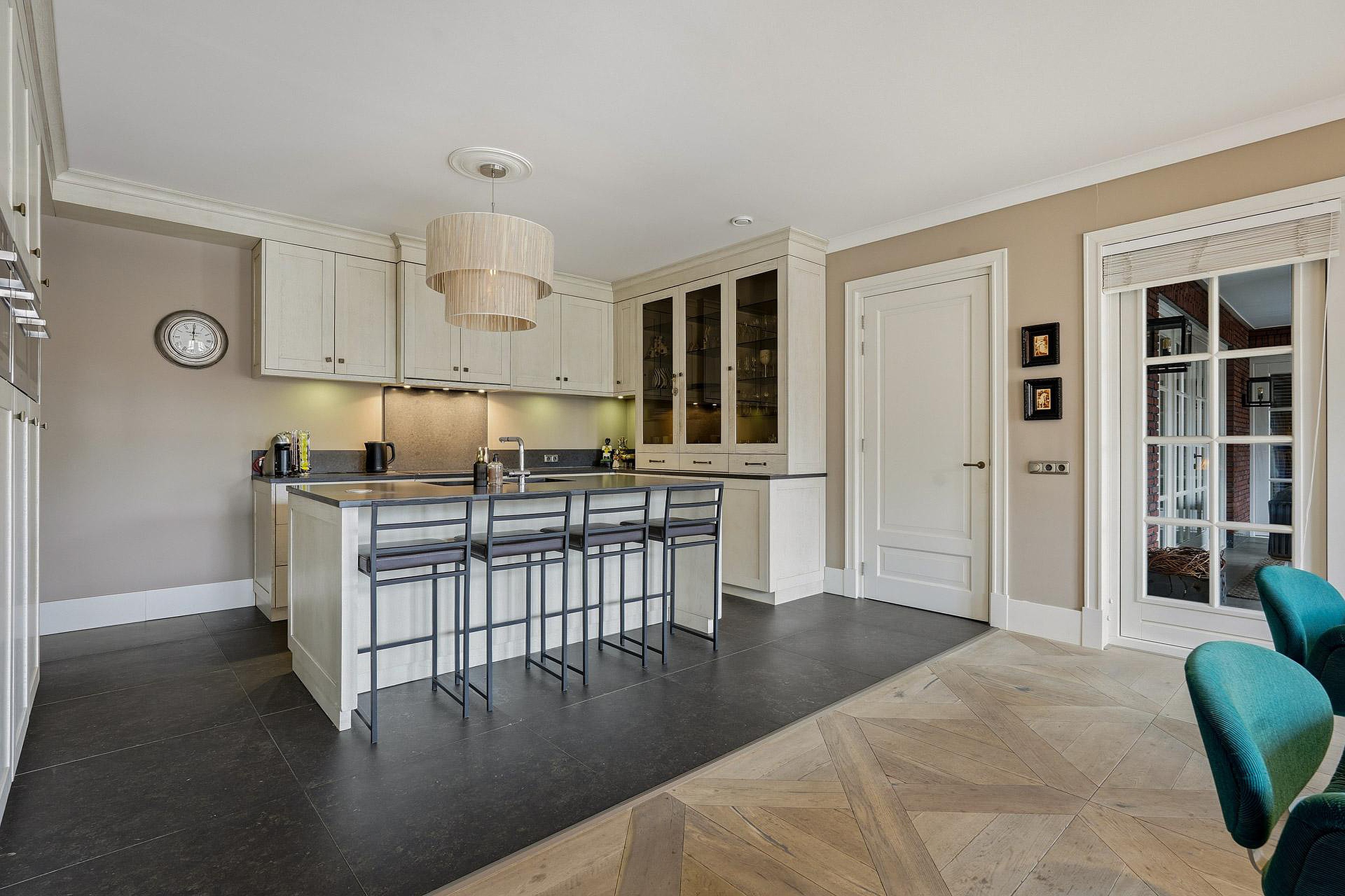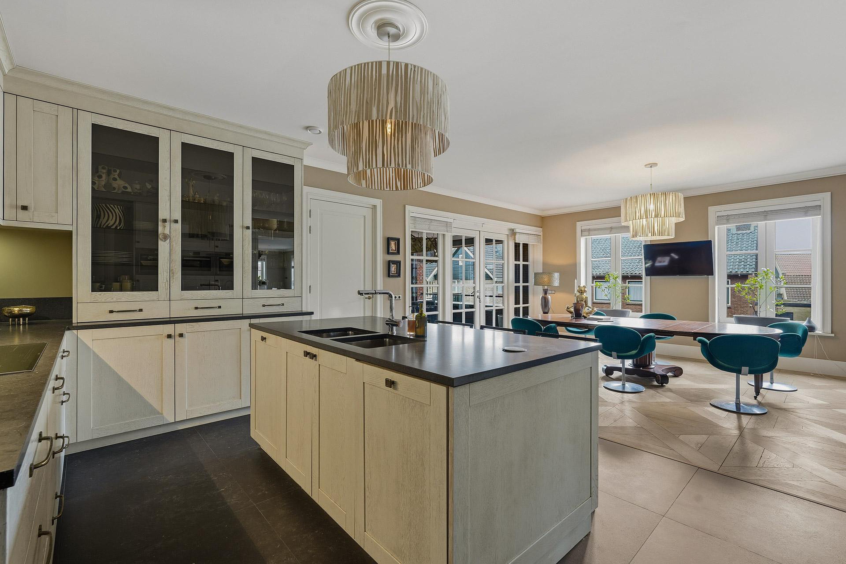 -Riante woonkeuken voorzien van o.a. inductiekookplaat, afzuigkap, vaatwasser, koelkast, vriezer, stoomoven, oven, magnetron, kookeiland met dubbele spoelbak en TV-aansluiting;