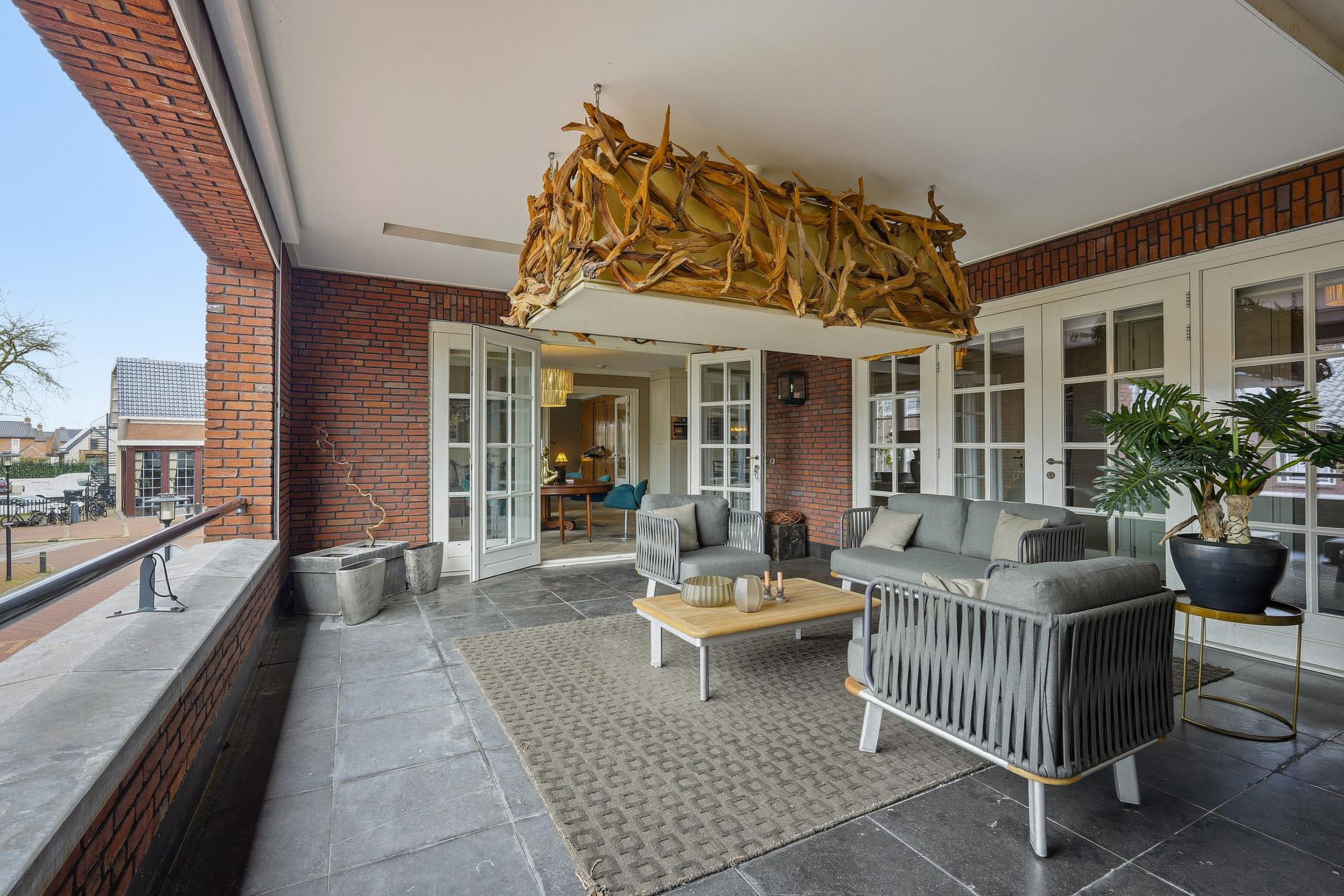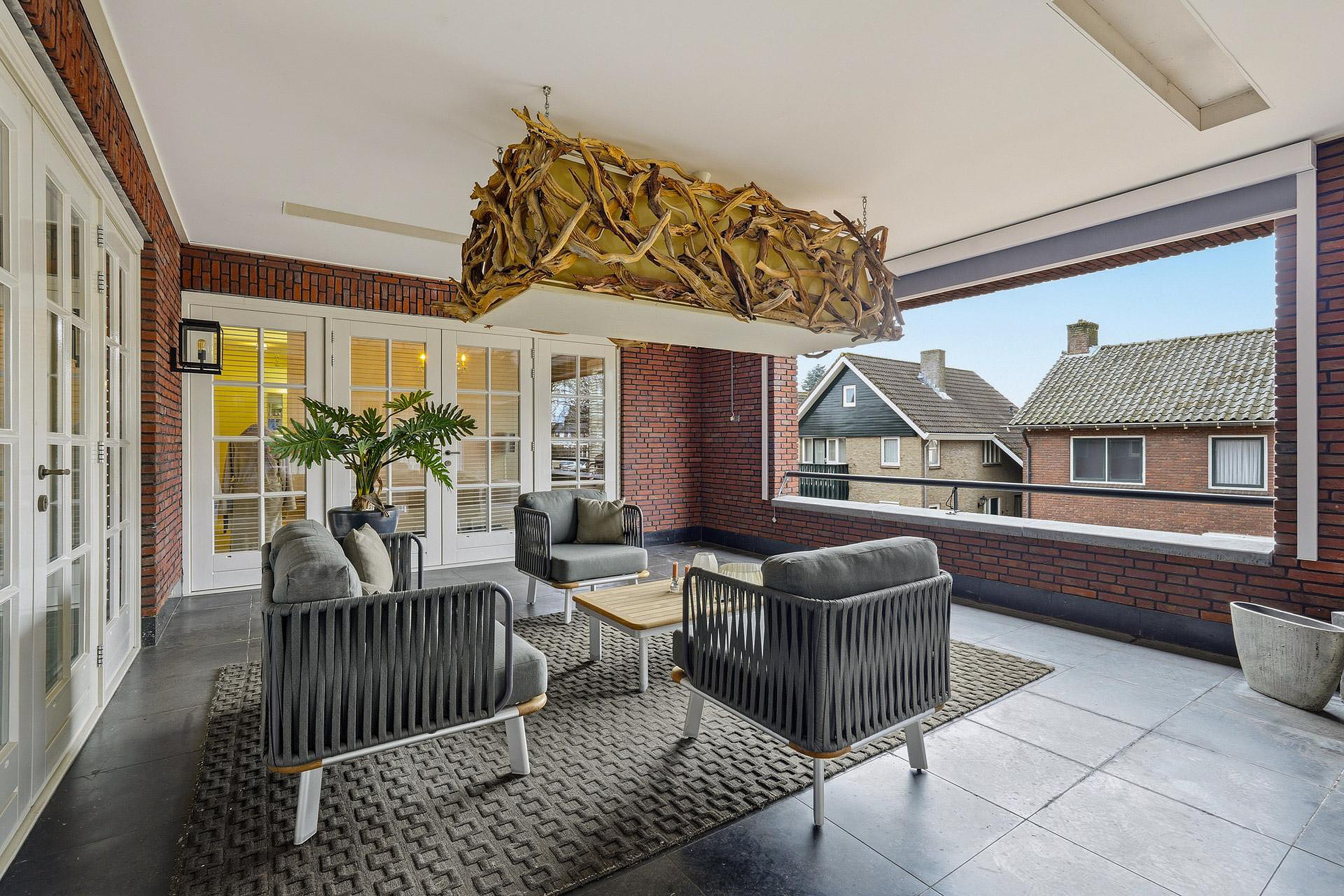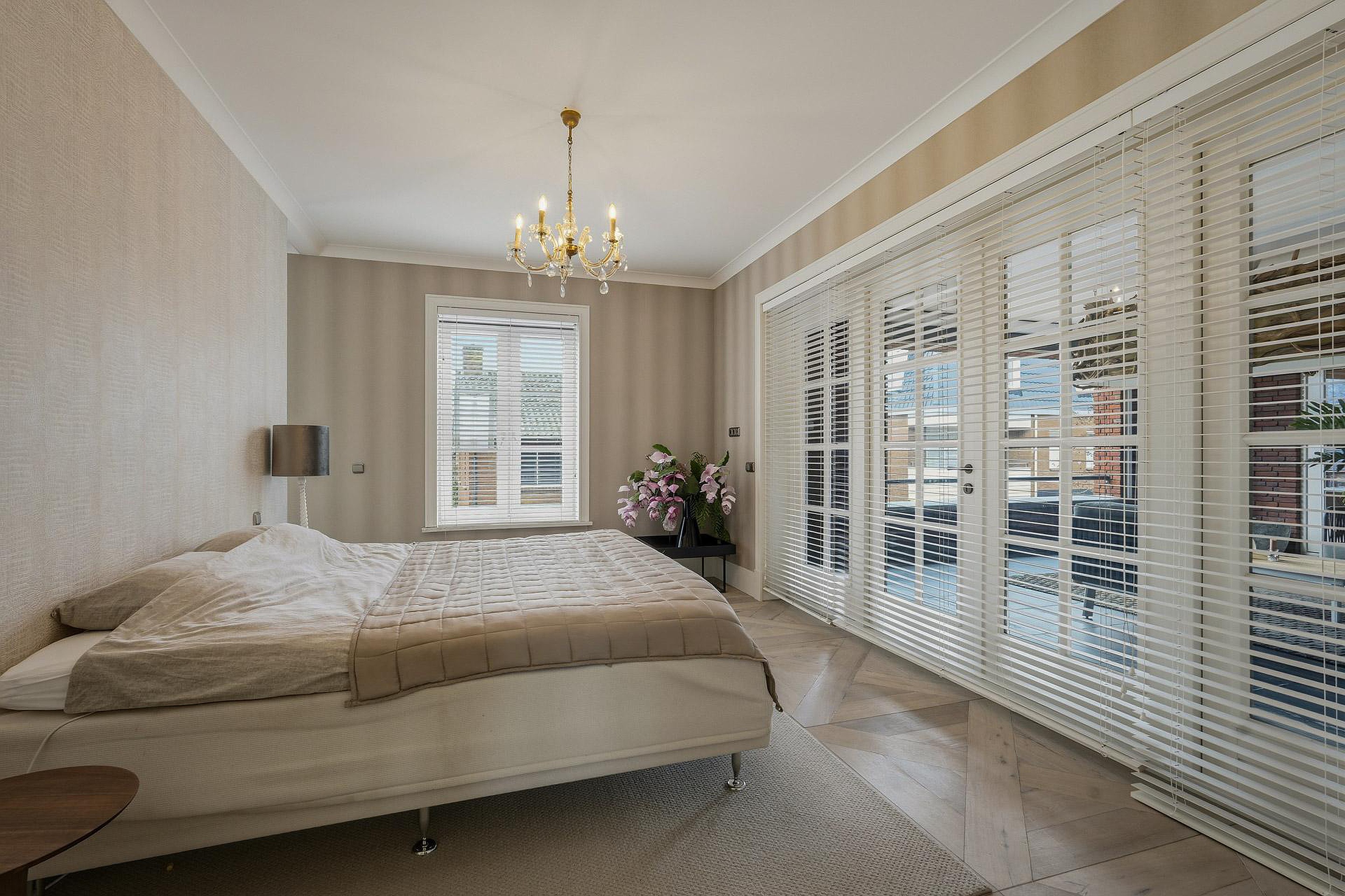 -Veel natuurlijke lichtinval door grote, laag geplaatste raampartijen met luxe raamdecoratie;