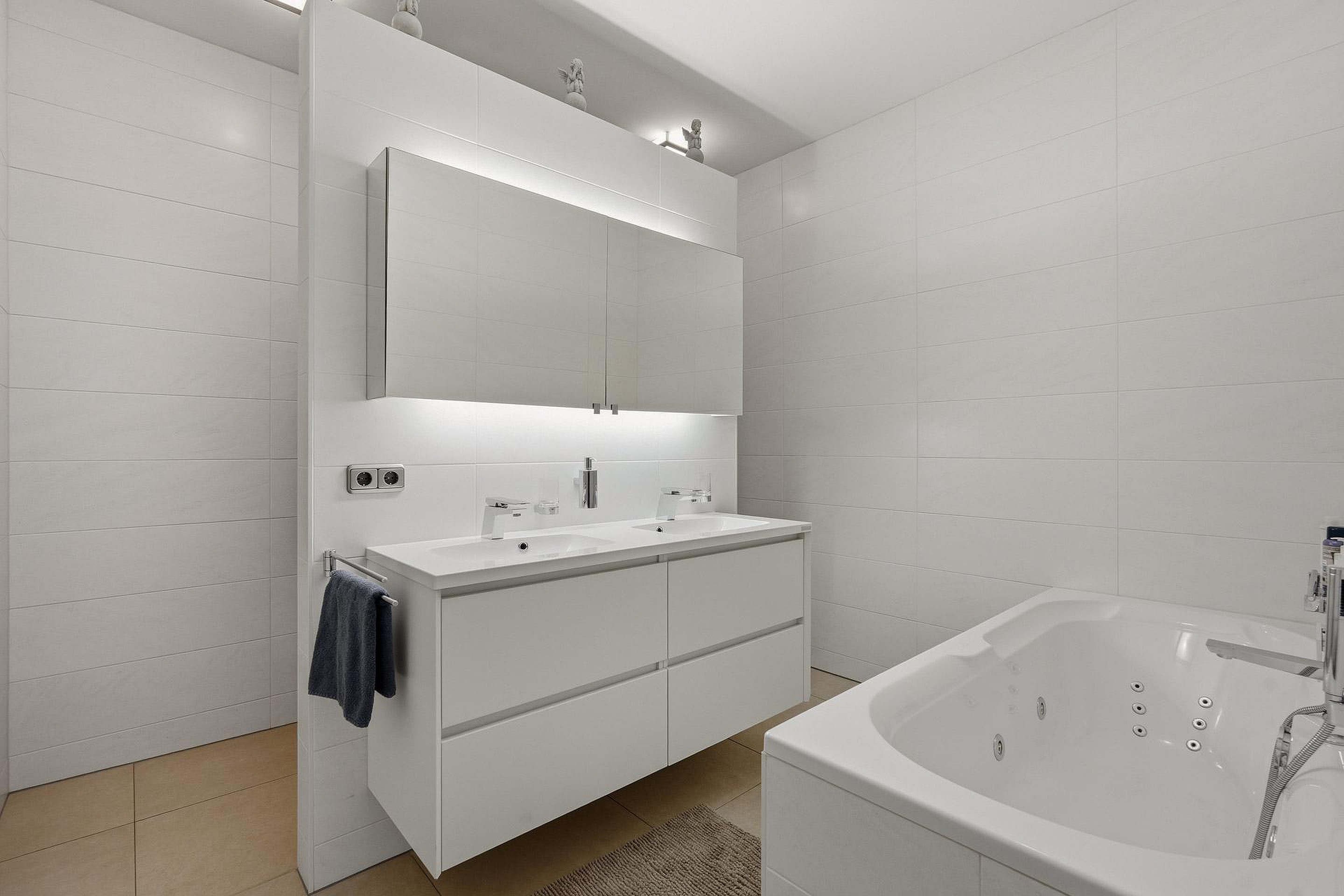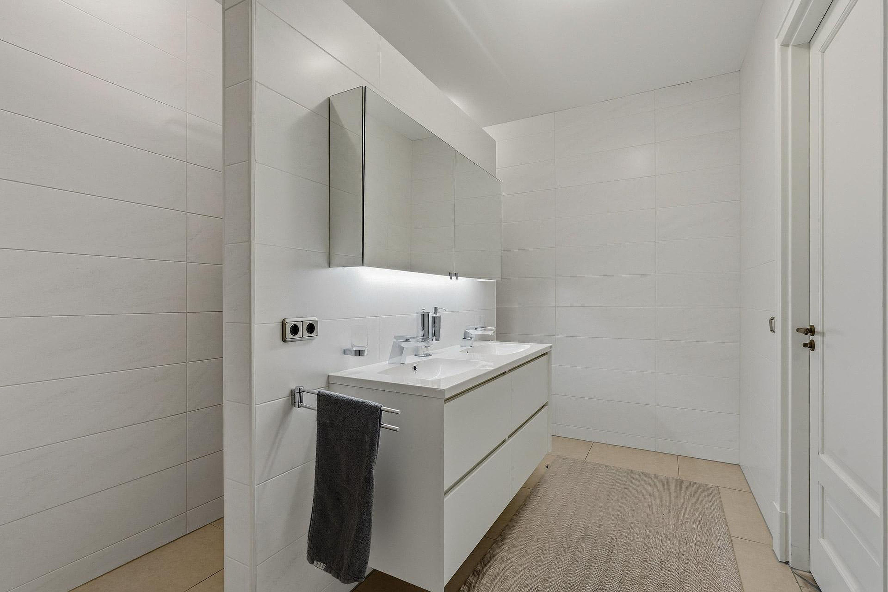 Aan de linkerzijde zijn twee ruime slaapkamers gesitueerd, beide uitgevoerd als comfortabele suites met een eigen badkamer. Eén slaapkamer beschikt over vaste kasten en een badkamer met inloopdouche, toilet en dubbele wastafel in meubel, terwijl de tweede slaapkamer is voorzien van een inloopkast en een badkamer met ligbad, inloopdouche, toilet en een dubbele wastafel in meubel.