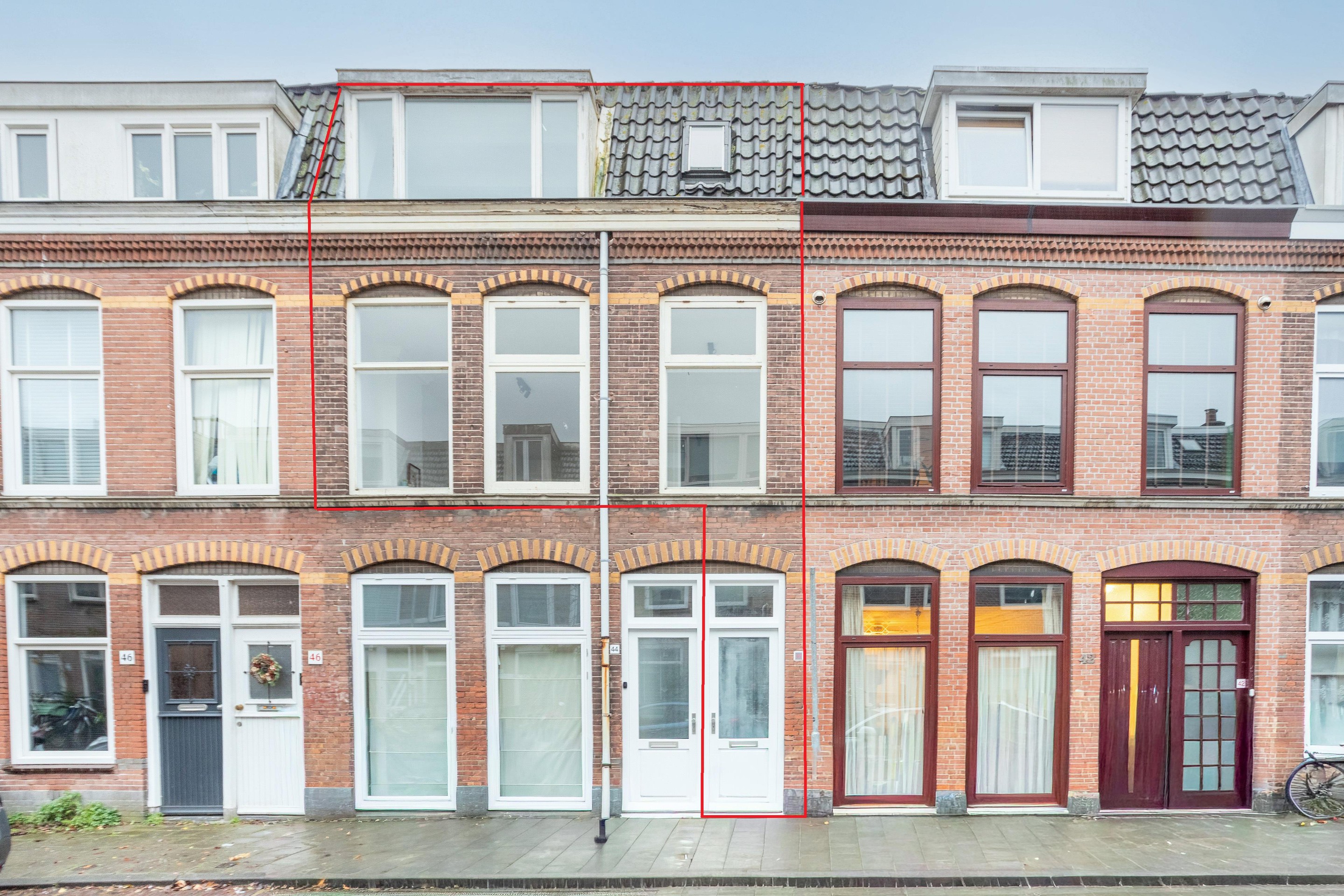 Through the front door you enter the hallway with the meter cupboard and a straight carpeted staircase leading to the first floor. Upon arrival, note the charming façade details such as the arch above the front door and the brick corbel work under the gutter.