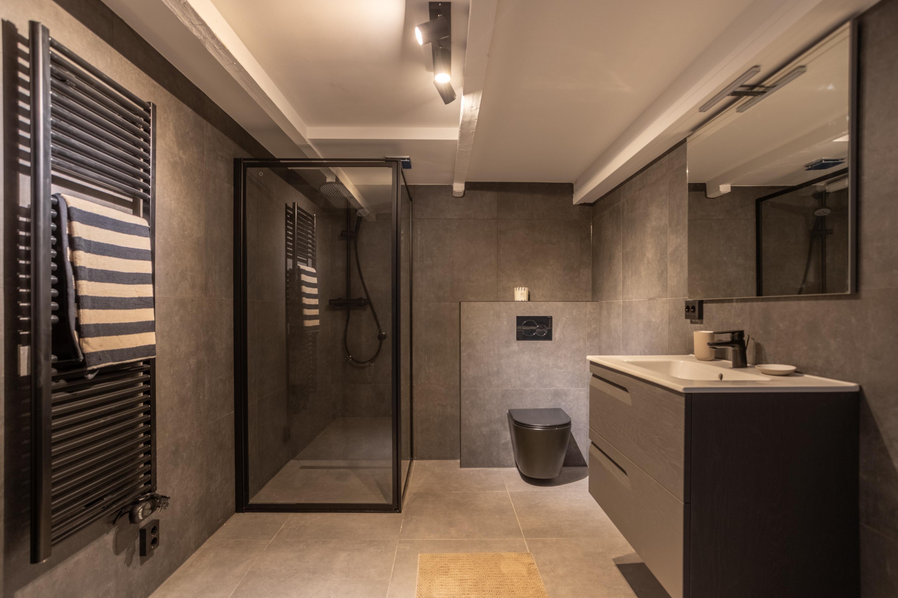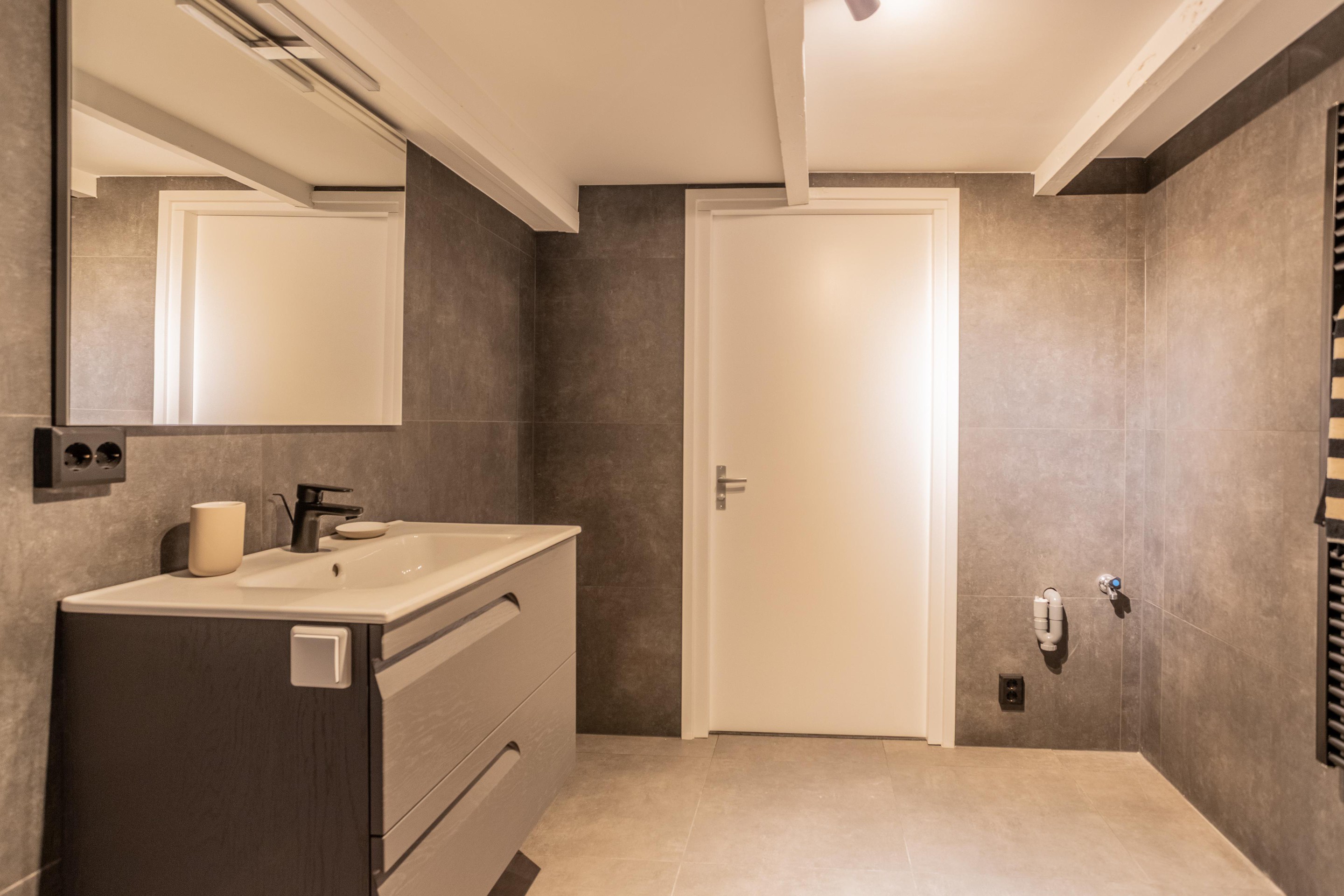 De nieuwe ruime badkamer is volledig betegeld en heeft een hangend toilet, een inloopdouche, designradiator en een wastafel met spiegel en onderkast. Tevens is hier de opstelplaats voor de wasmachine en de droger.