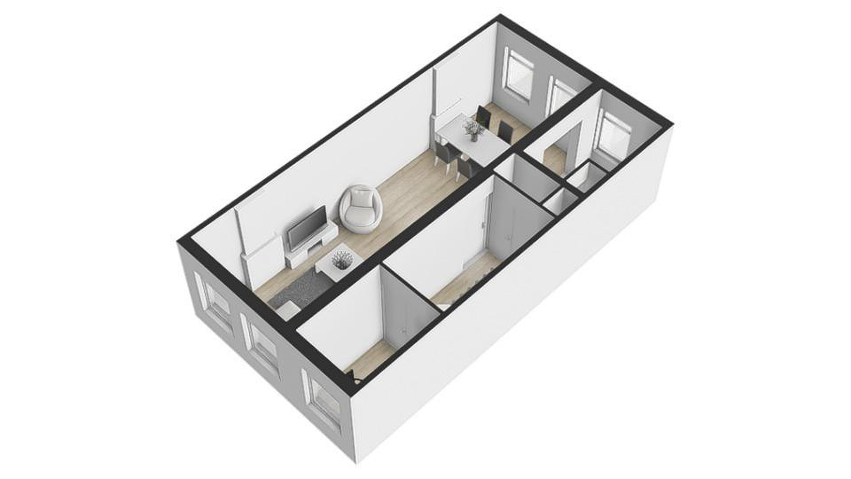 The toilet room is neatly tiled and equipped with a wall-mounted toilet and small sink. At the front is the spacious and bright living room, fitted with a beautiful laminate floor.
