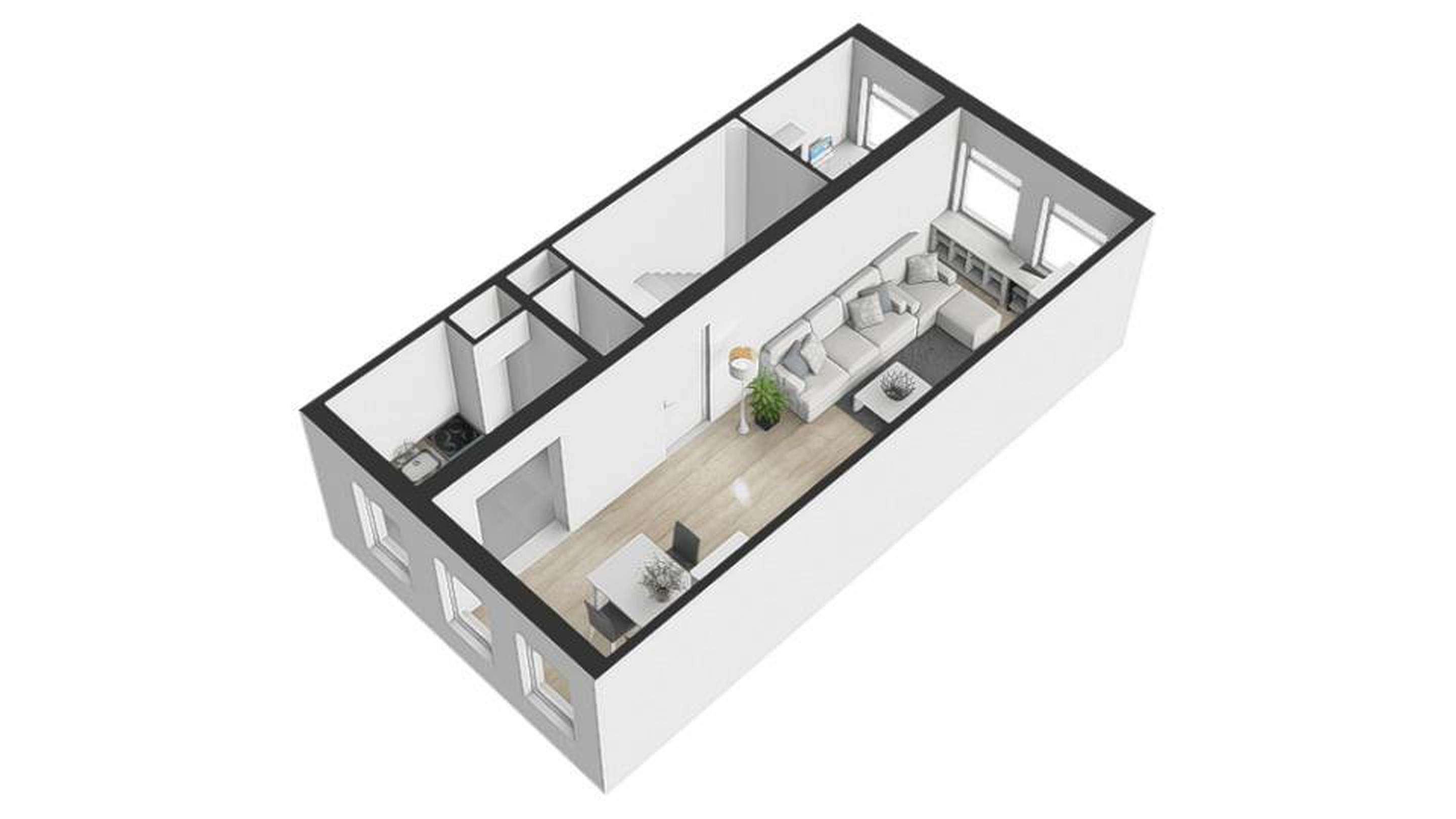 Landing with access to the toilet room, door to the living room with open kitchen, door to the first (bed)room, and stairs to the second floor.