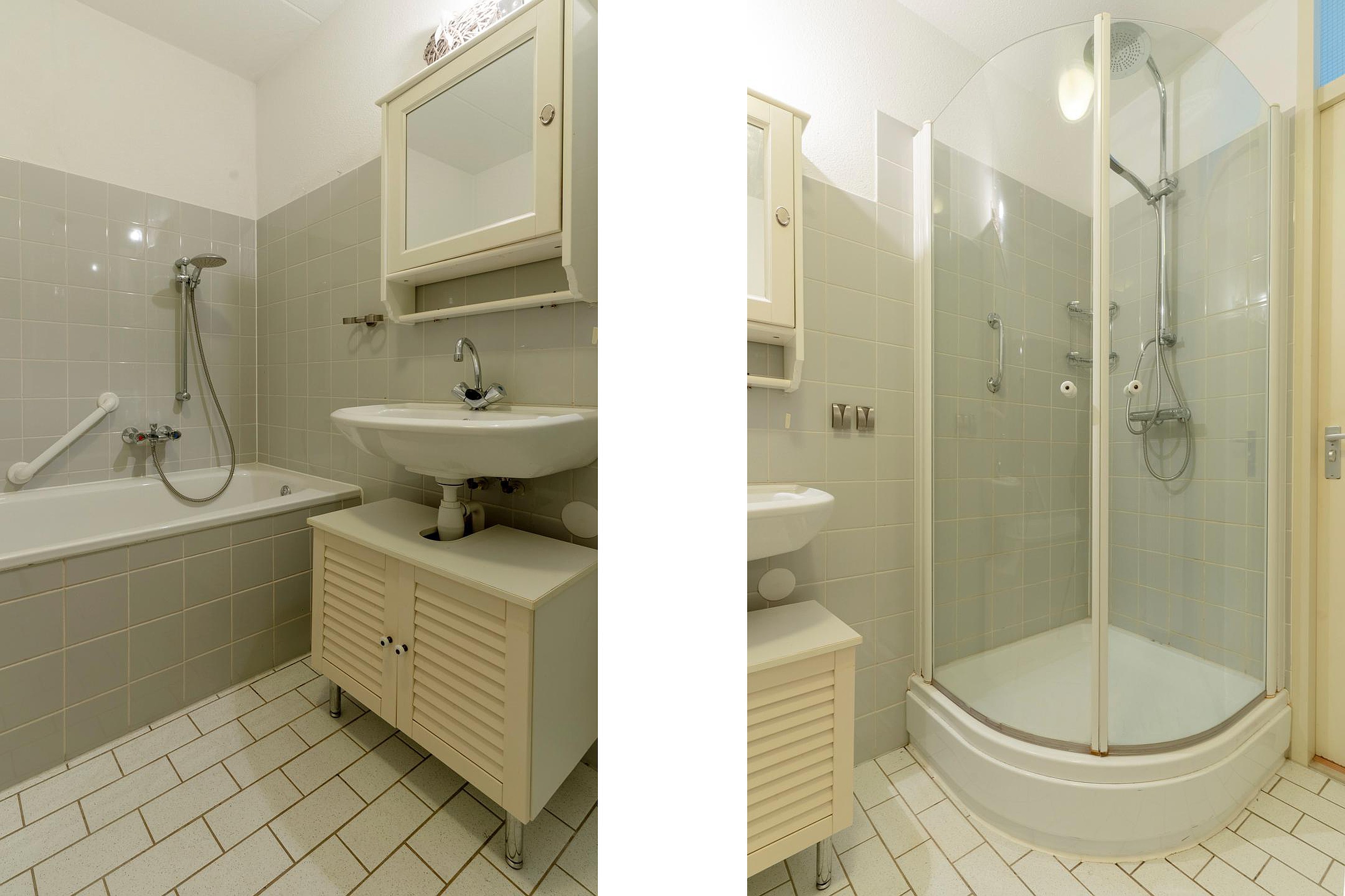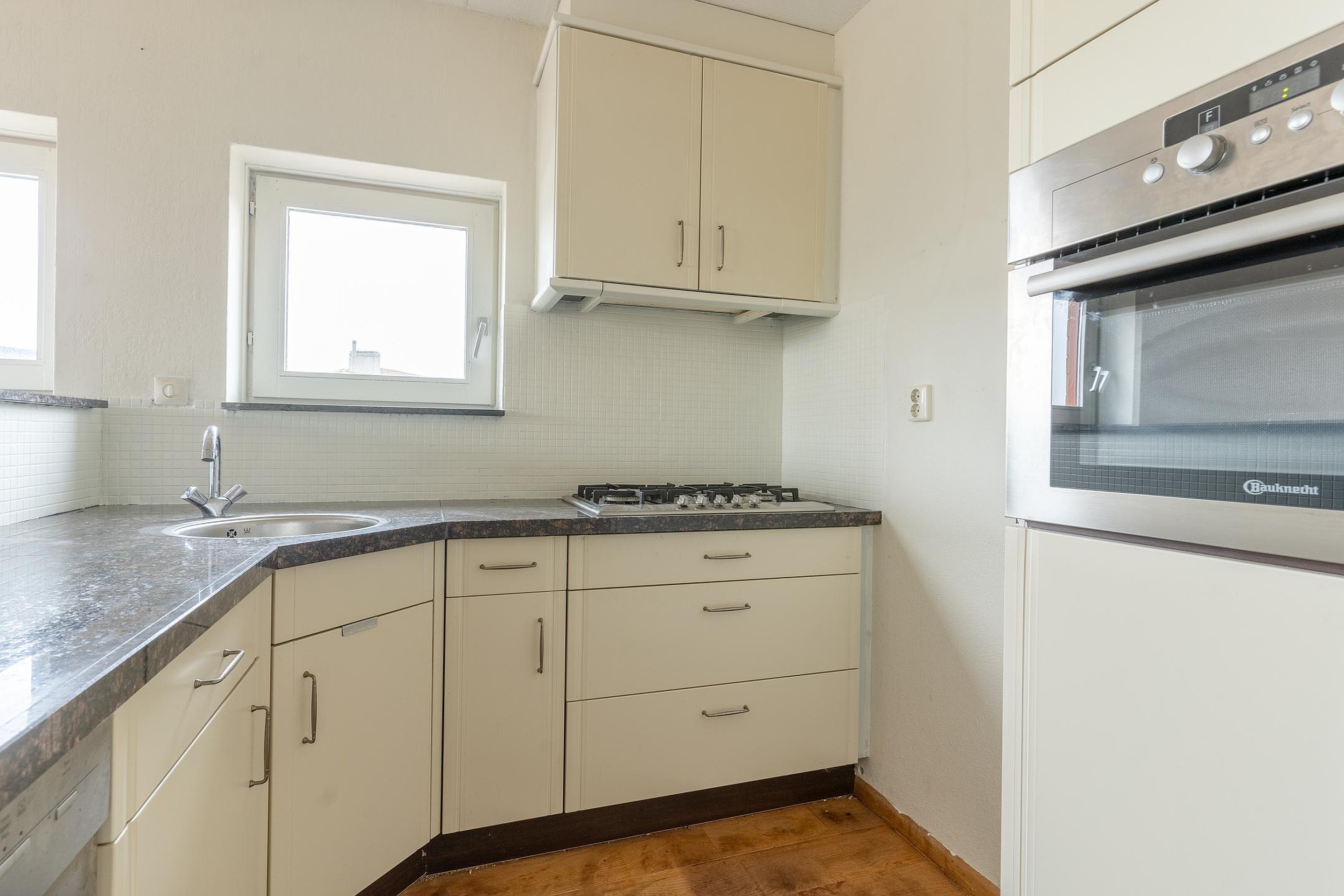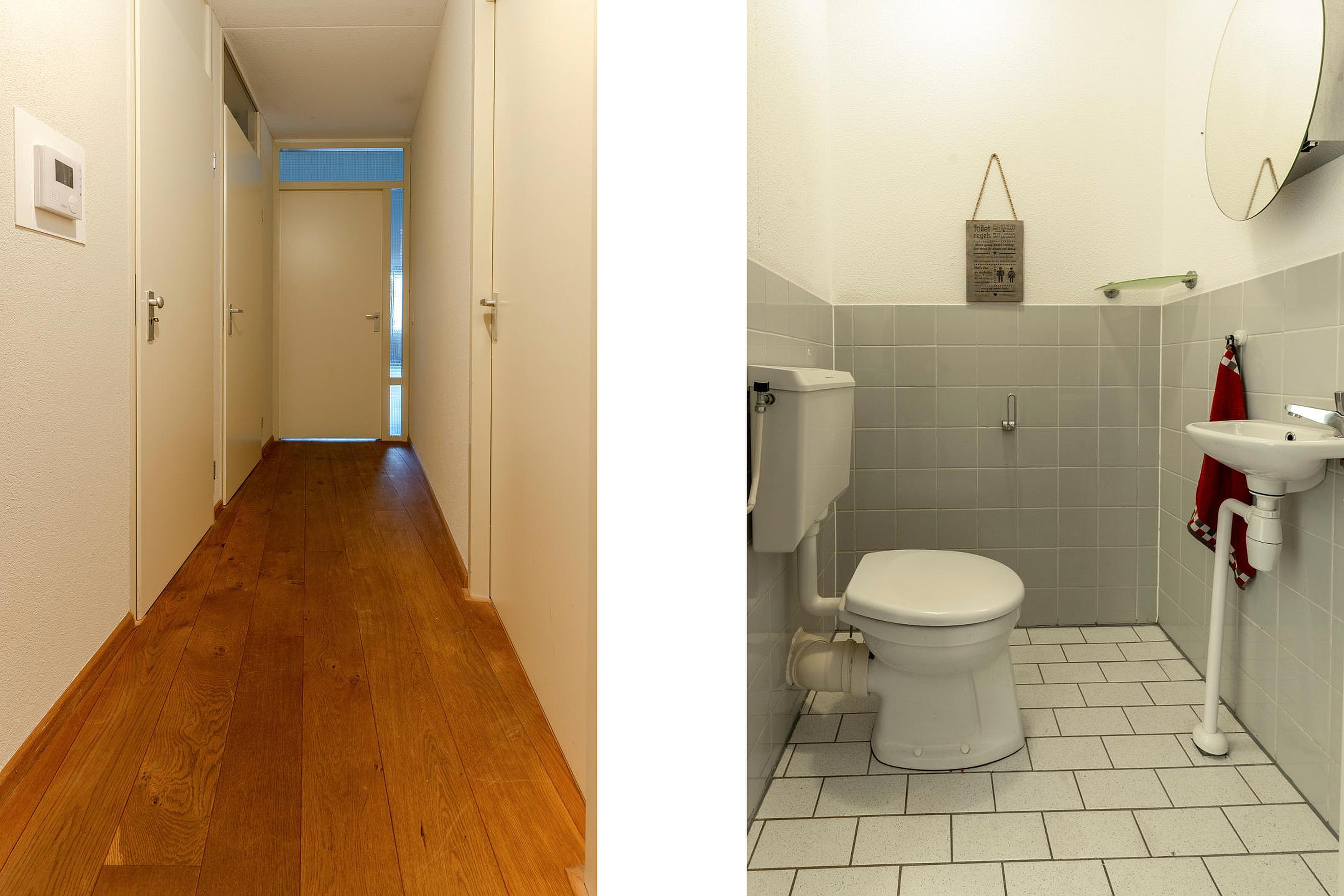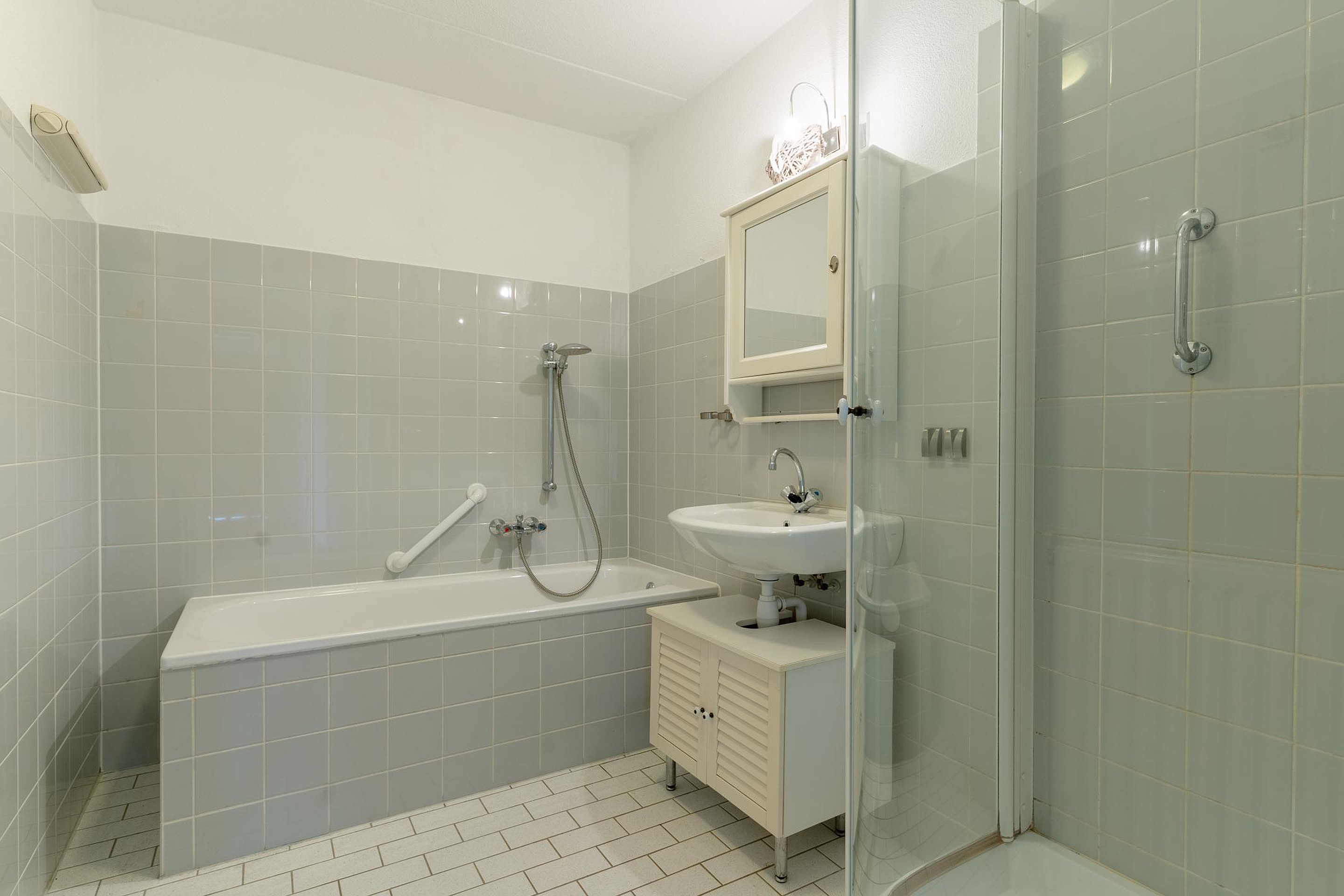hal, licht betegelde badkamer voorzien van douchecabine, ligbad en wastafel. 2 ruime slaapkamers, afzonderlijk toilet, inpandige berging met opstelling van de c.v. combiketel en ruimte voor de was apparatuur, royale woonkamer met voorraadkast, open keuken en toegang tot het overdekte balkon.
