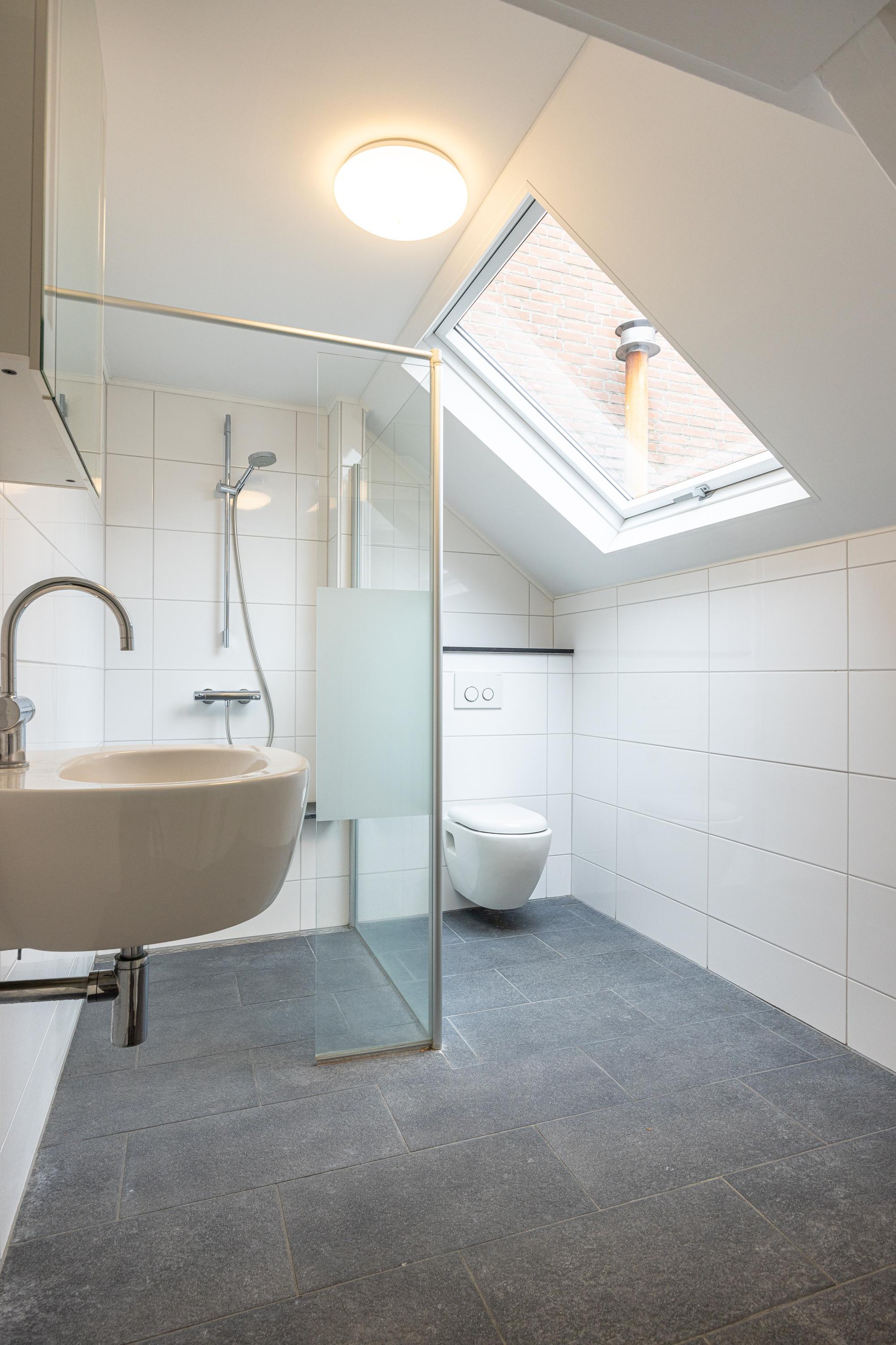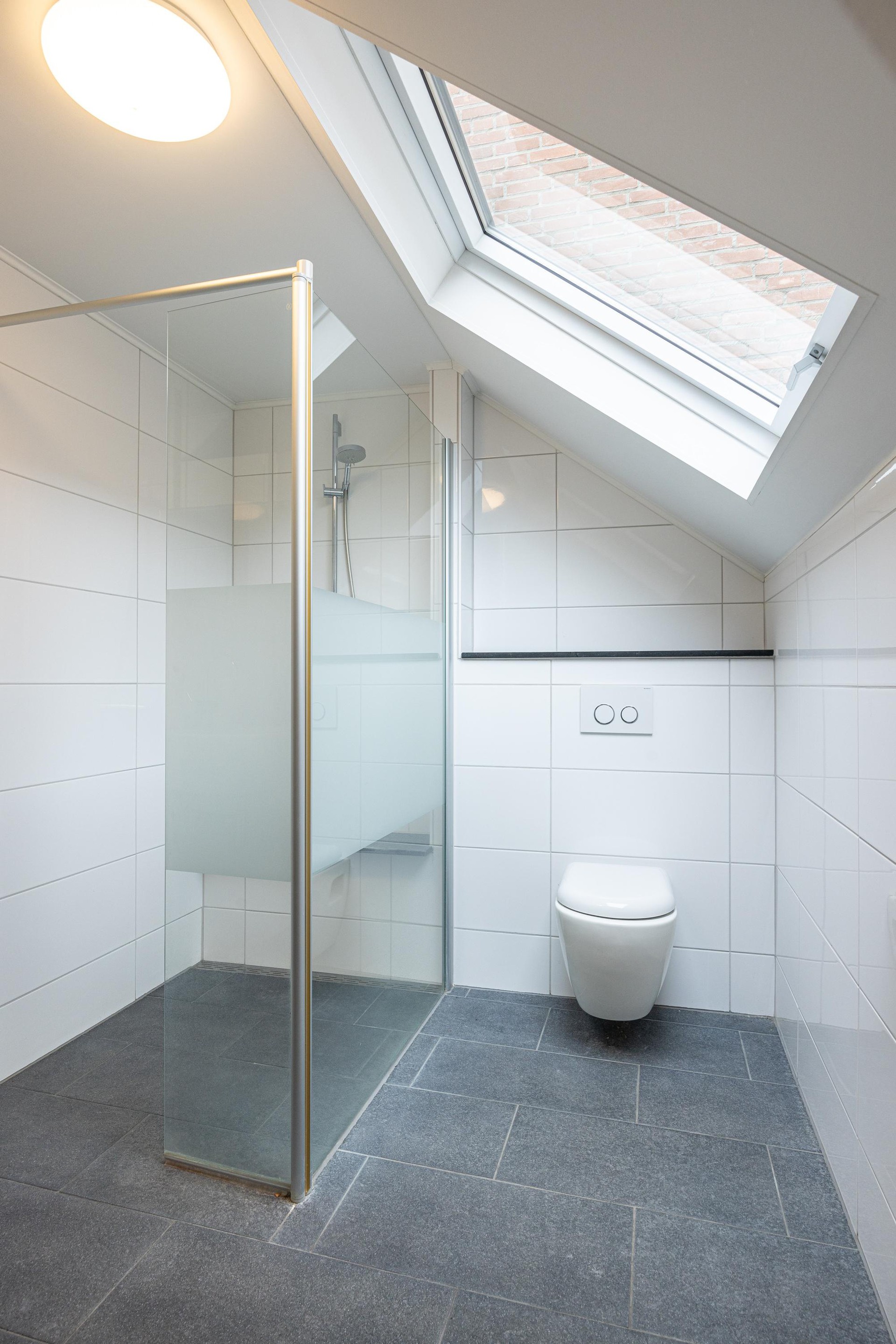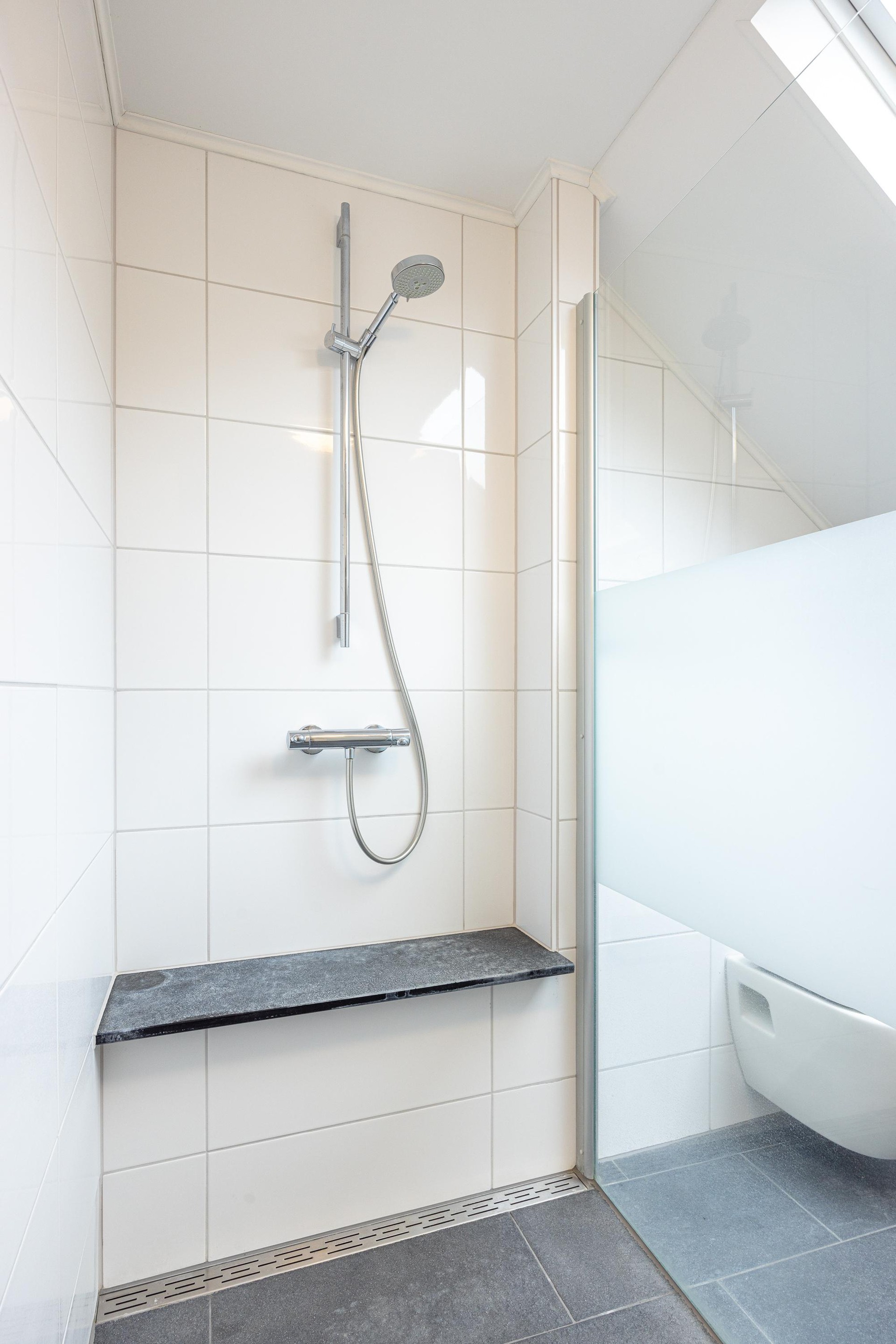 De badkamer is netjes afgewerkt, volledig betegeld en ingericht met een inloopdouche met glazen douchewand, een wastafel met verlichte spiegel en een toilet.
