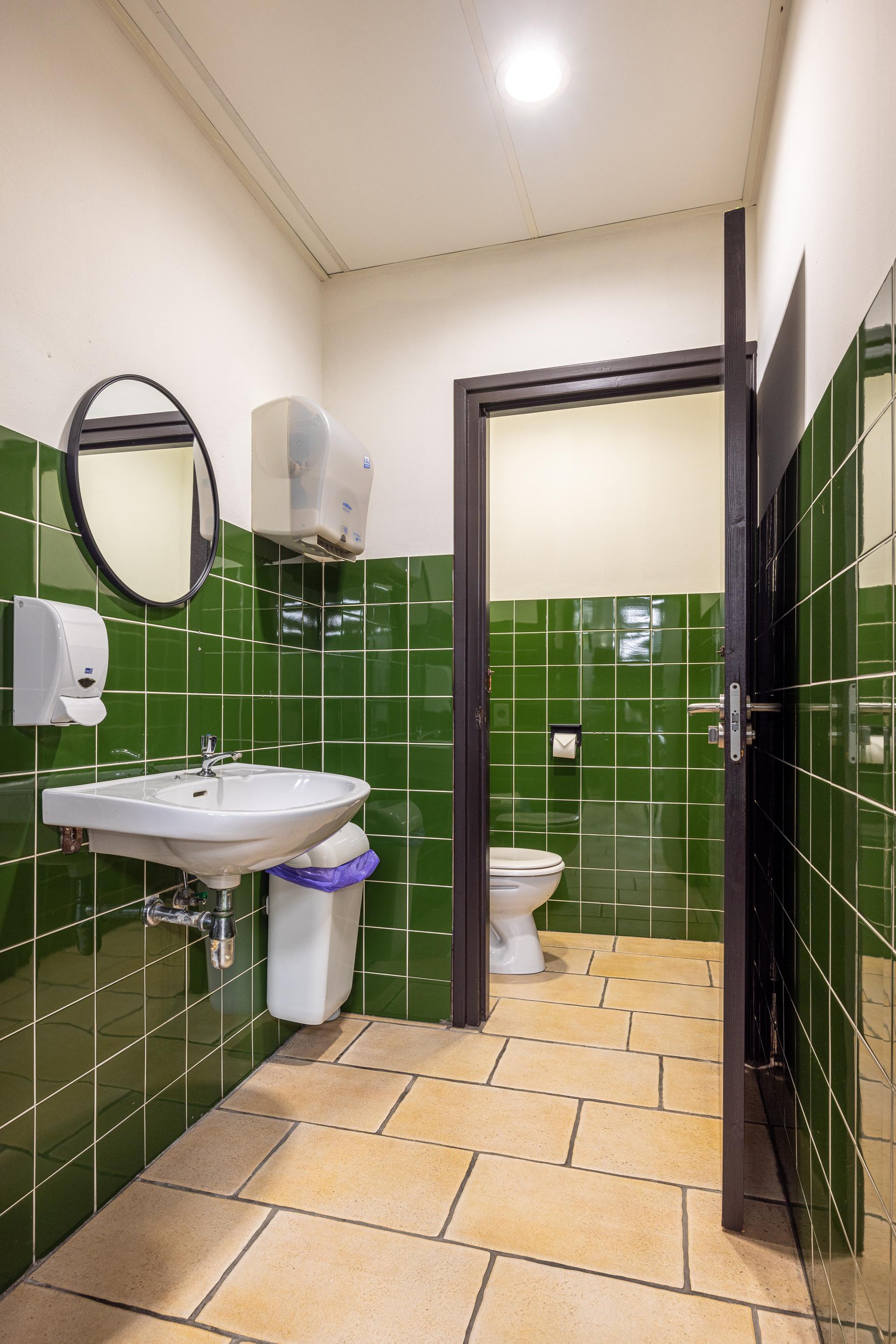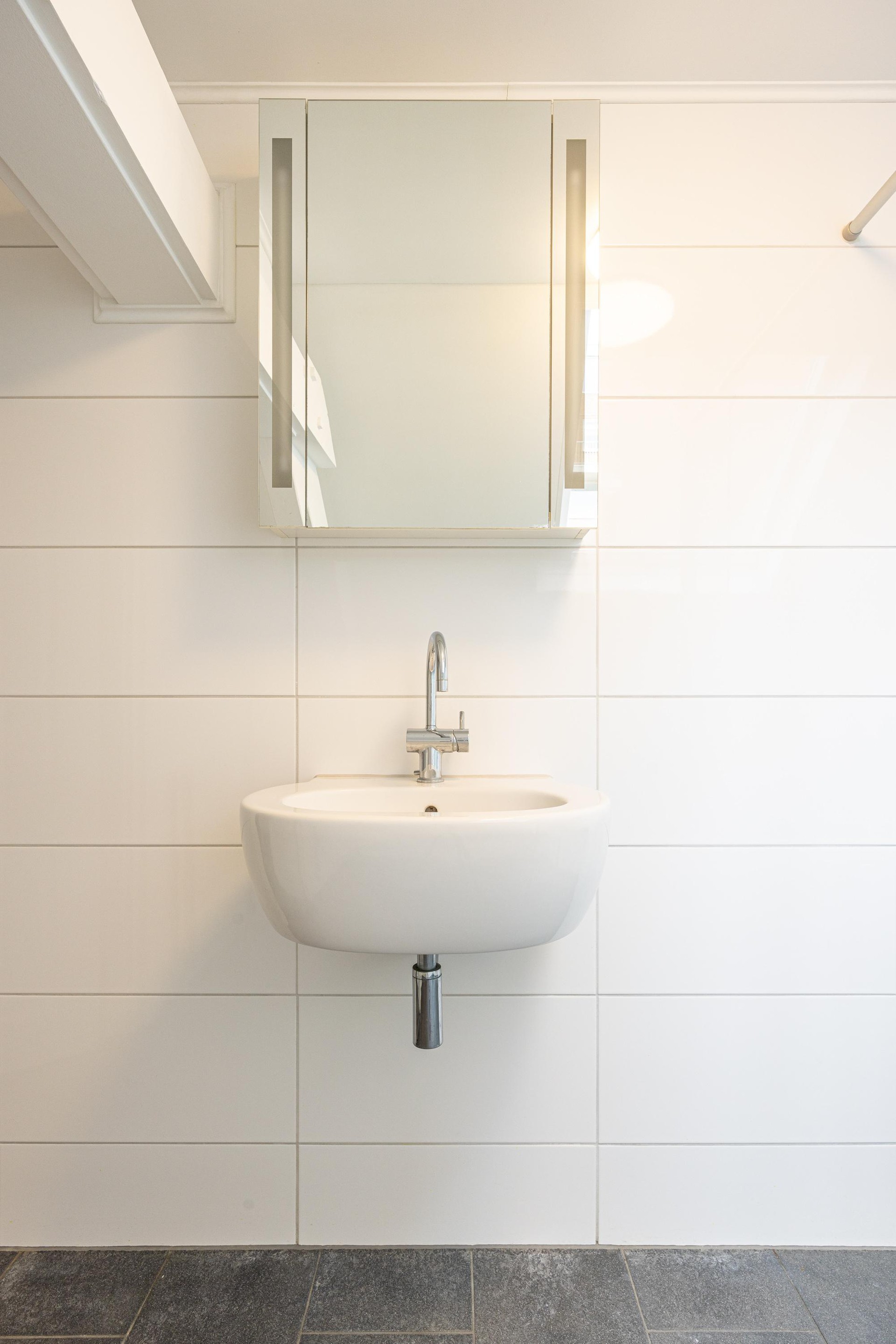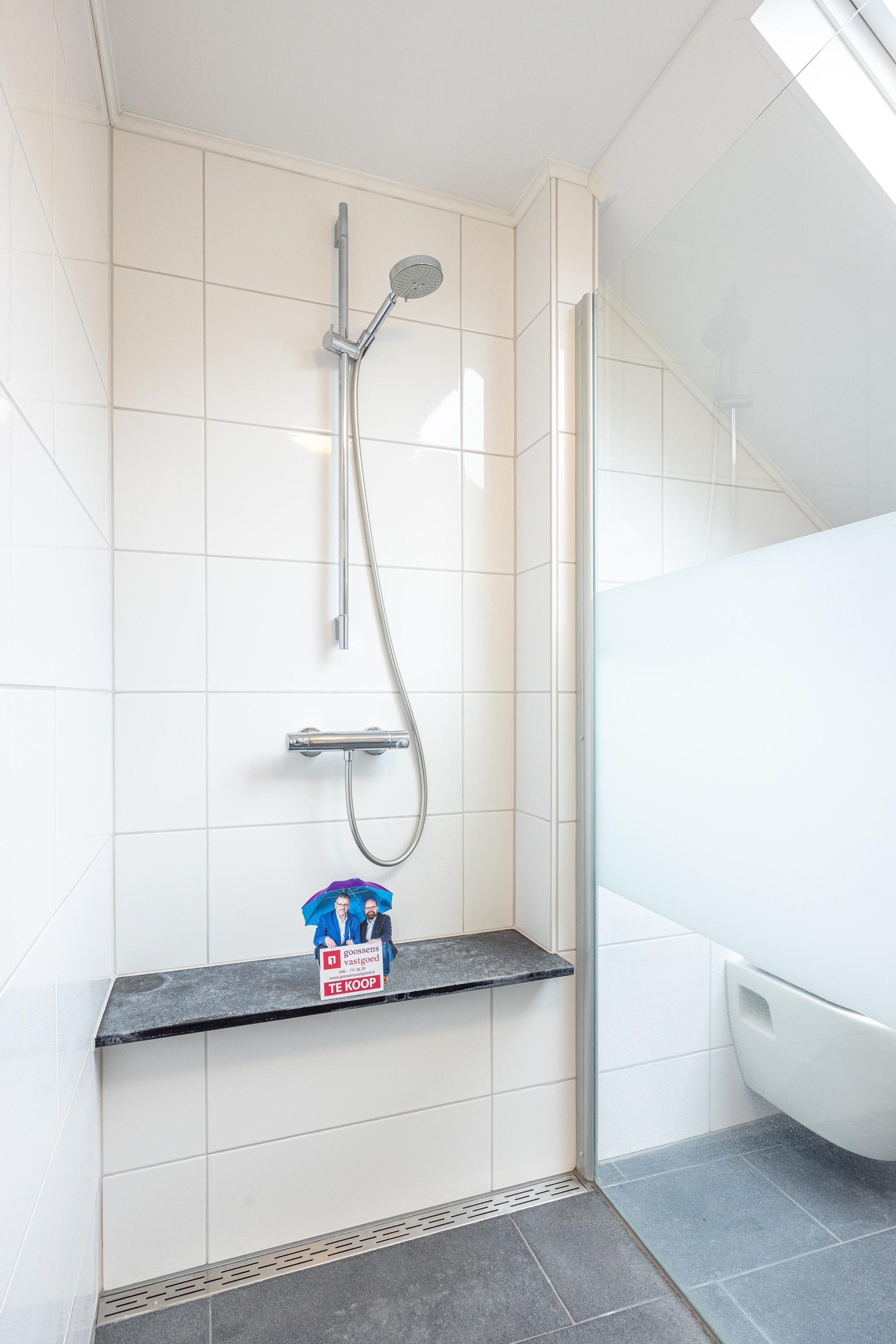 De badkamer is netjes afgewerkt, volledig betegeld en ingericht met een inloopdouche met glazen douchewand, een wastafel met verlichte spiegel en een toilet.