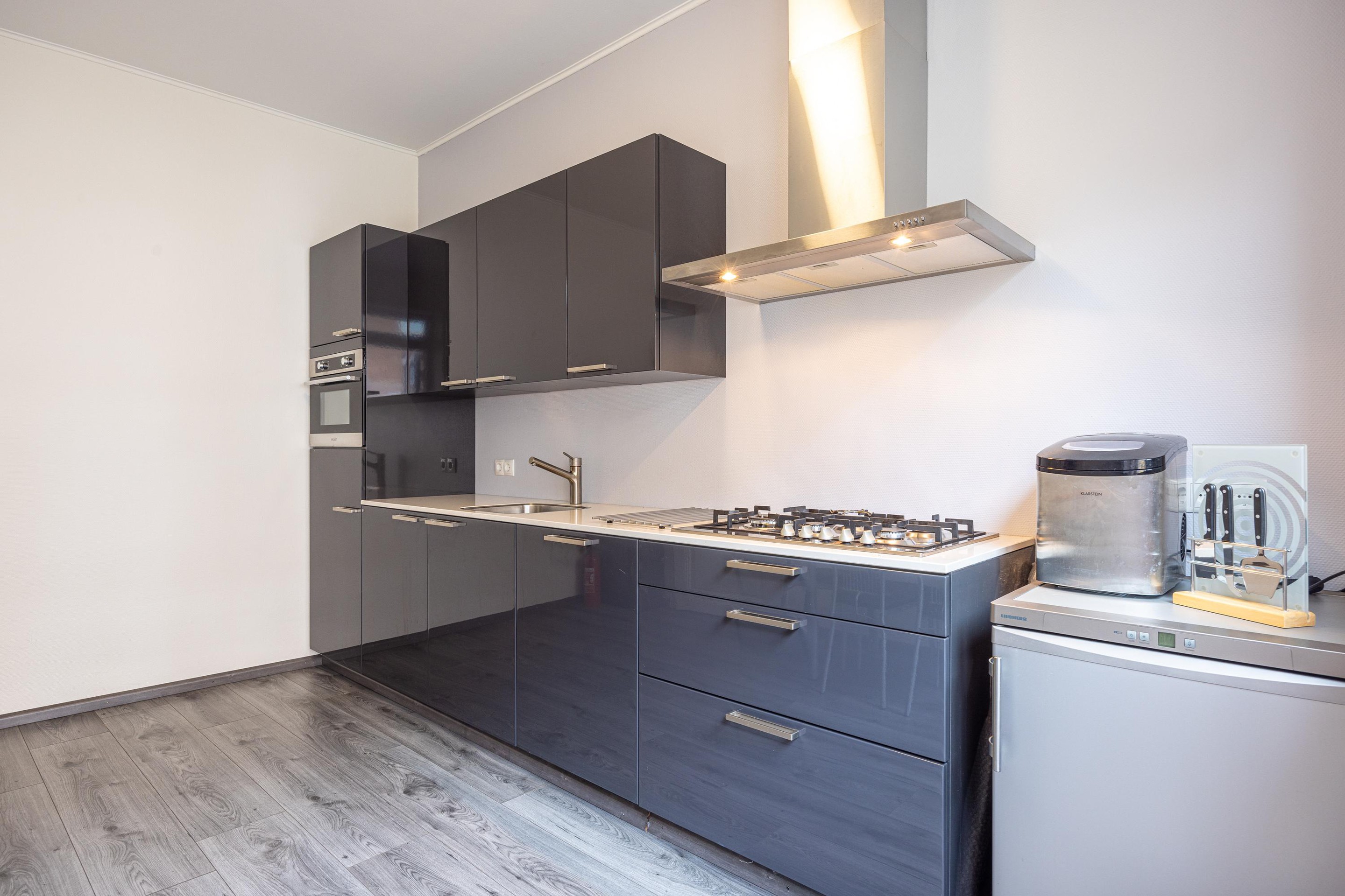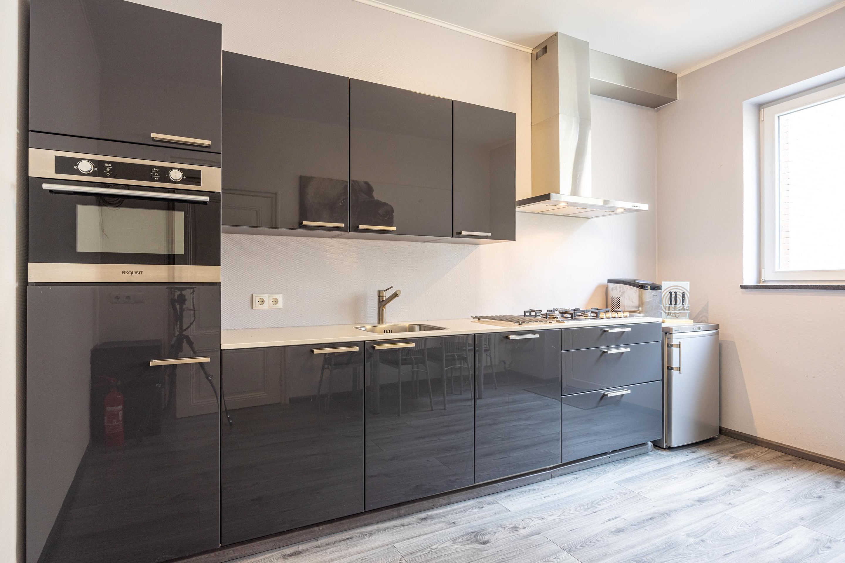 Eerste verdieping Het appartement is bereikbaar via een eigen ingang, wat zorgt voor privacy en een duidelijke scheiding tussen wonen en werken. Op de eerste verdieping kom je uit op de overloop, waar zich een toiletruimte bevindt. Vanuit hier is er toegang tot een veelzijdige ruimte die momenteel in gebruik is als klaslokaal met aangrenzende kantoorruimte. Deze ruimte leent zich uitstekend voor herinrichting en kan met beperkte aanpassingen eenvoudig worden omgevormd tot een comfortabele woonkamer of slaapkamer. Via een tussenportaal met trappenhal is de gesloten keuken bereikbaar. De keuken is praktisch ingericht en beschikt over veel kastruimte en diverse inbouwapparatuur, waaronder een halogeen kookplaat (op de foto hieronder zie je een gaskookplaat, deze is vernieuwd), afzuigkap, combi heteluchtoven, koelkast en vaatwasser.