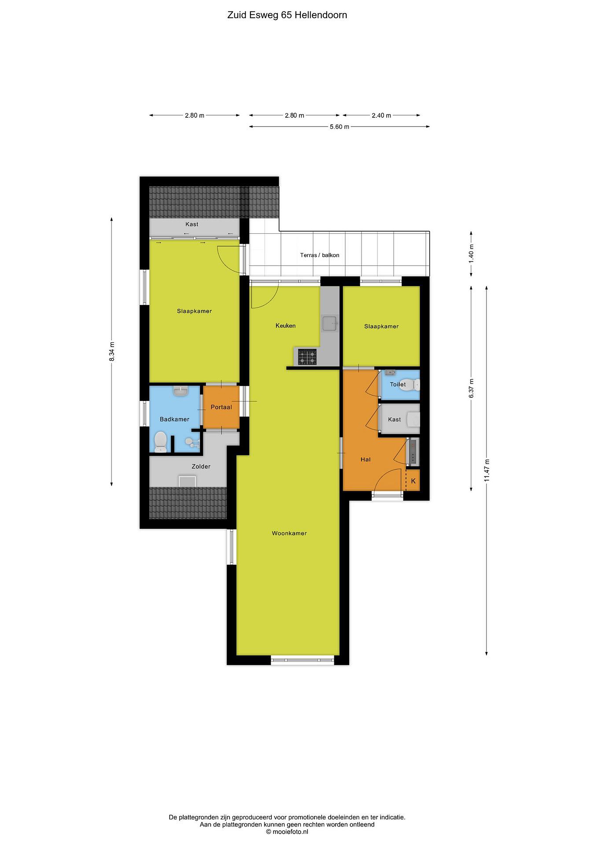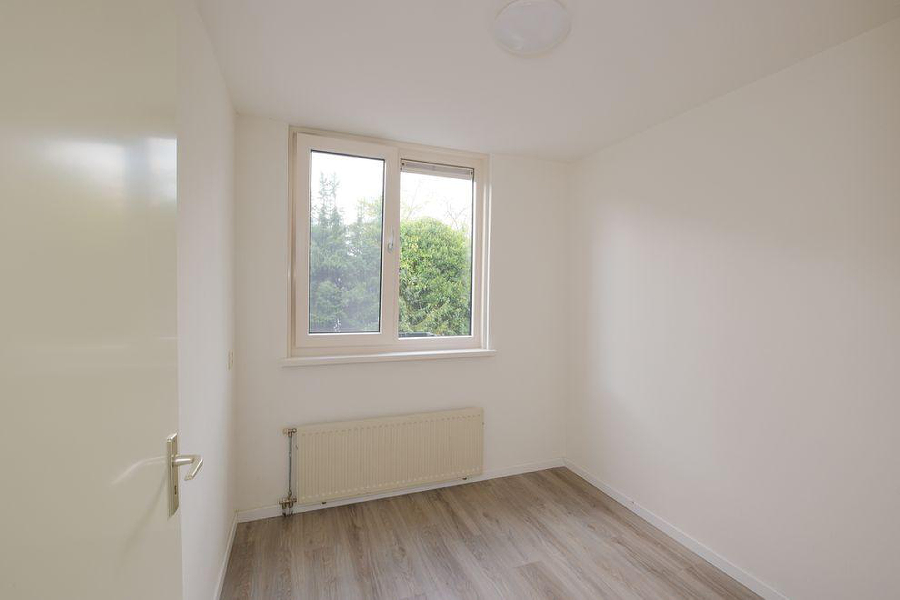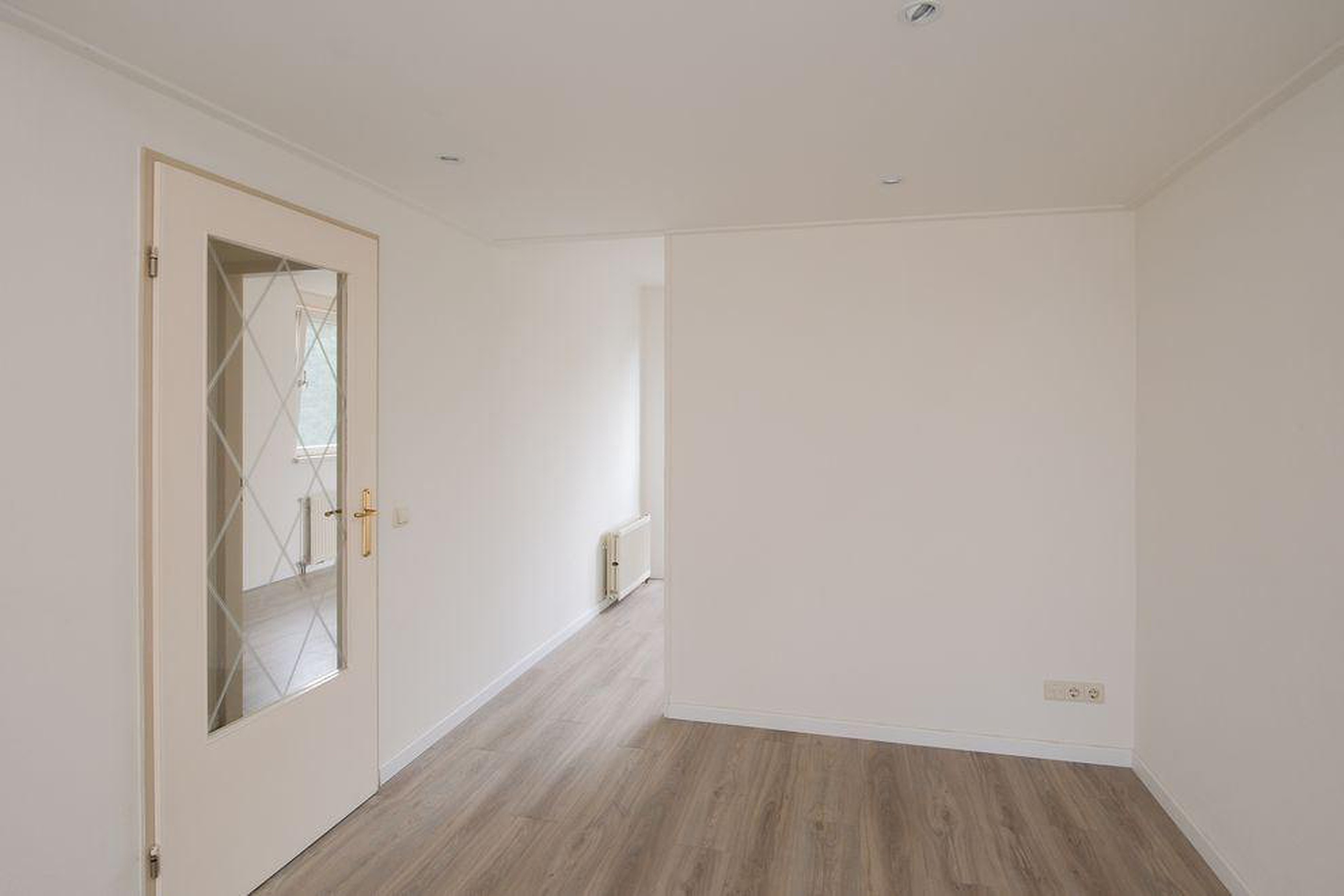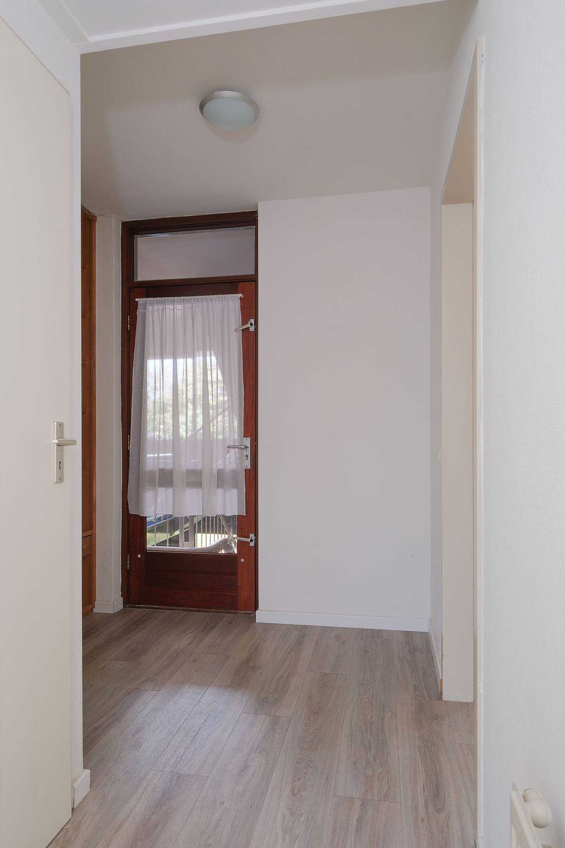 Daarnaast geeft de hal toegang tot een slaap-/hobbykamer. De woonkamer leidt naar een portaal dat toegang biedt tot de ruime slaapkamer en de badkamer.