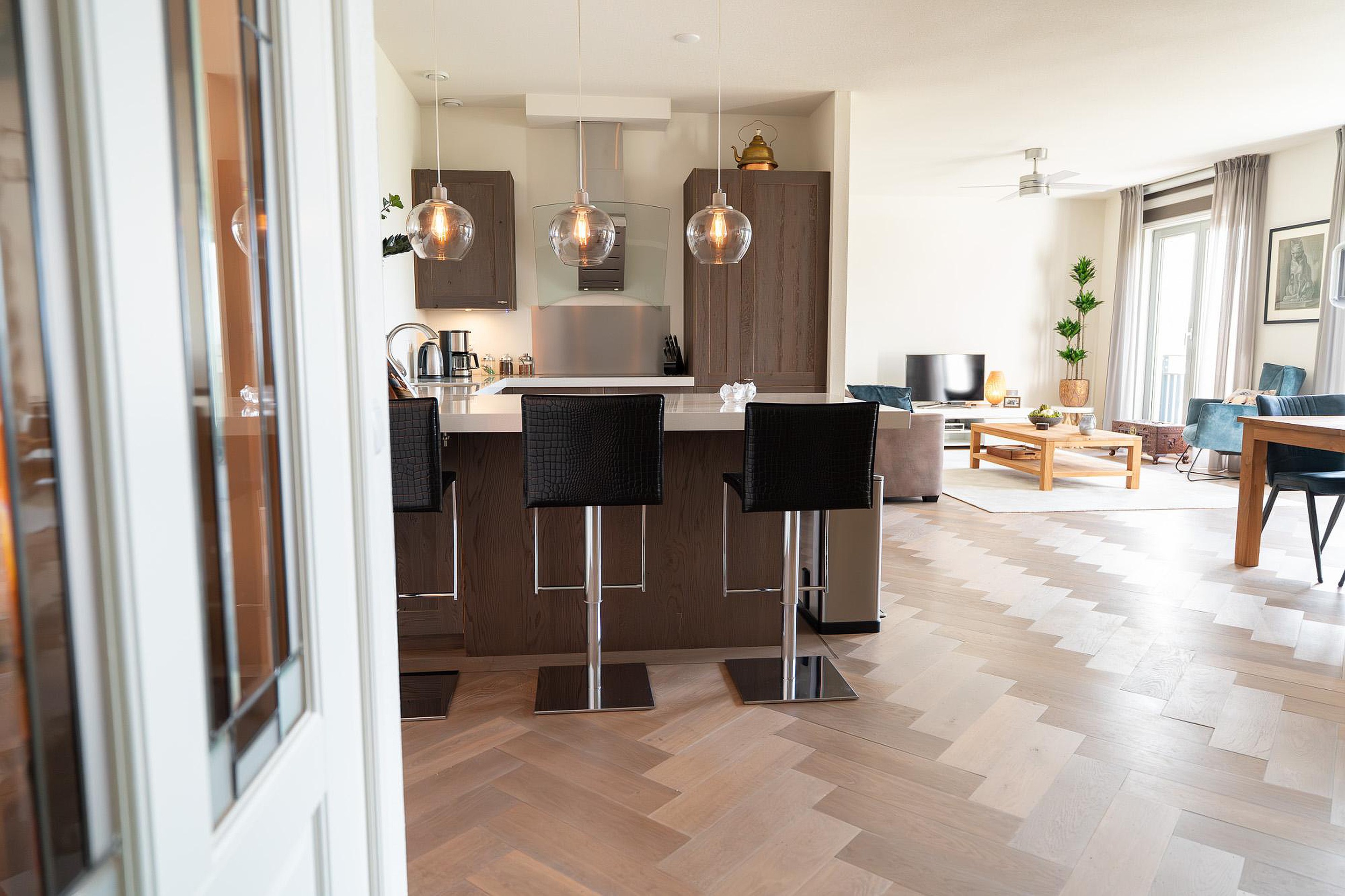 De open keuken is een luxe U-opstelling met een kookeiland dat tevens als bar dient. De houten fronten en het composiet werkblad creëren een stijlvolle en warme ambiance. De keuken is voorzien van hoogwaardige Miele inbouwapparatuur, waaronder een vaatwasser, combi-magnetron, stoomoven, koelkast en vriezer, waardoor koken hier een waar genot is.