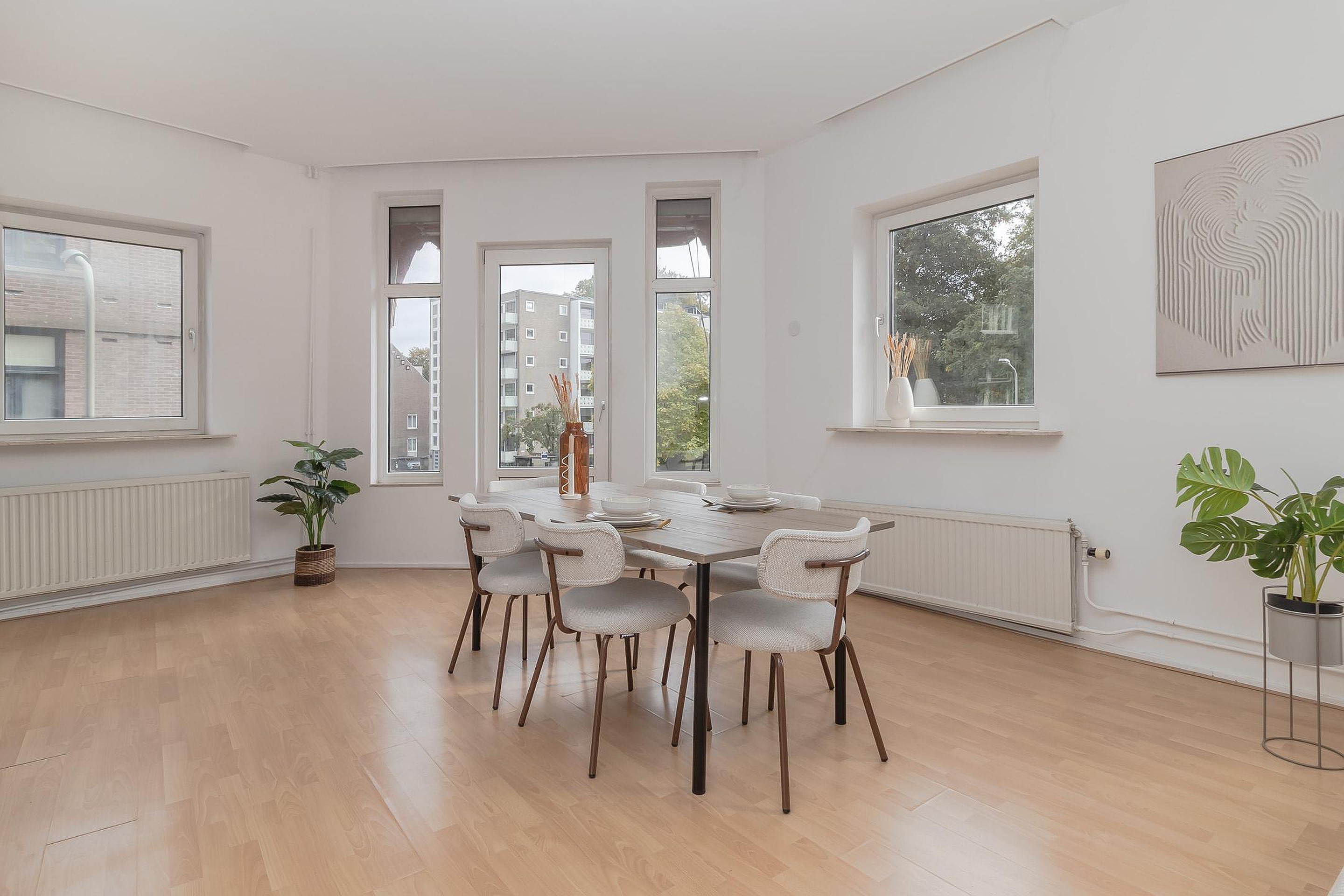 De gehele eerste verdieping is in gebruik als woonverdieping. Bij binnenkomst valt direct de royale en lichte woonkamer (35m2) op met klein balkon aan de voorzijde. De hoge plafonds van maar liefst 2,90 meter versterken het ruimtelijke gevoel en de grote ramen zorgen voor een aangename hoeveelheid daglicht. De woonkamer biedt voldoende ruimte voor zowel een comfortabele zithoek als een eethoek.