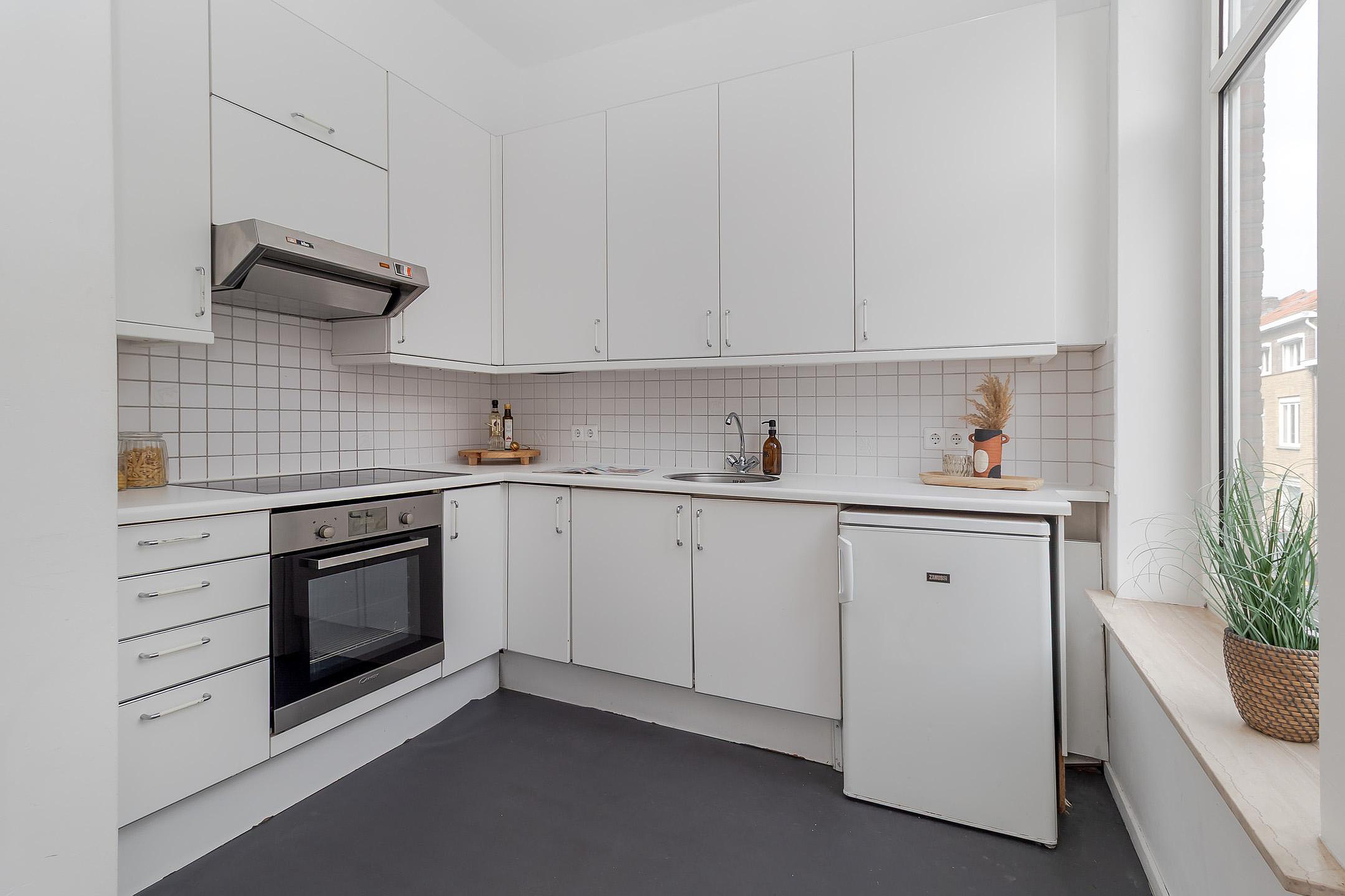 De eenvoudige open keuken (6m2) in hoekopstelling sluit naadloos aan op het woongedeelte en is voorzien van diverse (inbouw)apparatuur, te weten: een 4-pits inductiekookplaat met afzuigkap, oven koelkast en een spoelbak. De keuken is praktisch ingedeeld en biedt voldoende werk- en kastruimte.