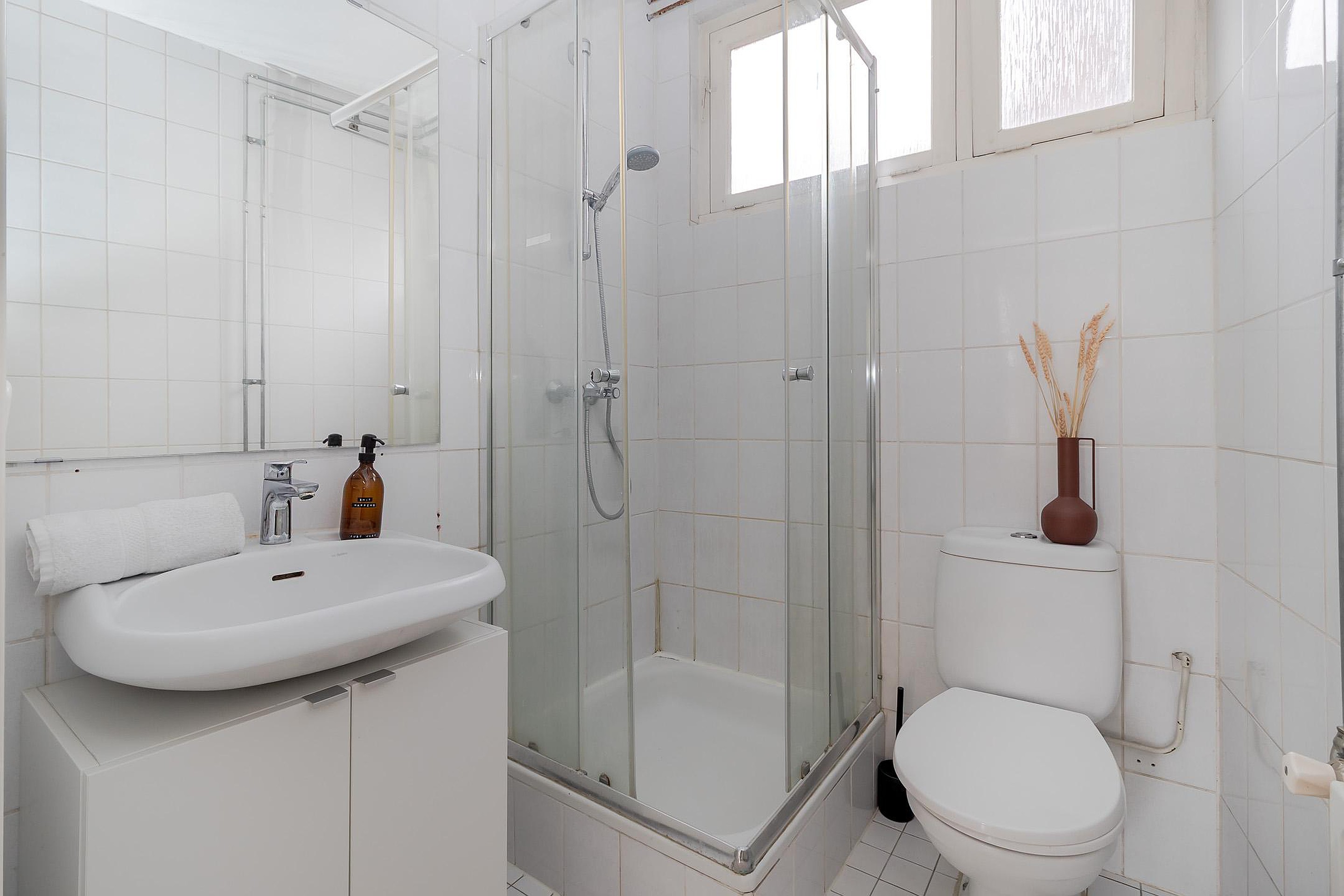 De eenvoudige badkamer (3m2) met daglichttoetreding is geheel betegeld en uitgerust met een douchecabine, wastafelmeubel en een staand toilet.