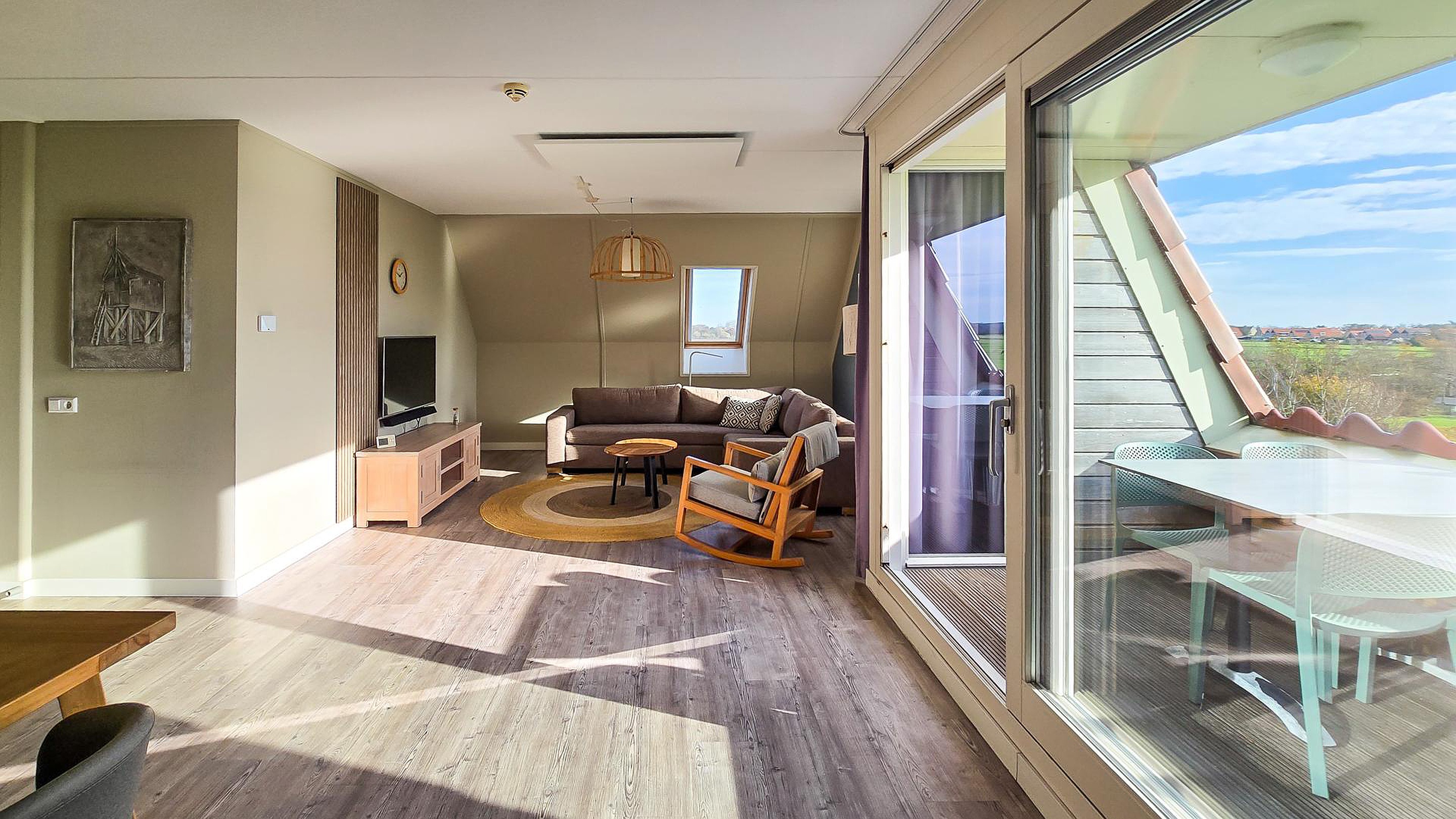 TE KOOP: Uniek 4-persoons appartement in Résidence Terschelling met prachtig uitzicht over het polderlandschap en het dorpje Midsland.