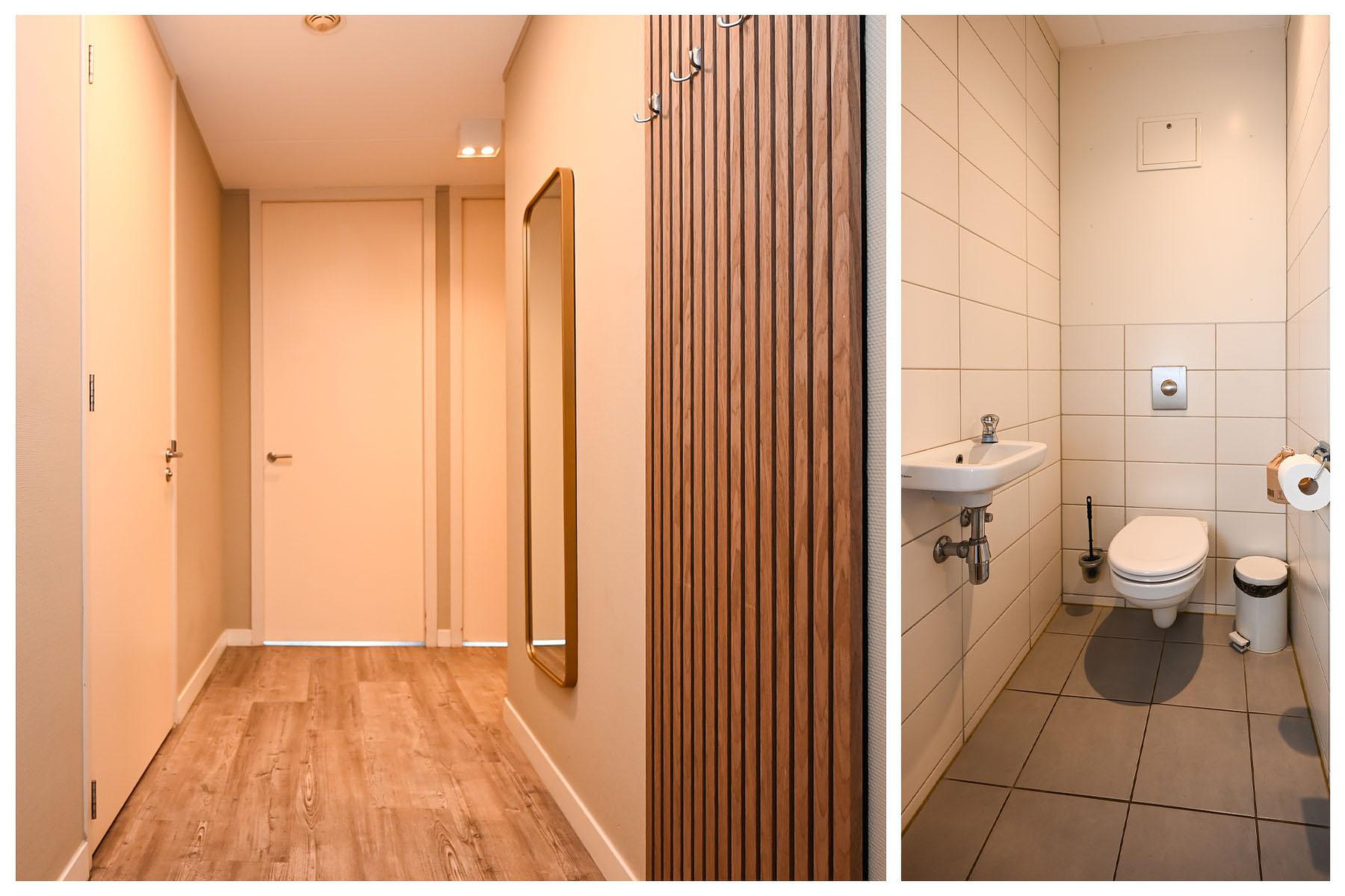 Middels de entree betreedt u het appartement in de hal. De hal biedt toegang tot de twee slaapkamers, badkamer, toilet, bergkast en de woonkamer. De woonkamer beschikt over een open keuken en de toegang naar het inpandige balkon (loggia).