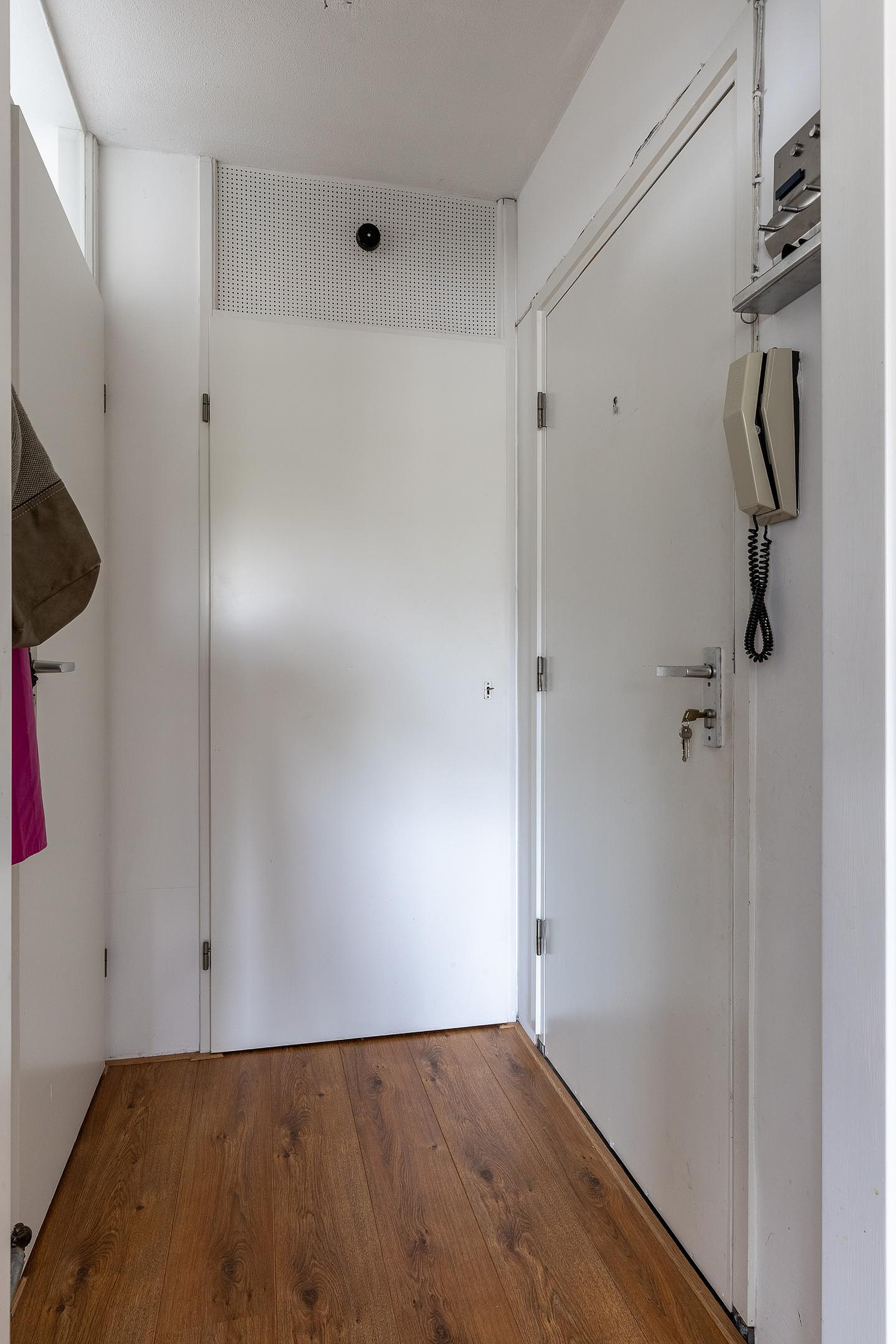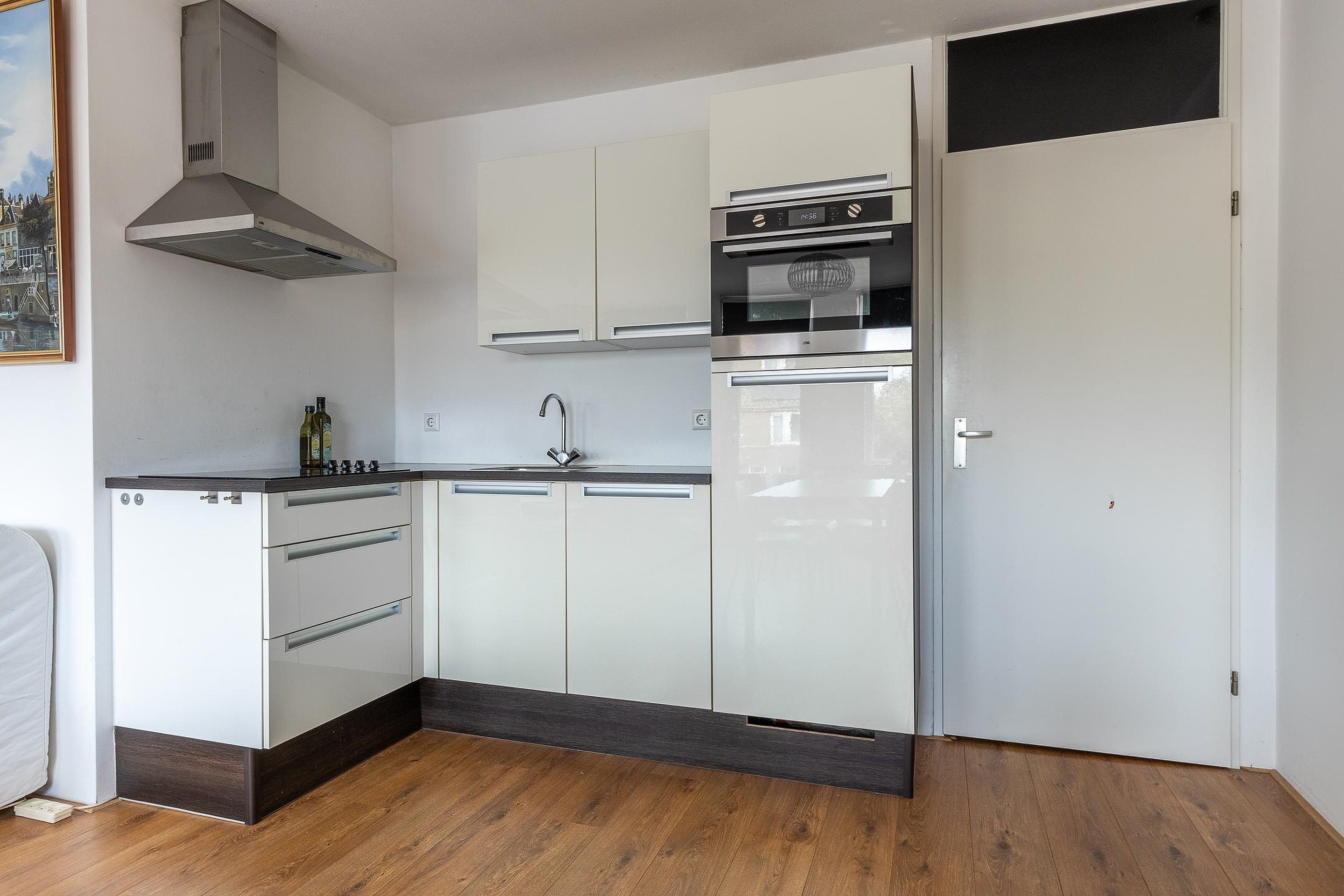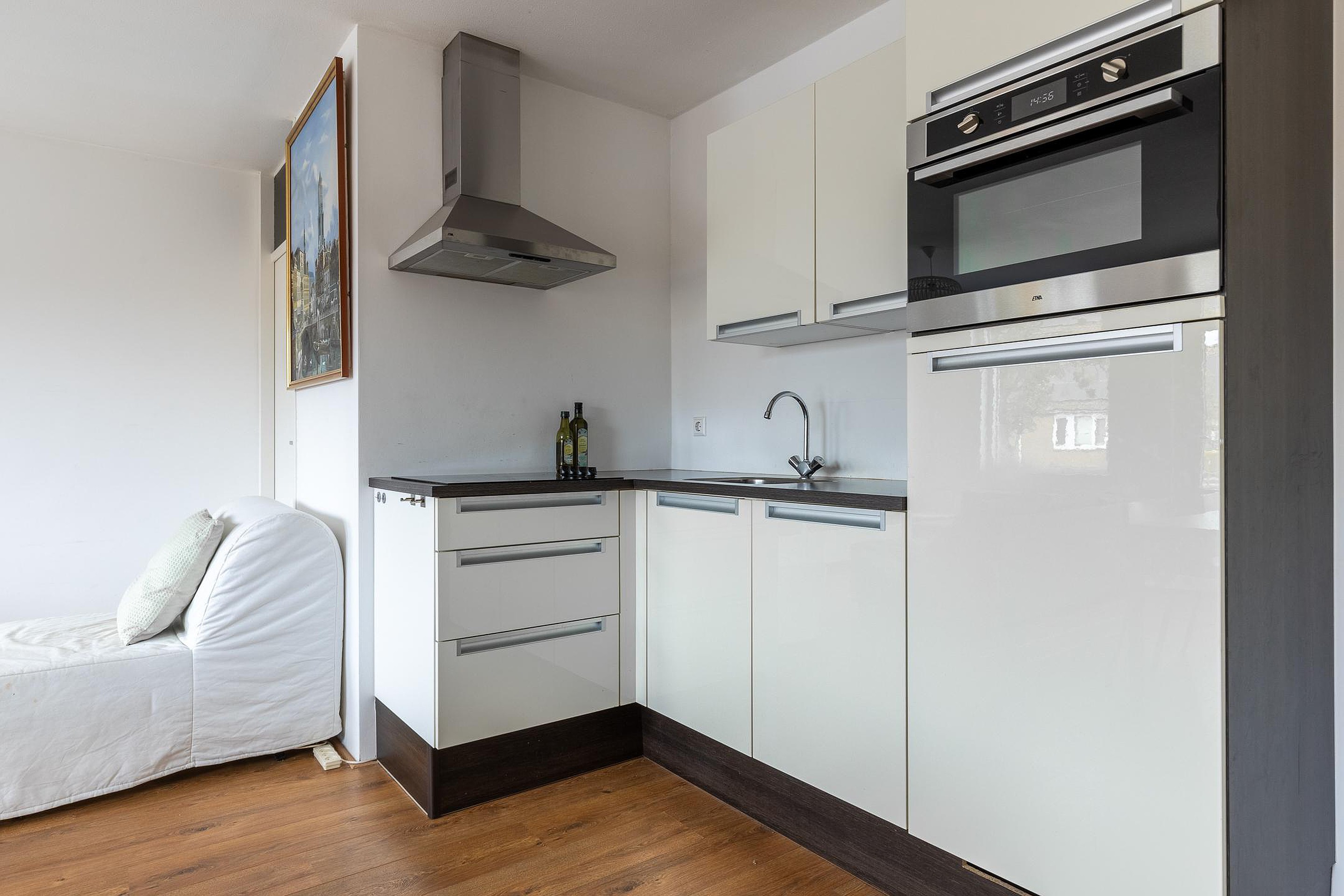 Entree, hal met meterkast, badkamer met douche, wastafel, toilet, wasmachineaansluiting en geiser voor warm water. Woonkamer met Frans balkon en moderne, open keuken in neutrale kleurstelling met koelkast, combi-magnetron, keramische kookplaat en afzuigkap. Er is ruimte over om eenvoudig een vaatwasser aan te sluiten. Via de woonkamer is de slaapkamer te bereiken.