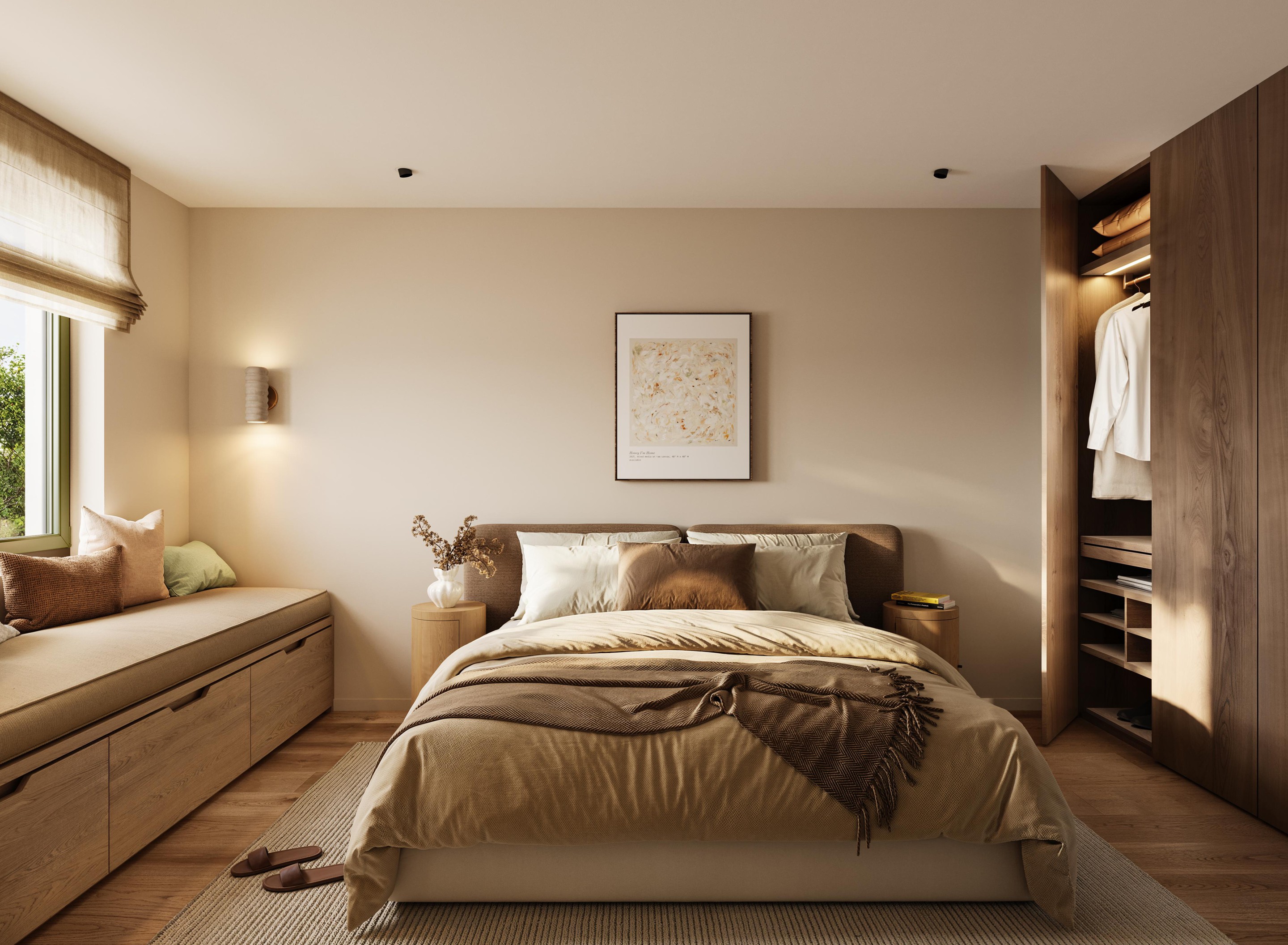 De twee-laagse terrasappartementen combineren de voordelen van een appartement met de ruimte van een woning. Beneden ligt de leefruimte, met grote raampartijen en een schuifpui naar het woningbrede terras. Boven is de slaapverdieping met twee slaapkamers en een royale dakkapel in de hoofdslaapkamer aan de zonzijde. Zo voelt het dagelijks leven rustig, licht en overzichtelijk.