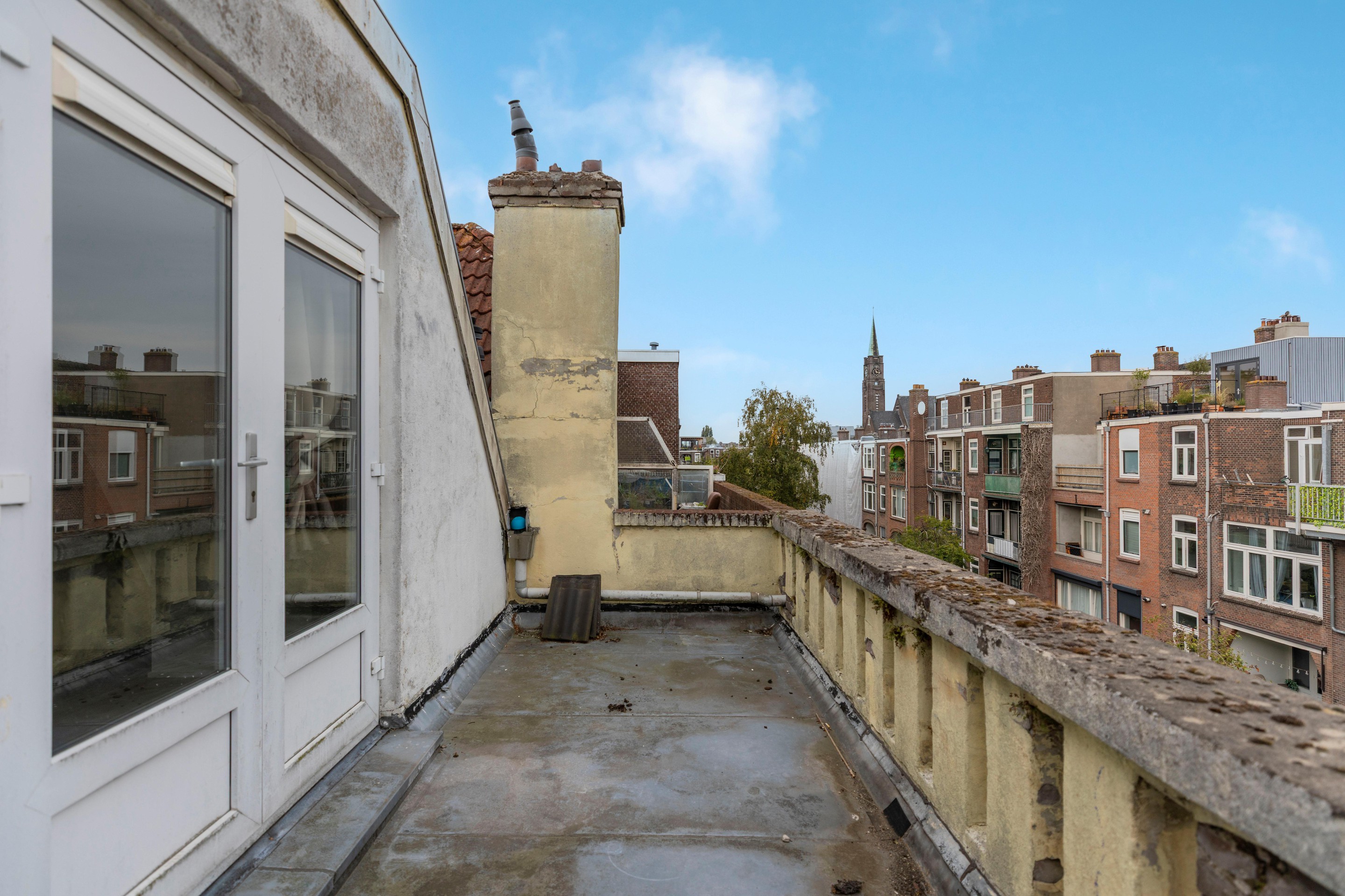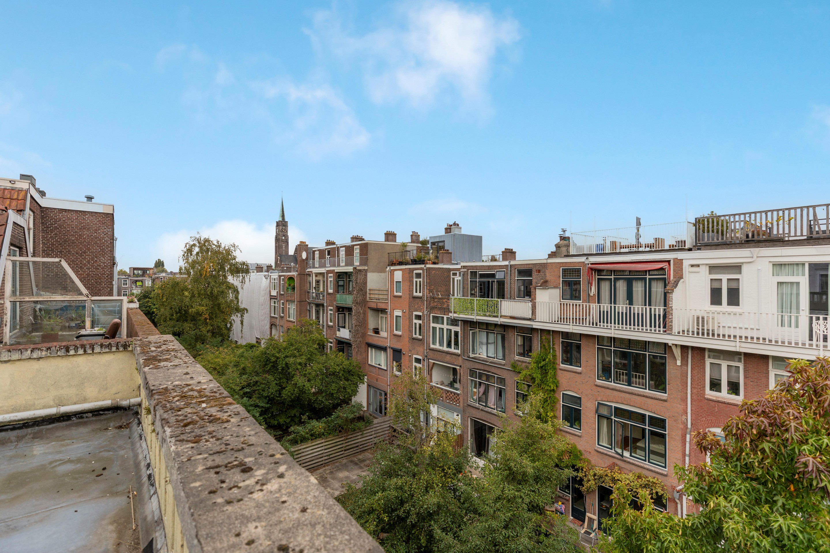 Beide slaapkamers zijn royaal van formaat en voelen comfortabel aan. De slaapkamer aan de achterzijde geeft toegang tot het dakterras, gelegen op het noordwesten. Een heerlijke buitenruimte met uitzicht over de binnentuinen.
