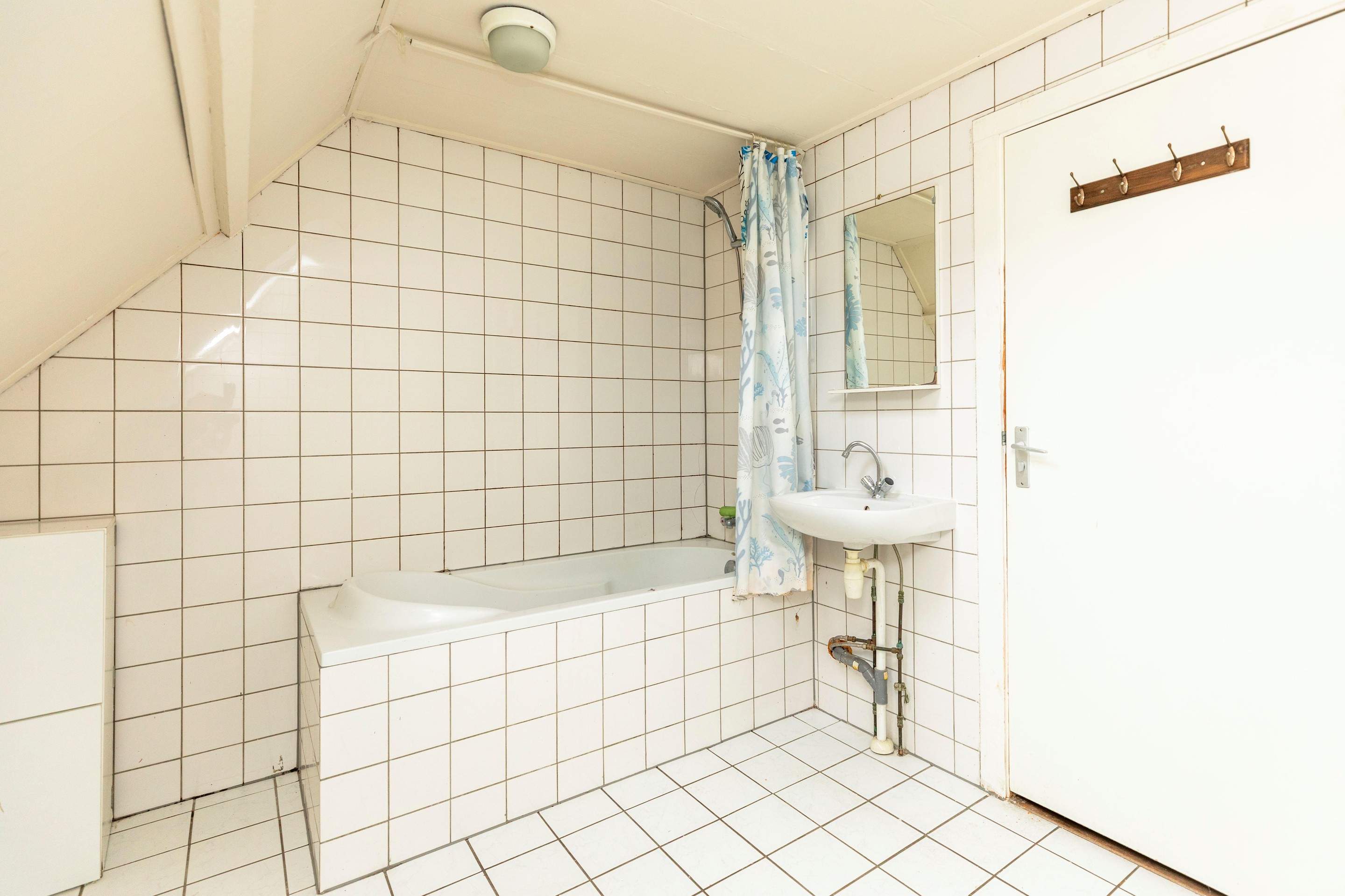 Op deze verdieping is ook de eerste, compacte badkamer gesitueerd. Deze is praktisch ingericht en voorzien van een inloopdouche en wastafel. Het toilet is separaat.