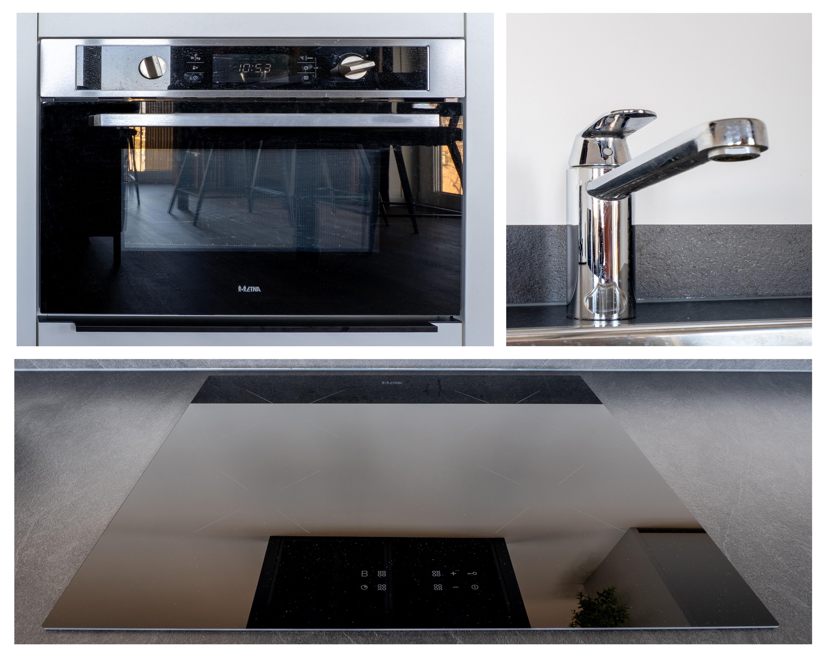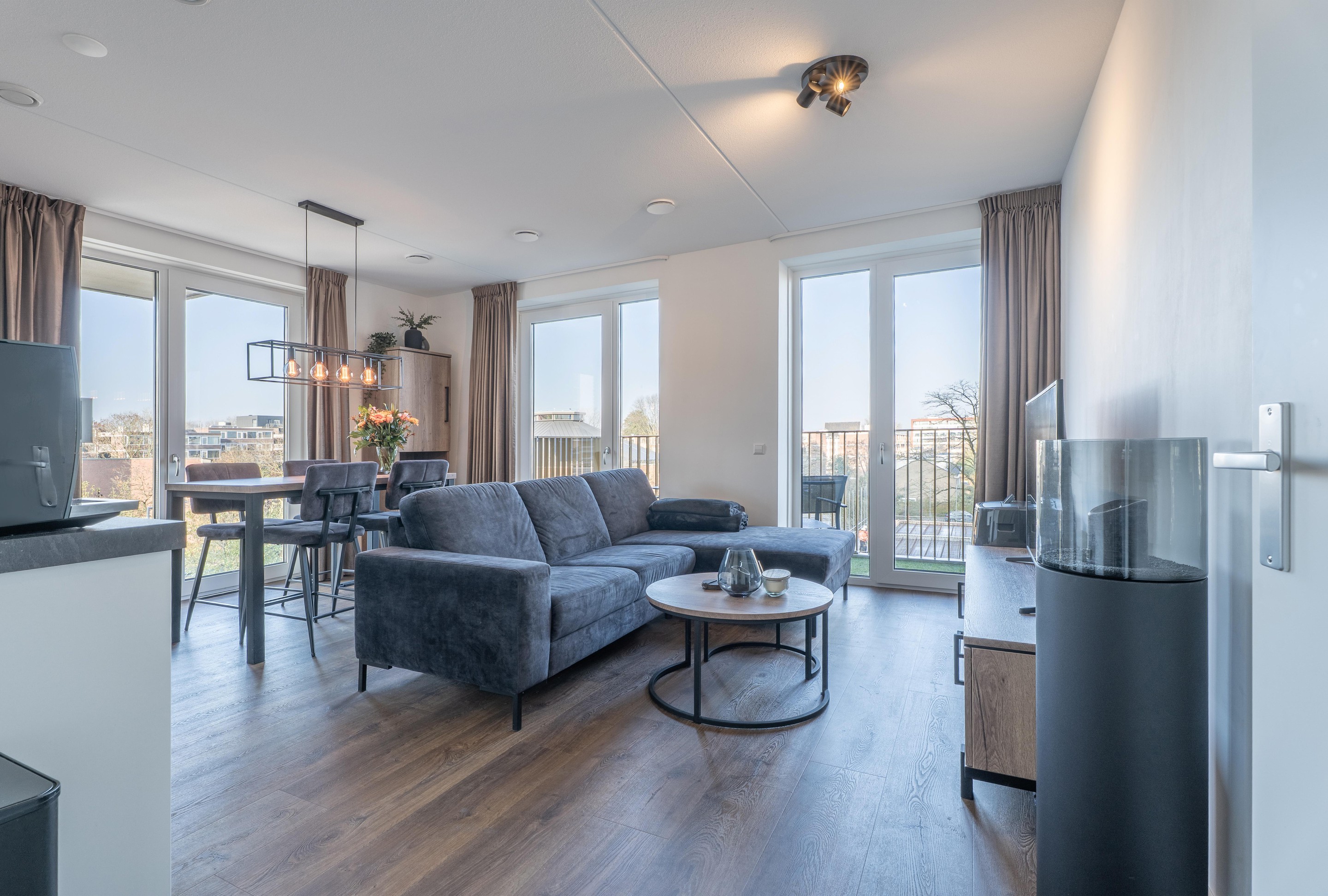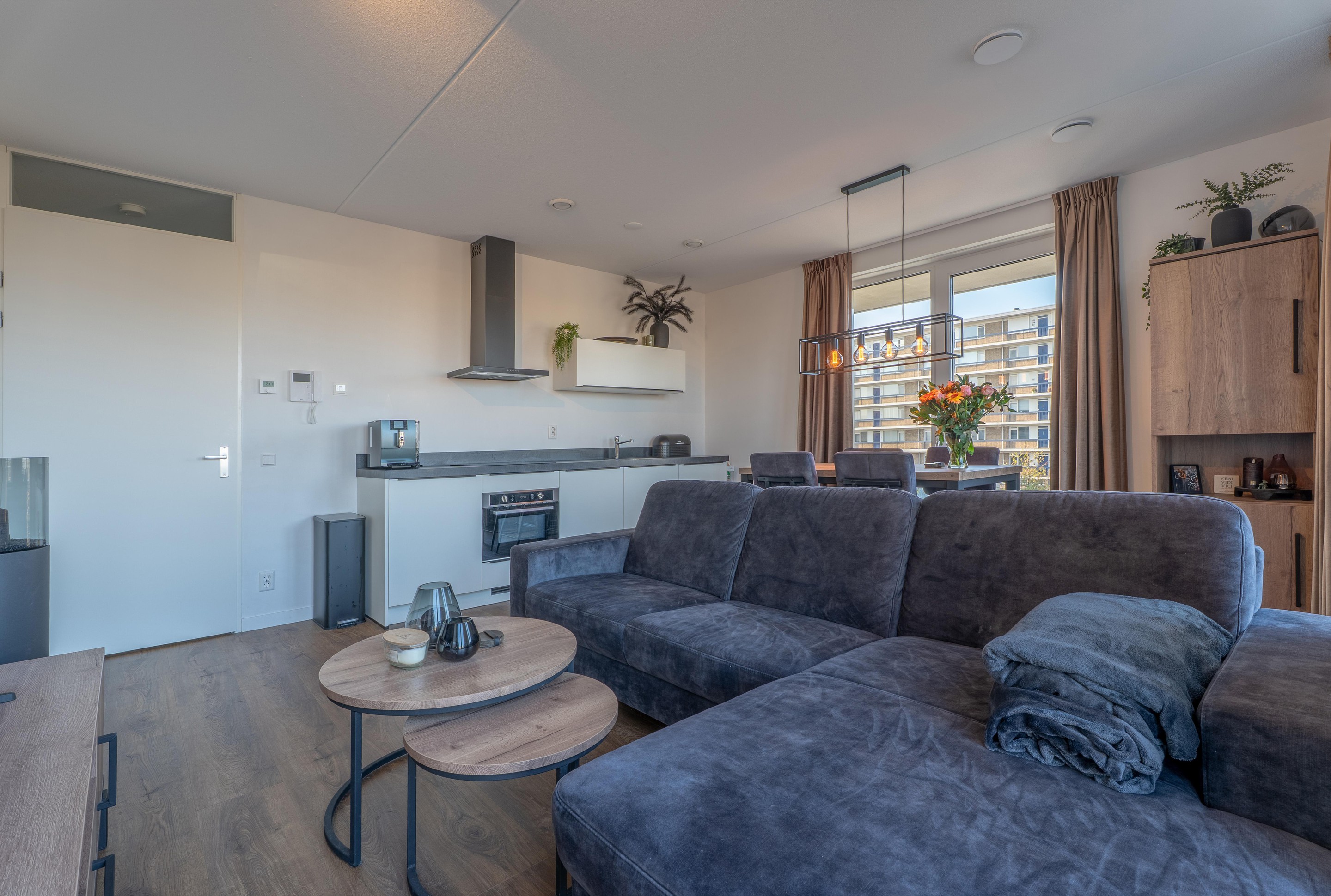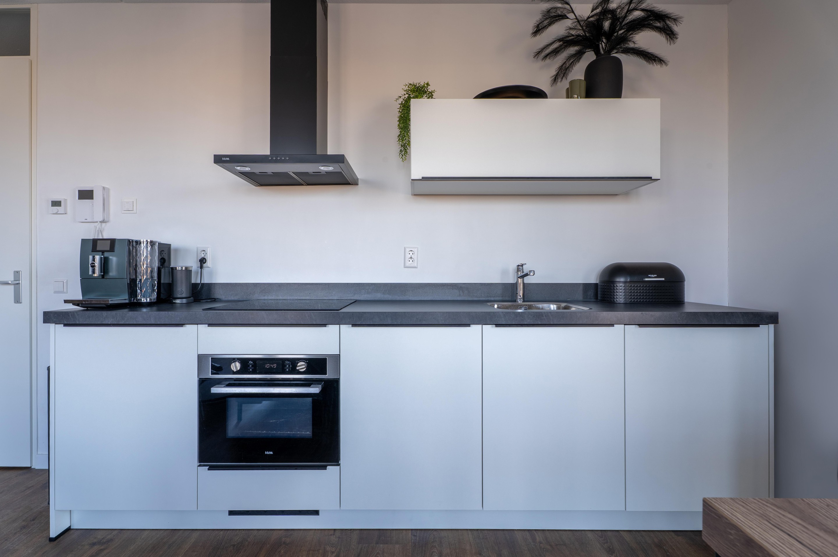 De woonkamer en open keuken vormen een moderne, lichte leefruimte. Dankzij de grote raampartijen geniet je van veel daglicht. De keuken is strak uitgevoerd en voorzien van inbouwapparatuur zoals inductiekookplaat, koelkast/vriezer, combimagnetron en vaatwasser.