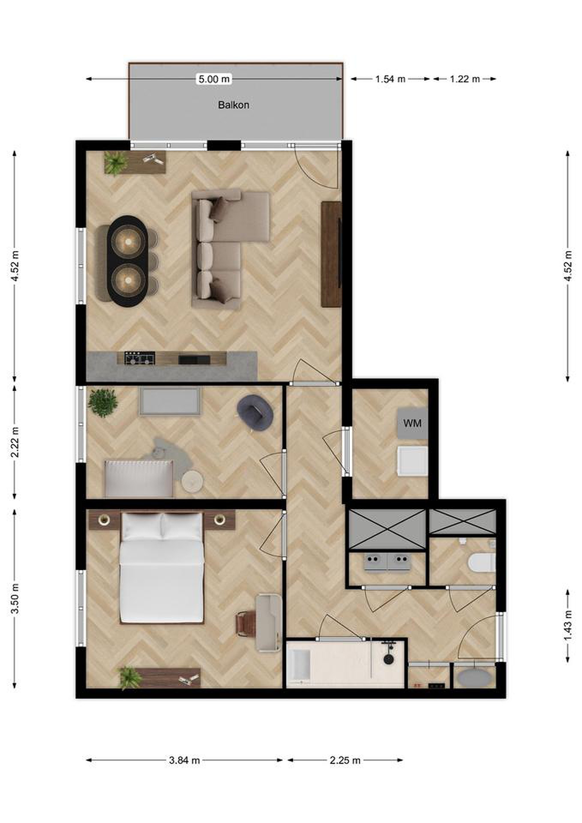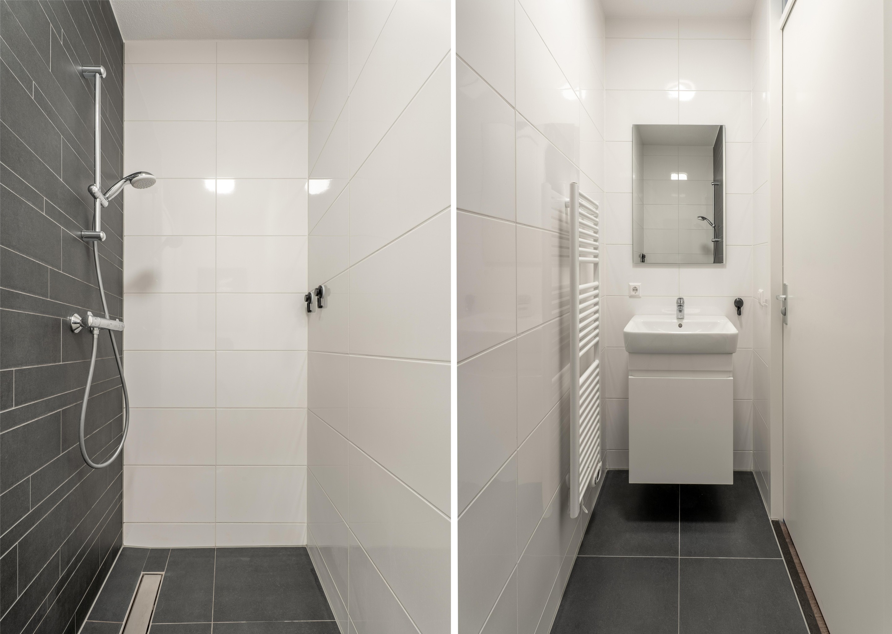 Via de woonkamer stap je het balkon op. De badkamer is voorzien van een inloopdouche, wastafelmeubel en mechanische ventilatie. Het toilet is separaat en bereikbaar vanuit de hal.