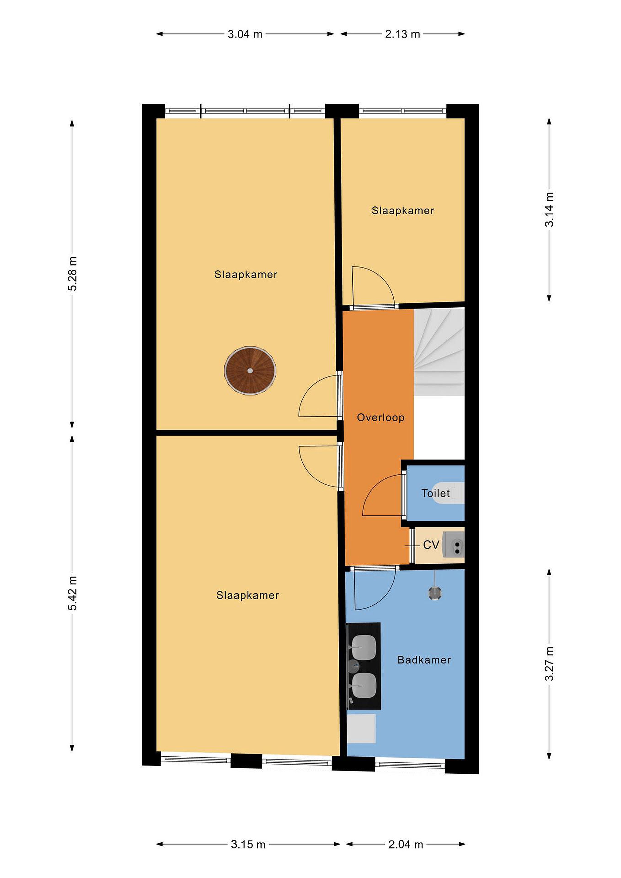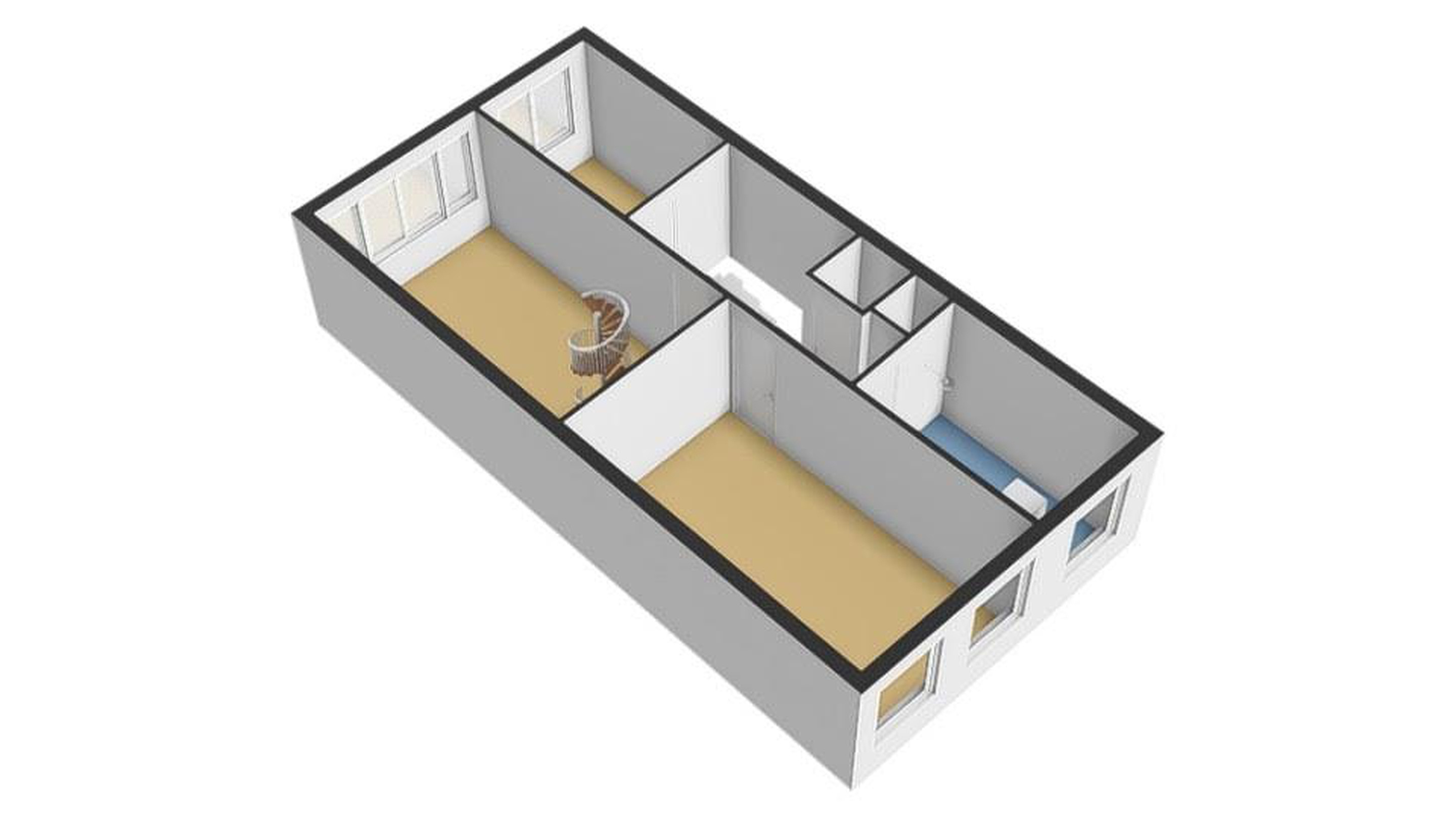 Aan de voorkant en aan de achterkant liggen de ruime slaapkamers. De kamers zijn ruim voor een groot 2-persoons bed en kasten. De kamer aan de achterzijde heeft een wenteltrap die toegang biedt tot het dakluik naar het dakterras. Goed om te weten is dat de kamer groot genoeg is om een wandje te plaatsen, zodat de toegang tot het dakterras zich niet in de slaapkamer bevindt.