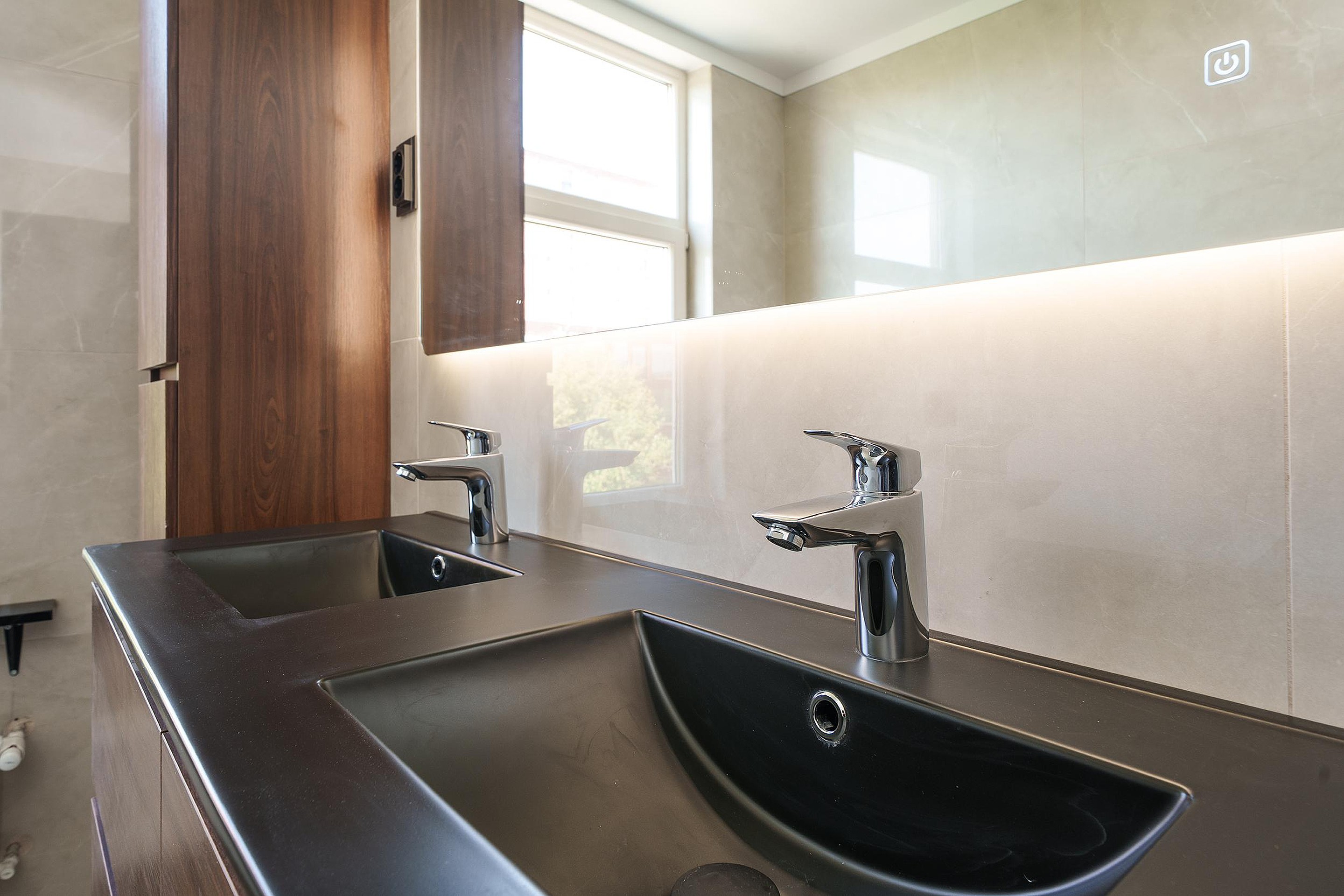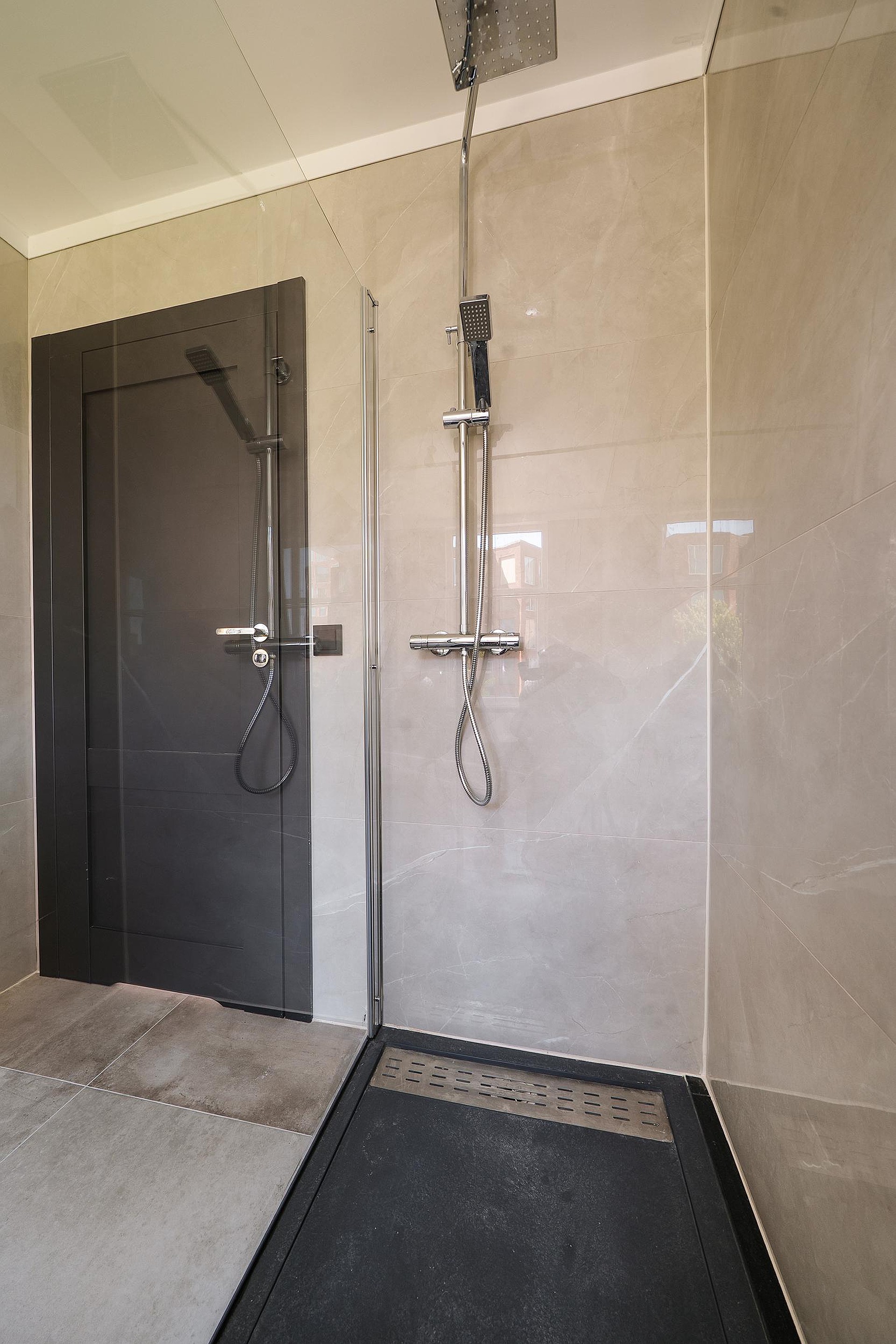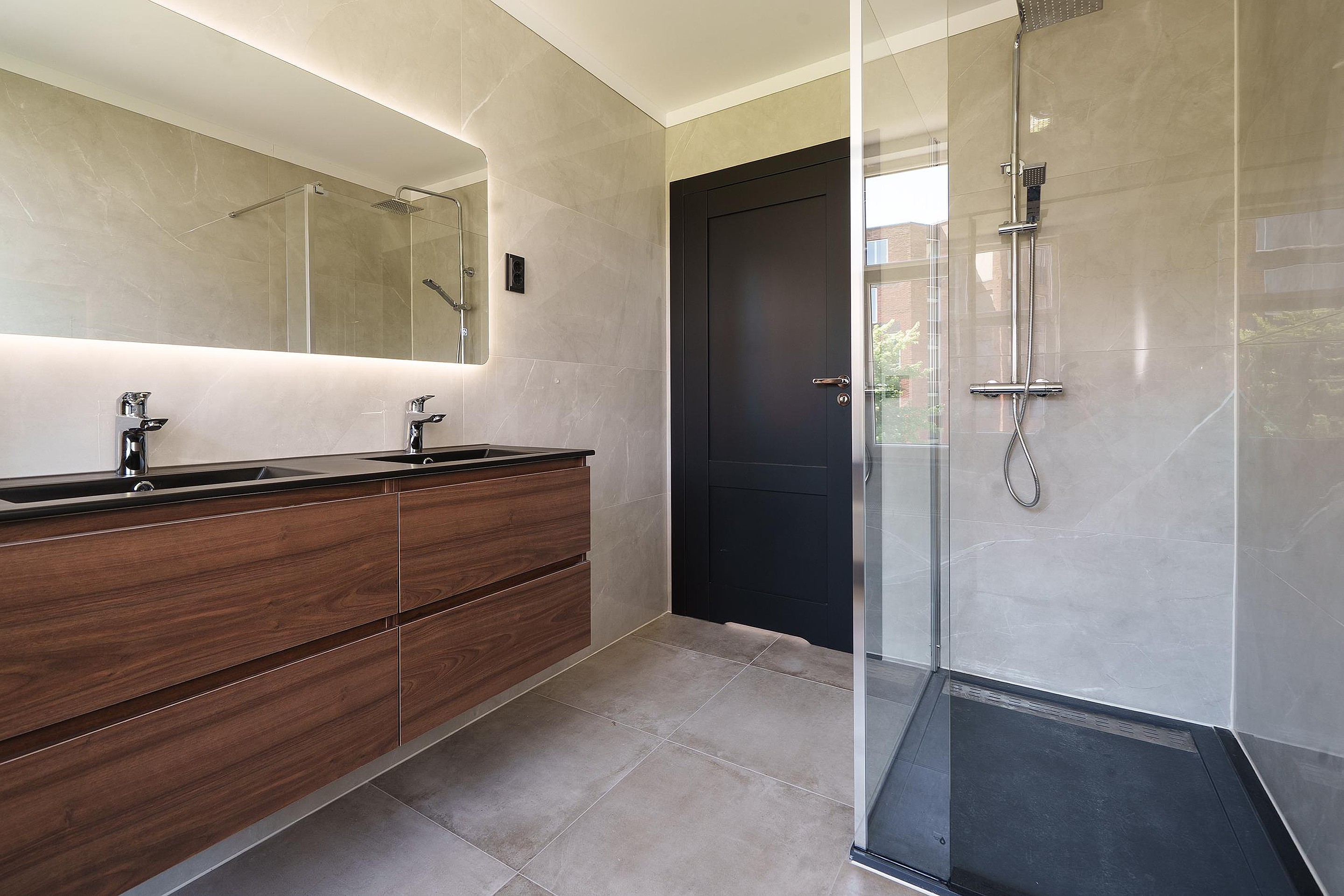 De moderne badkamer straalt rust en comfort uit en is voorzien van een inloopdouche, dubbele wastafel met meubel en een dakraam. De beige wand- en vloertegels geven een rustige, maar luxe sfeer.