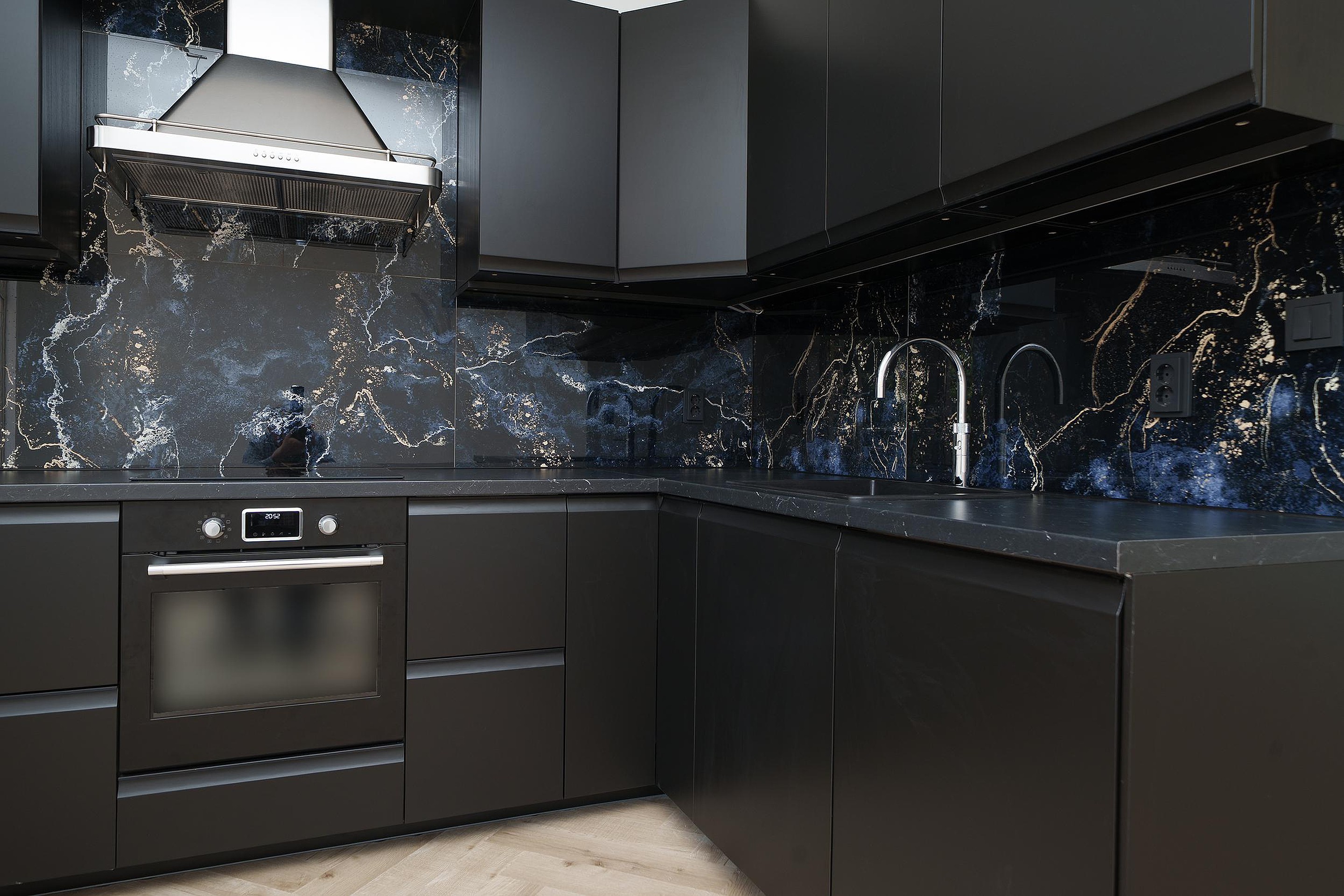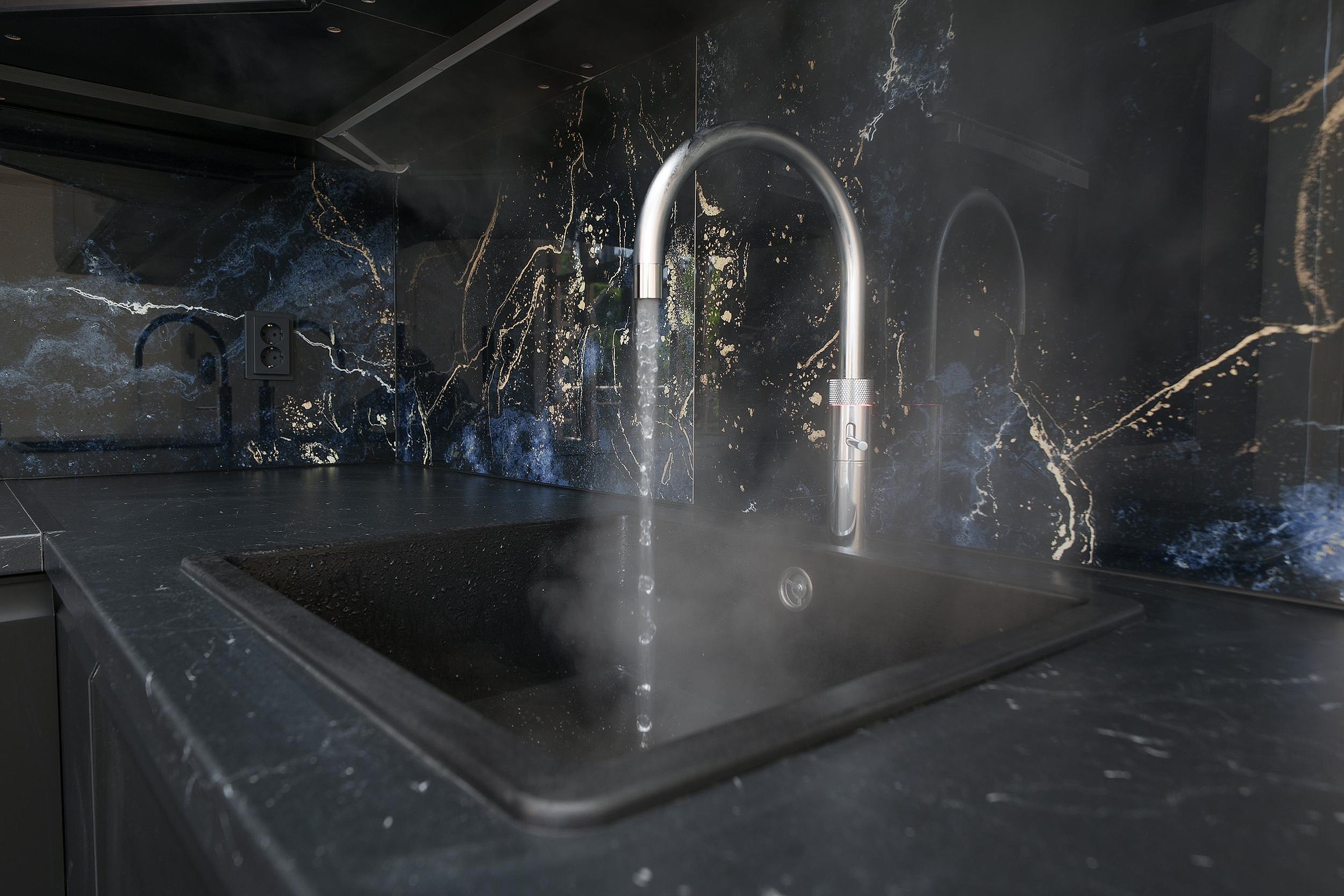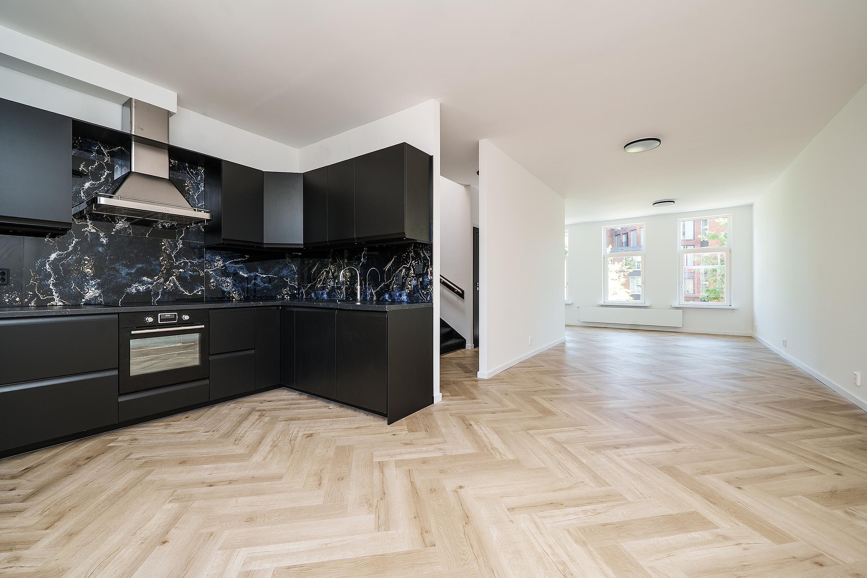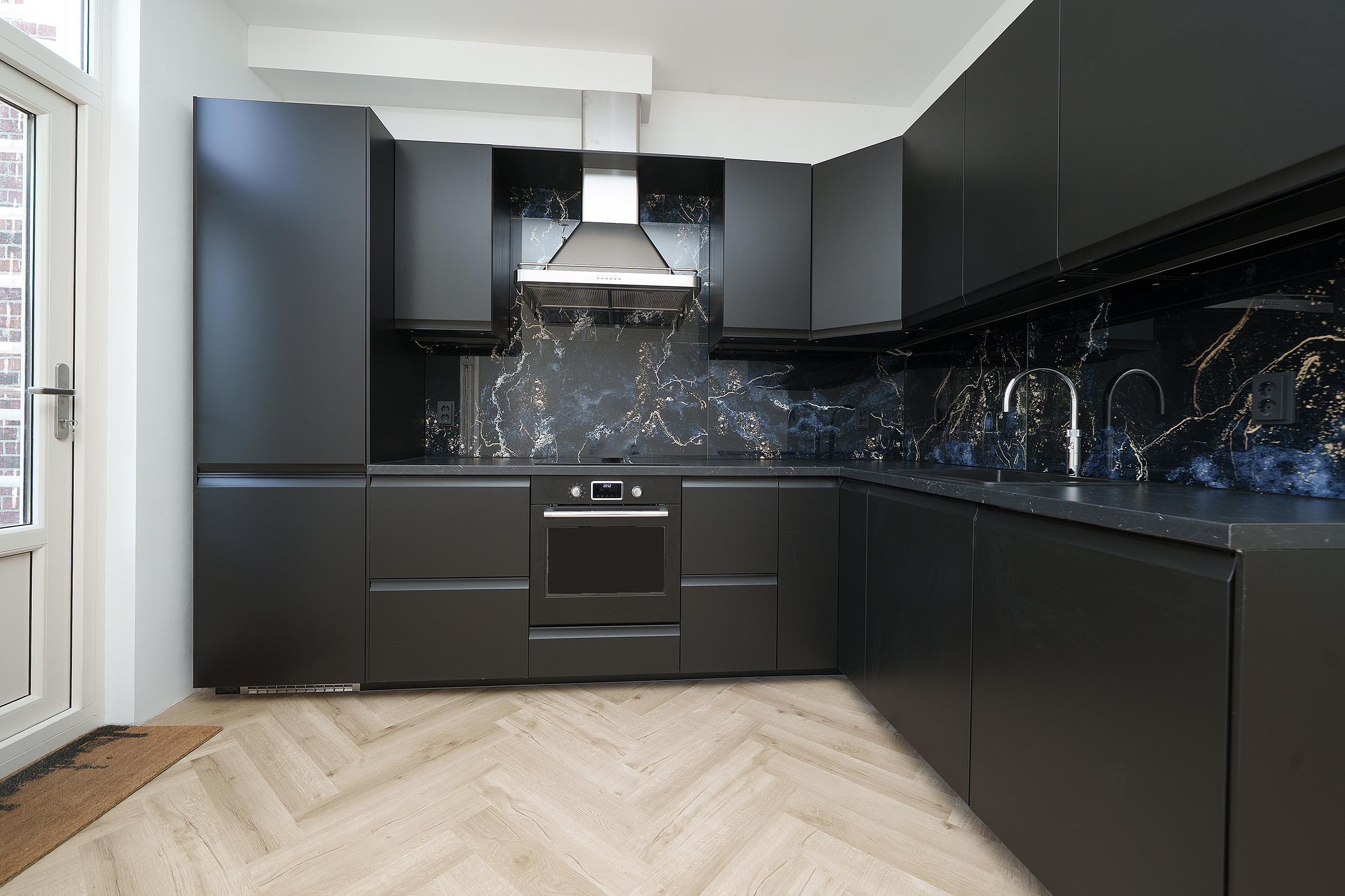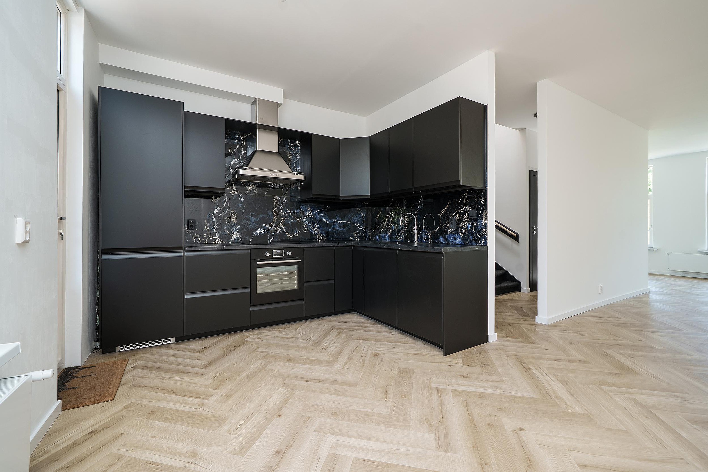 De doorzon woonkamer in L-vorm biedt veel licht dankzij grote raampartijen aan zowel de voor- als achterkant. De half open keuken ligt aan de achterzijde en vormt met zijn luxe zwarte afwerking en inbouwapparatuur een echte eyecatcher. De keuken is voorzien van een Quooker, vaatwasser, koelkast, vriezer, oven en kookfornuis met afzuiginstallatie. Het natuursteenlook spatblad geeft de keuken een luxe uitstraling.